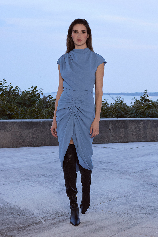 Soft crepe dress with a draped bodice and gathered waist that creates an easy, sculpted shape. Finished with a front slit for movement. A polished pick for dinners, showers, and dressed-up plans.