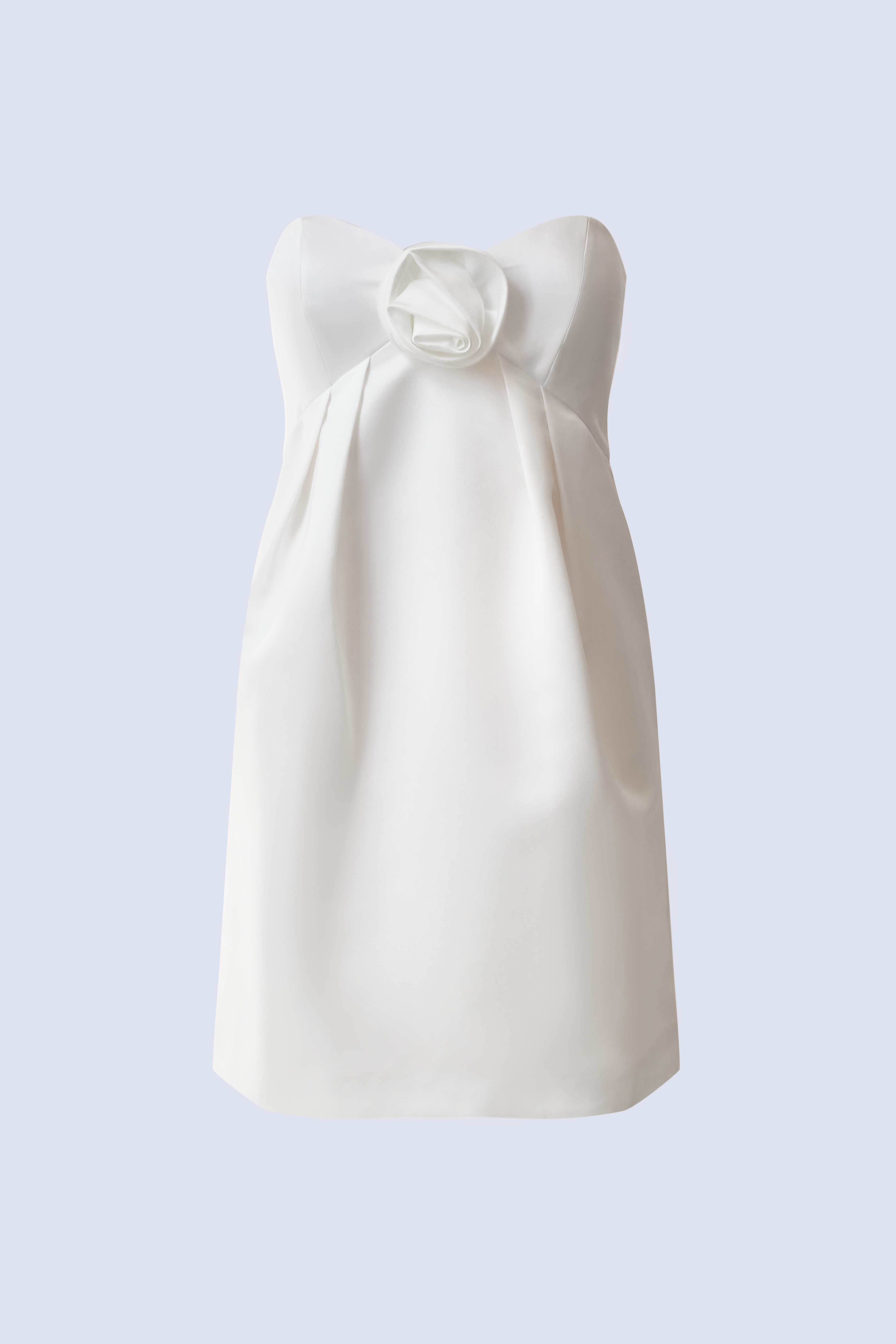 White satin mini with a sculpted bodice and a rosette detail that adds subtle dimension. Cut in a clean, structured shape that keeps the silhouette crisp. A polished pick for luminous nights out.