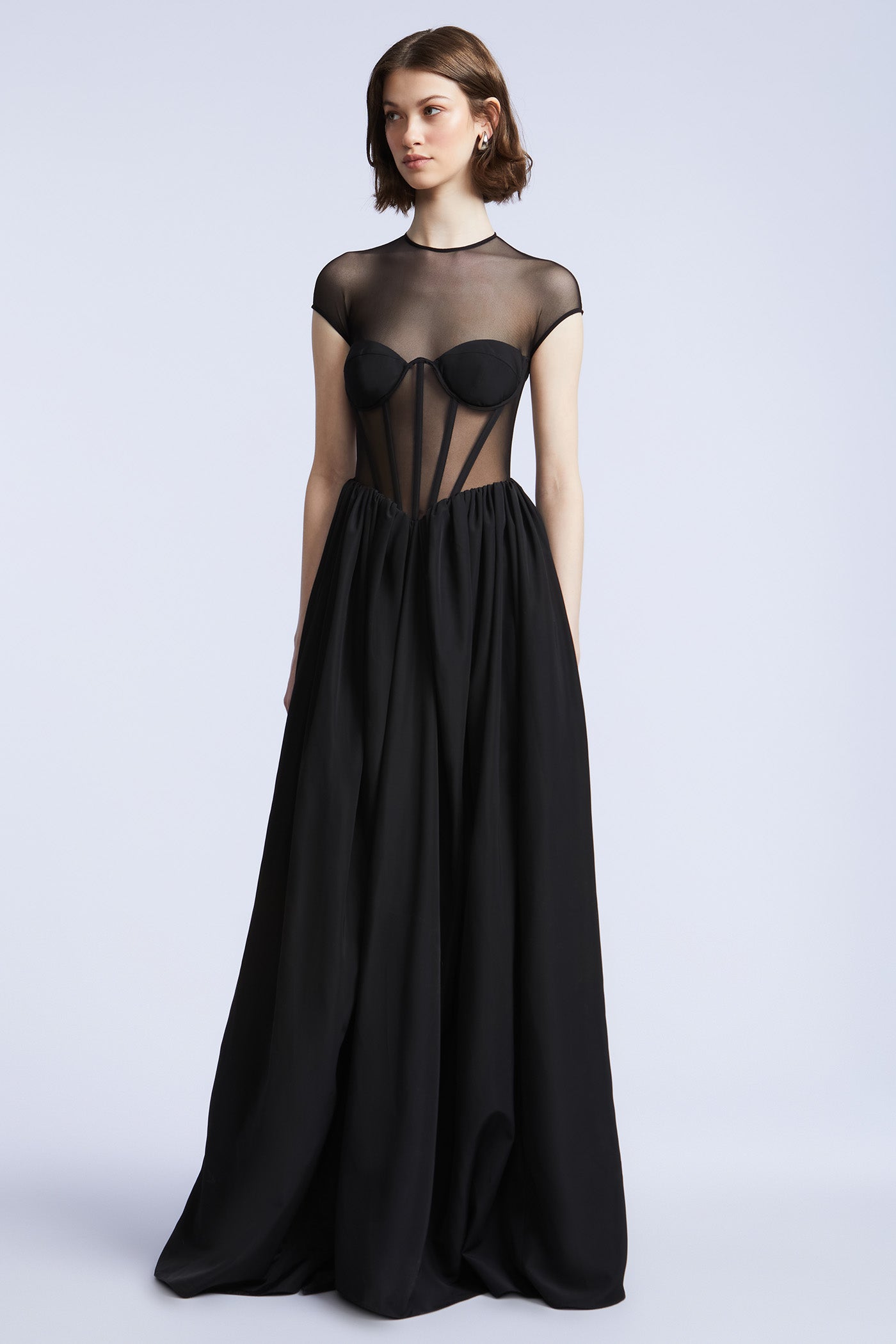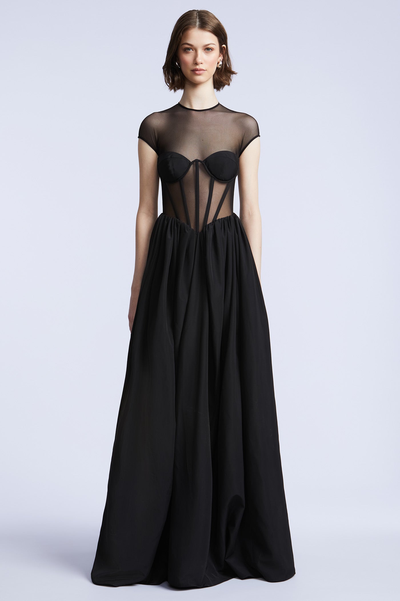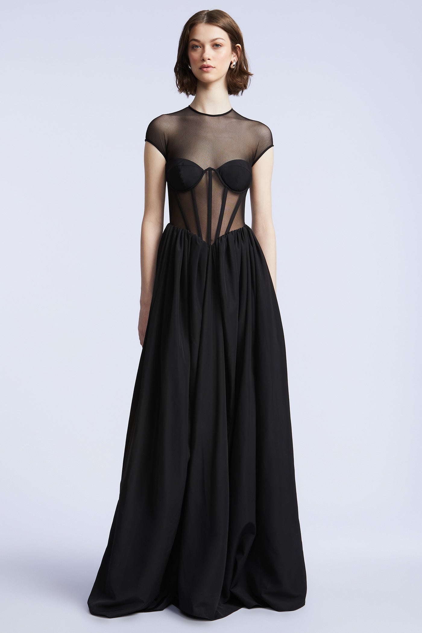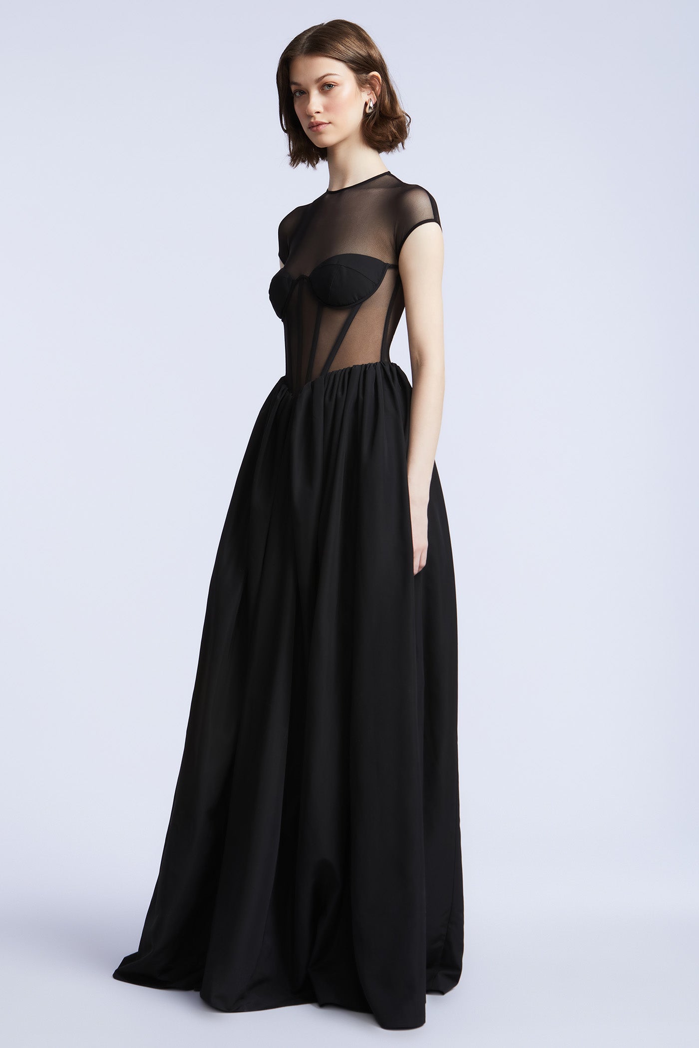 Mesh illusion gown with exposed corset-style bodice and built-in underwire cups. Designed with a gathered taffeta skirt for bold volume and contrast. A statement silhouette for black-tie events.