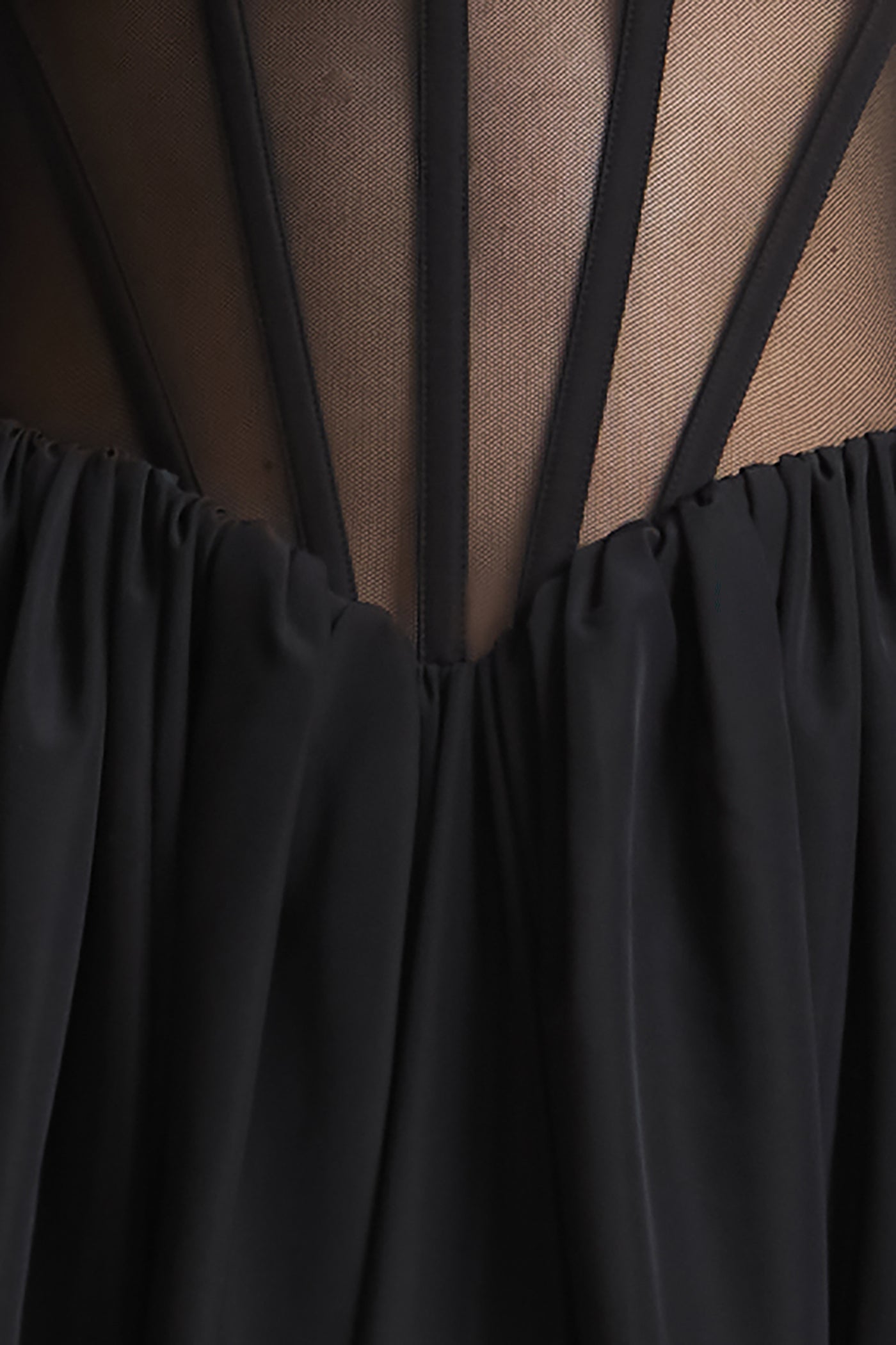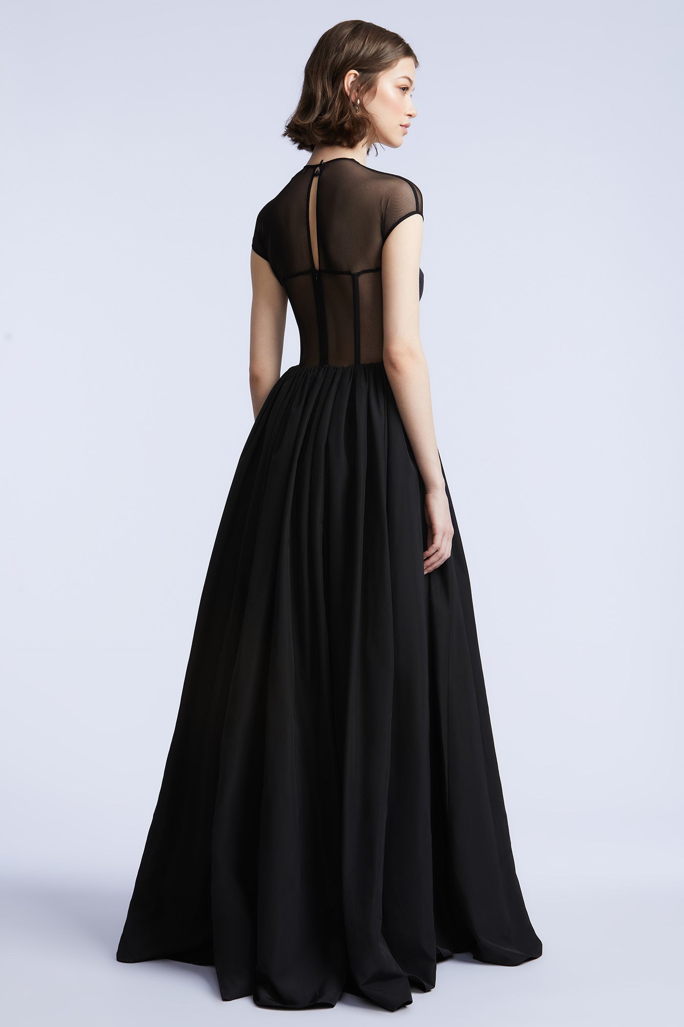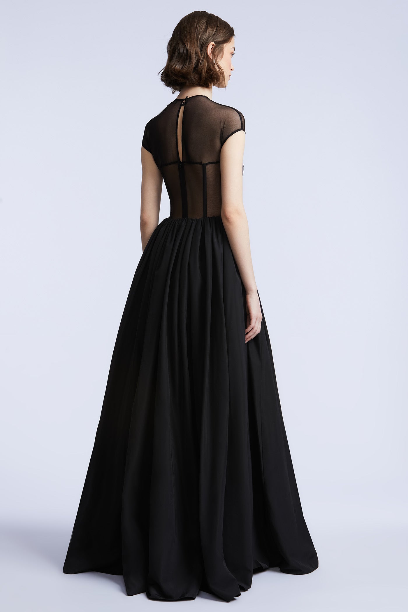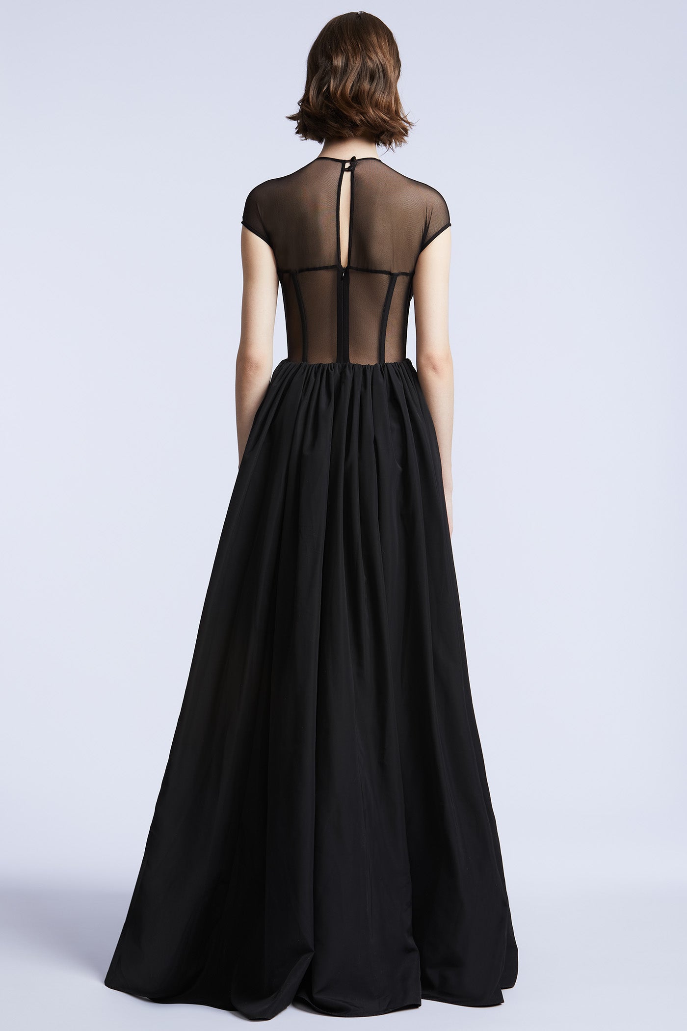 Mesh illusion gown with exposed corset-style bodice and built-in underwire cups. Designed with a gathered taffeta skirt for bold volume and contrast. A statement silhouette for black-tie events.