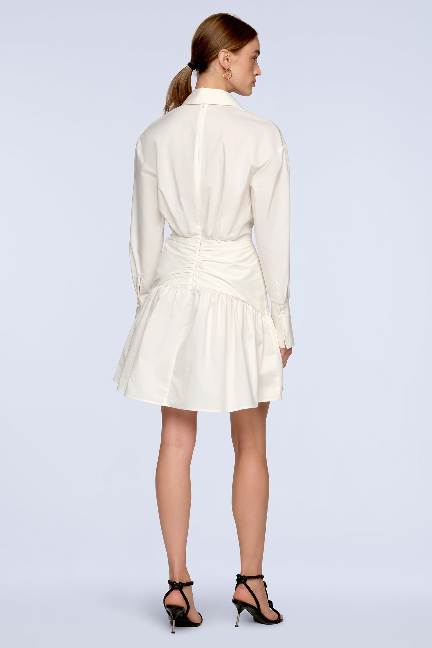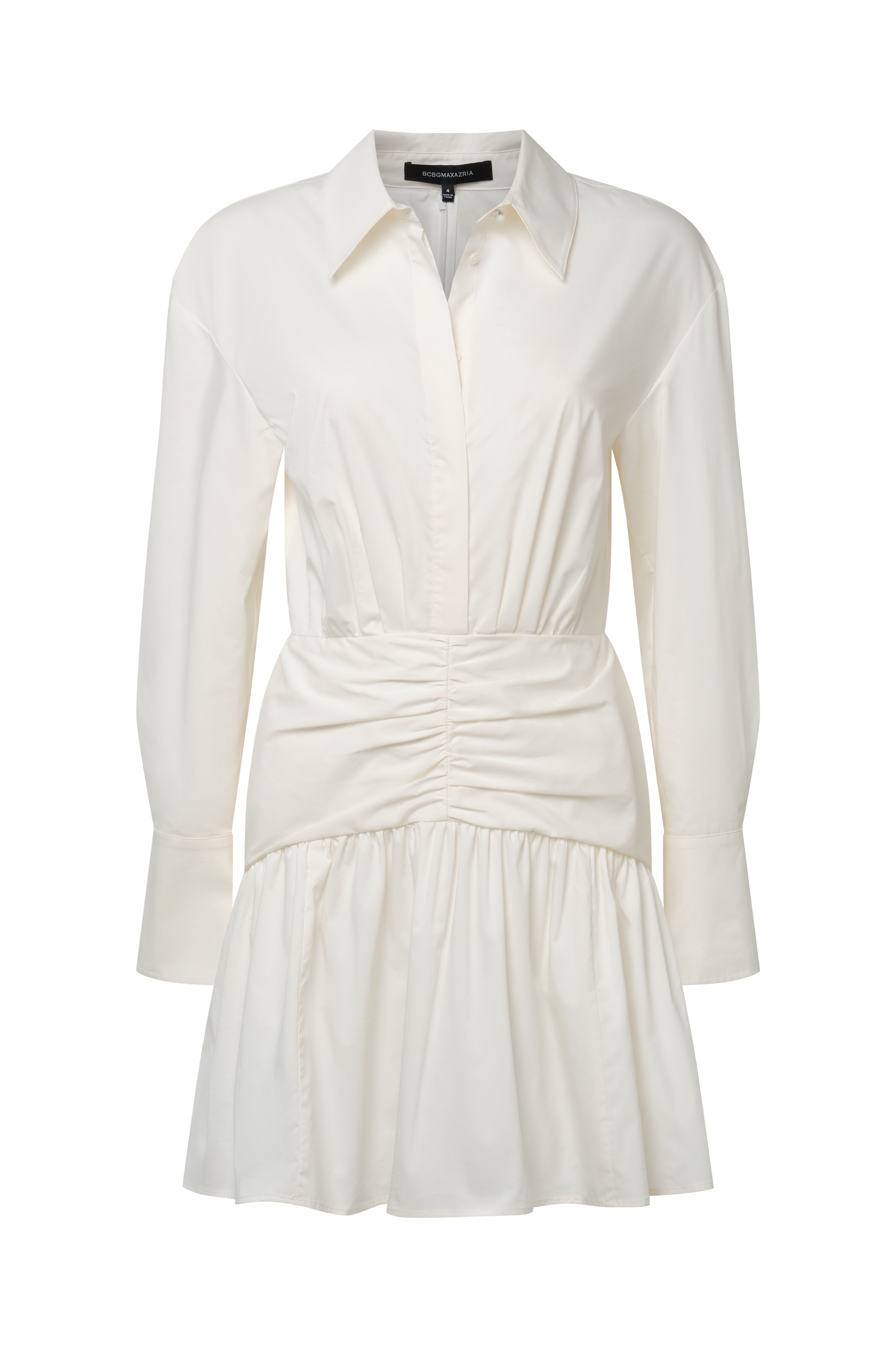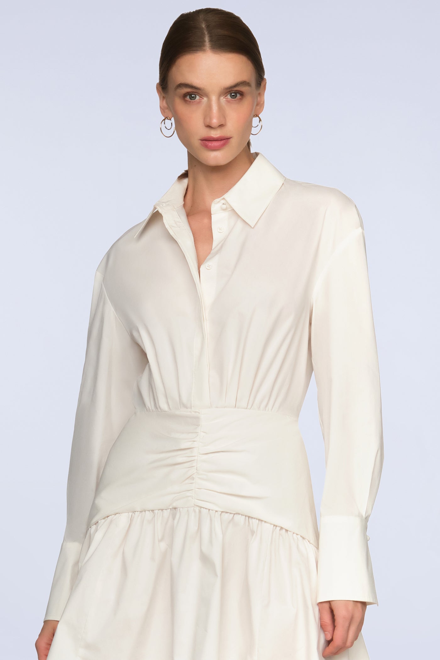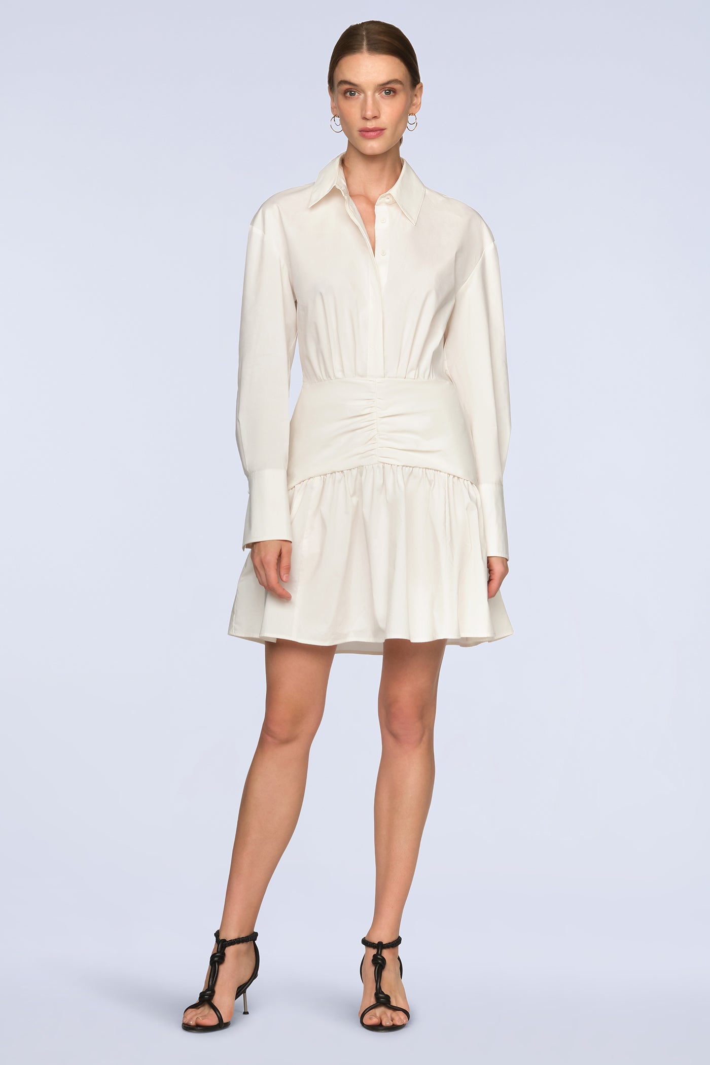 Crisp poplin dress with a softly tailored shirt bodice and a ruched waist that defines the shape. Finished with a flared skirt for easy movement. A polished pick for daytime plans, work lunches, and weekend events.