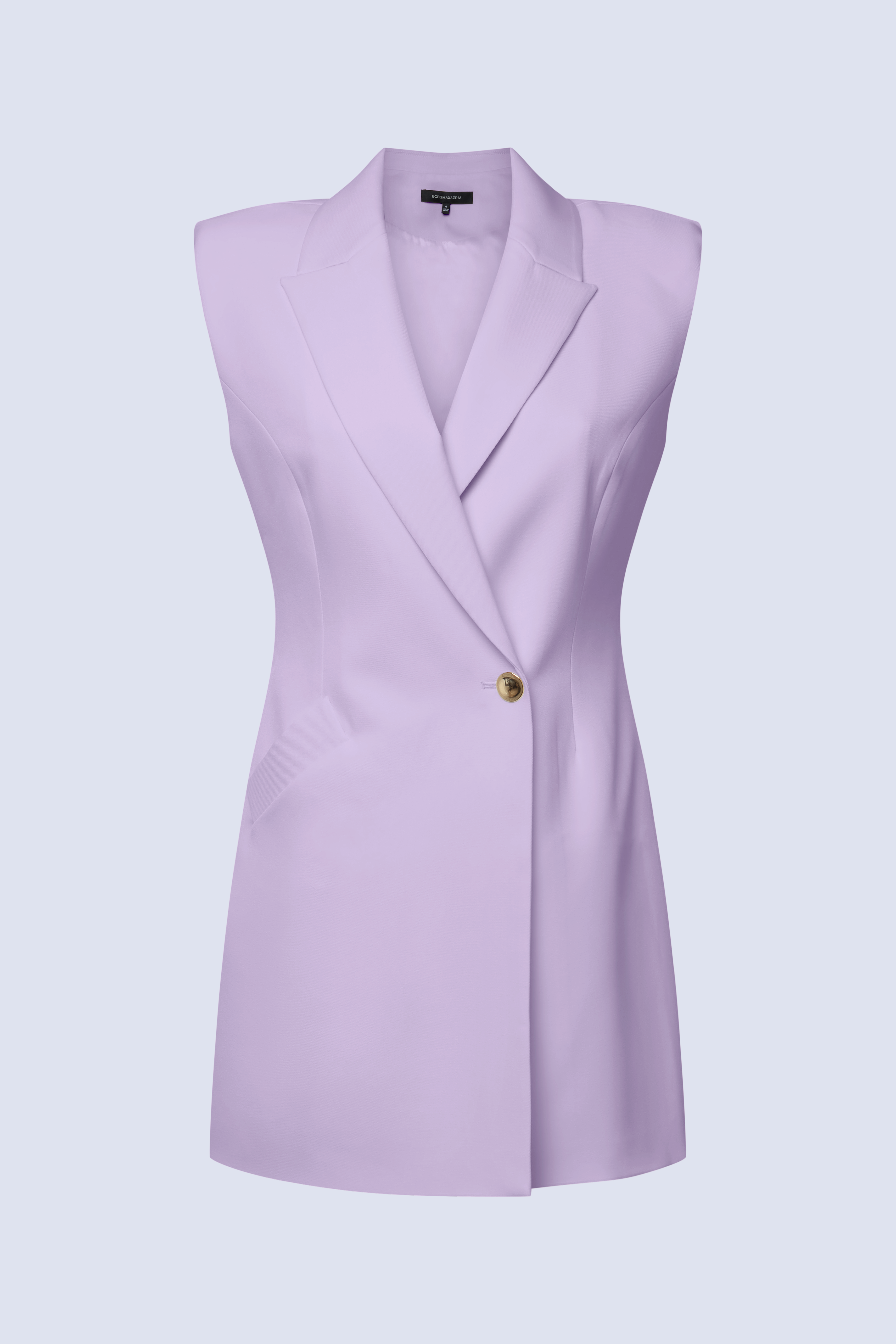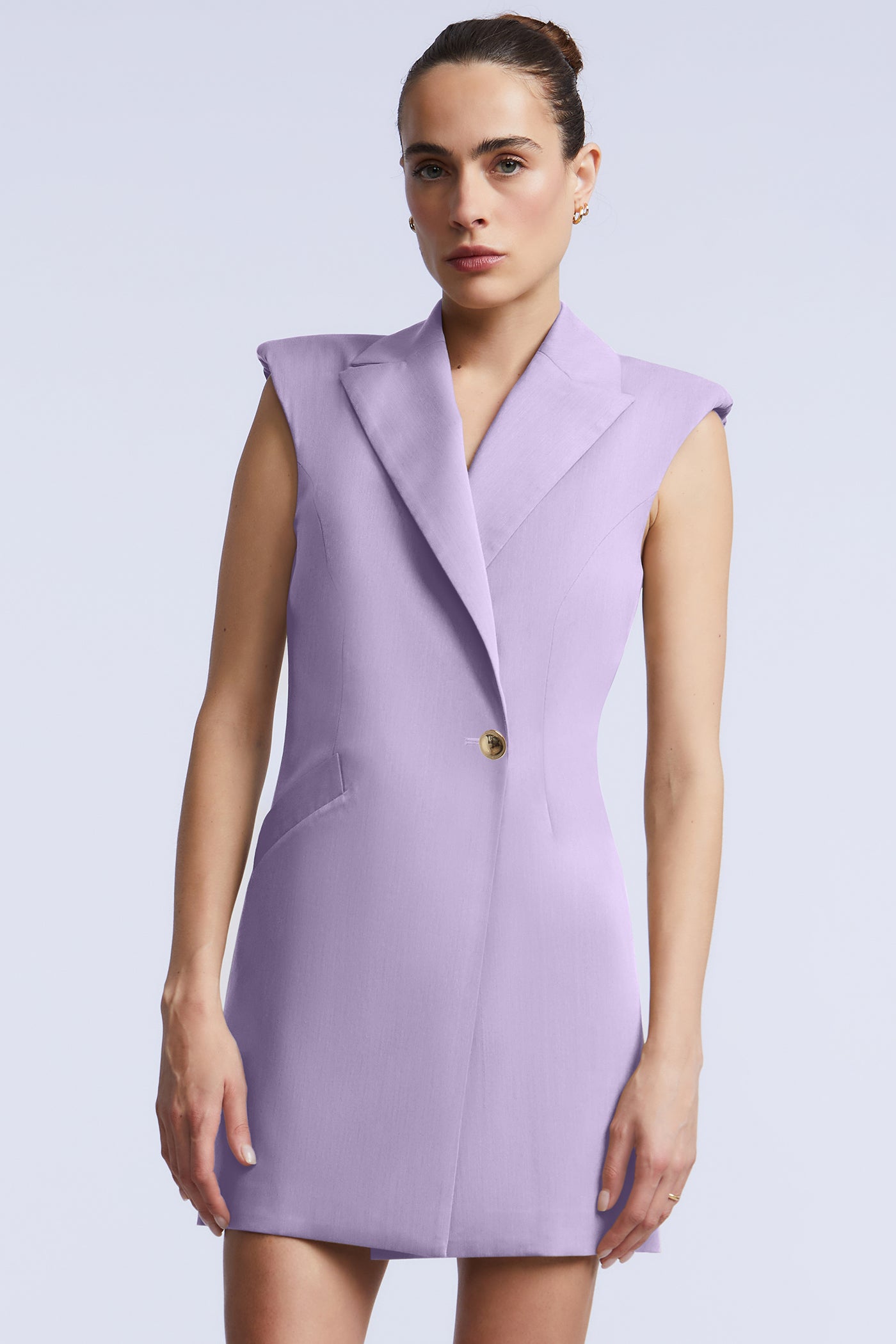 Sleeveless crepe blazer dress in a soft lilac tone, cut with sharp shoulders and a single gold button for polish. Tailored seaming defines the waist. A fresh, pulled-together look for work events and nights out.