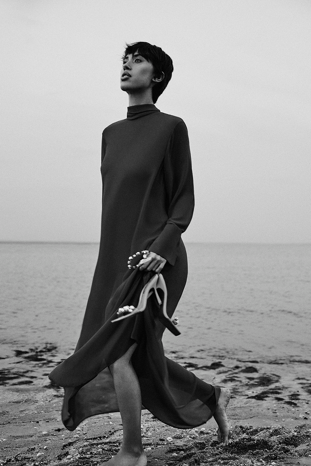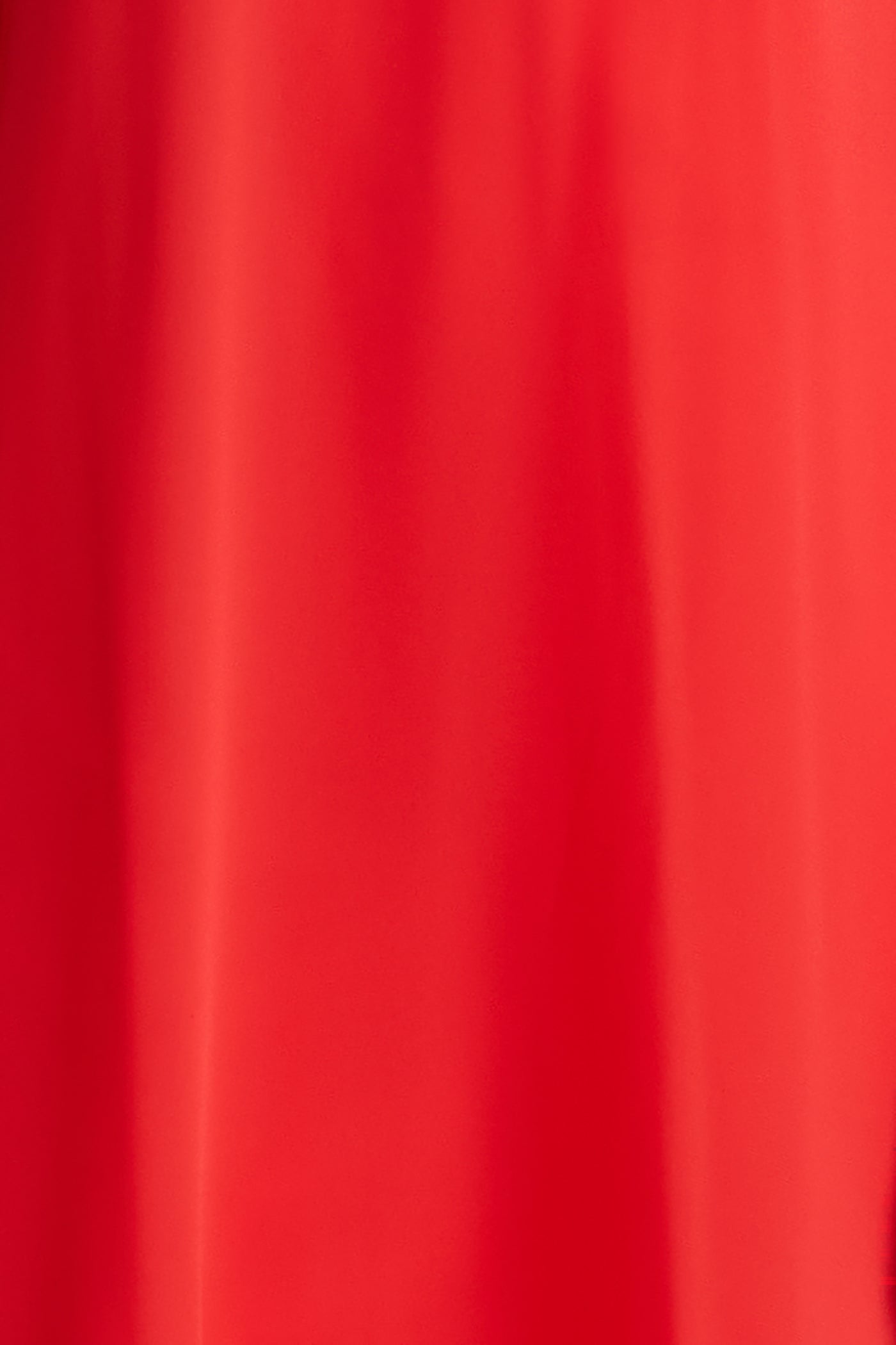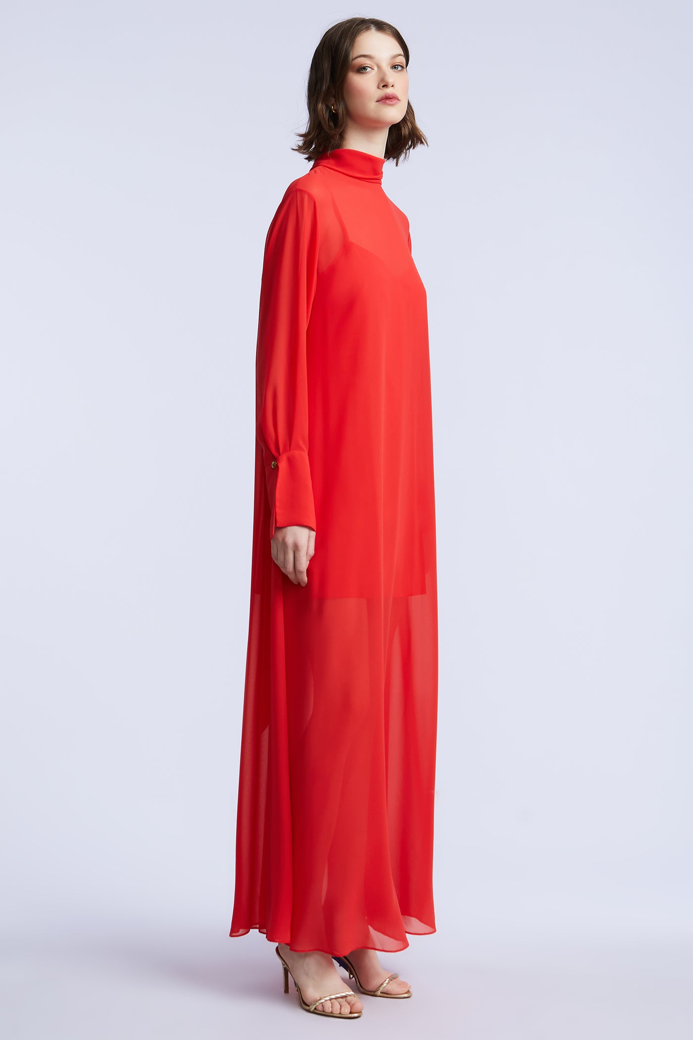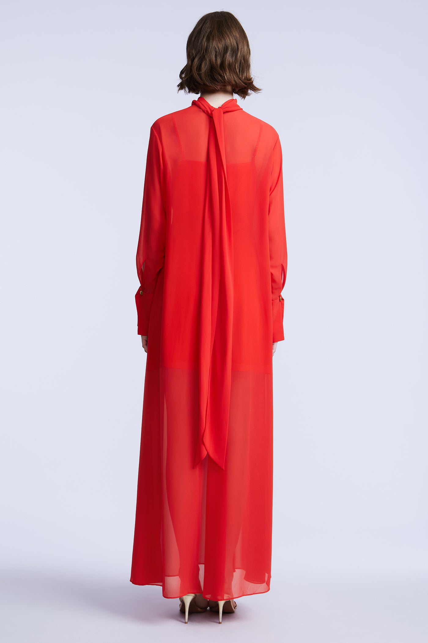 Sheer scarlet chiffon gown crafted with a fluid, weightless drape. Designed with soft translucence and elongated back ties that move with her. A refined statement for galas and low-lit interiors.