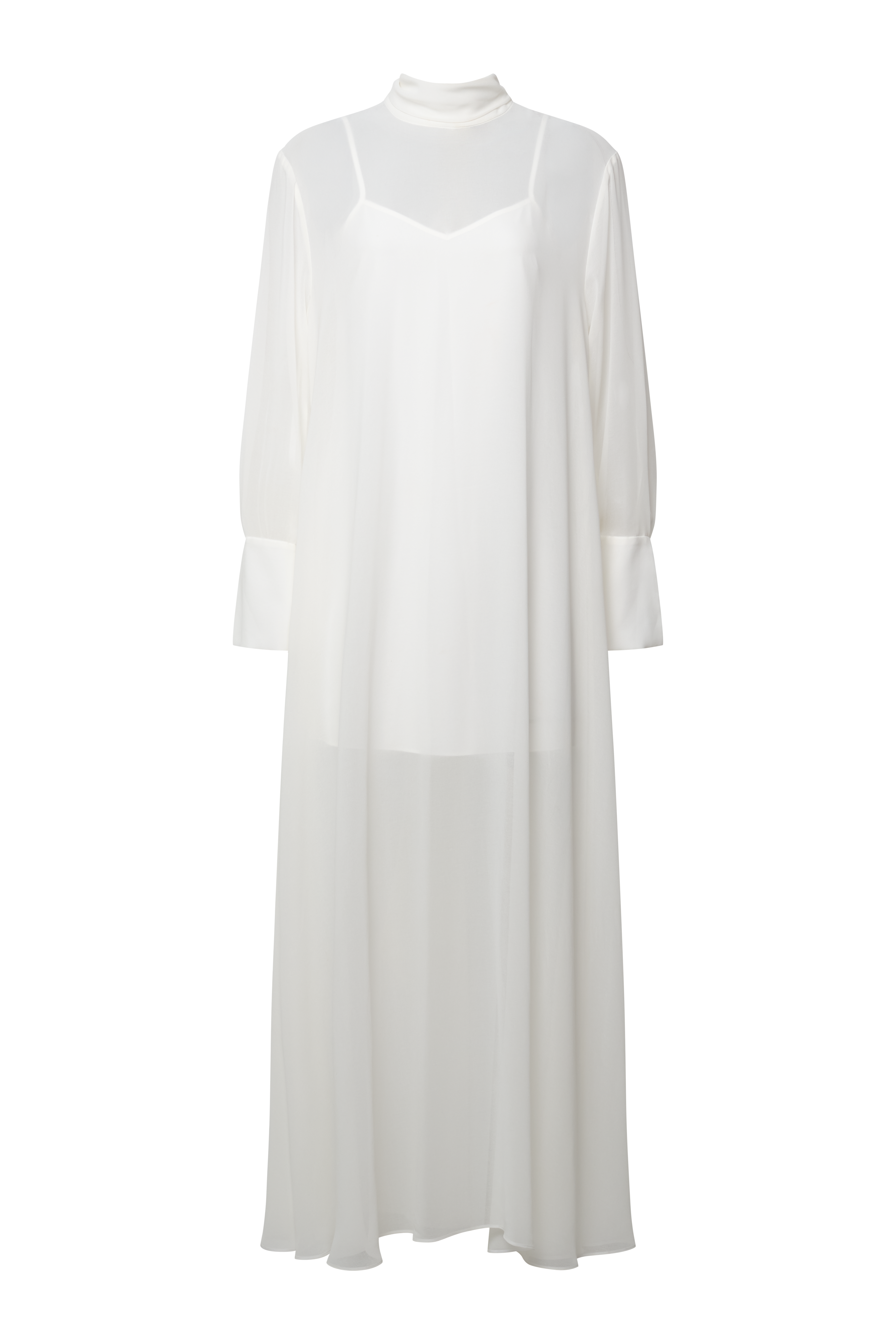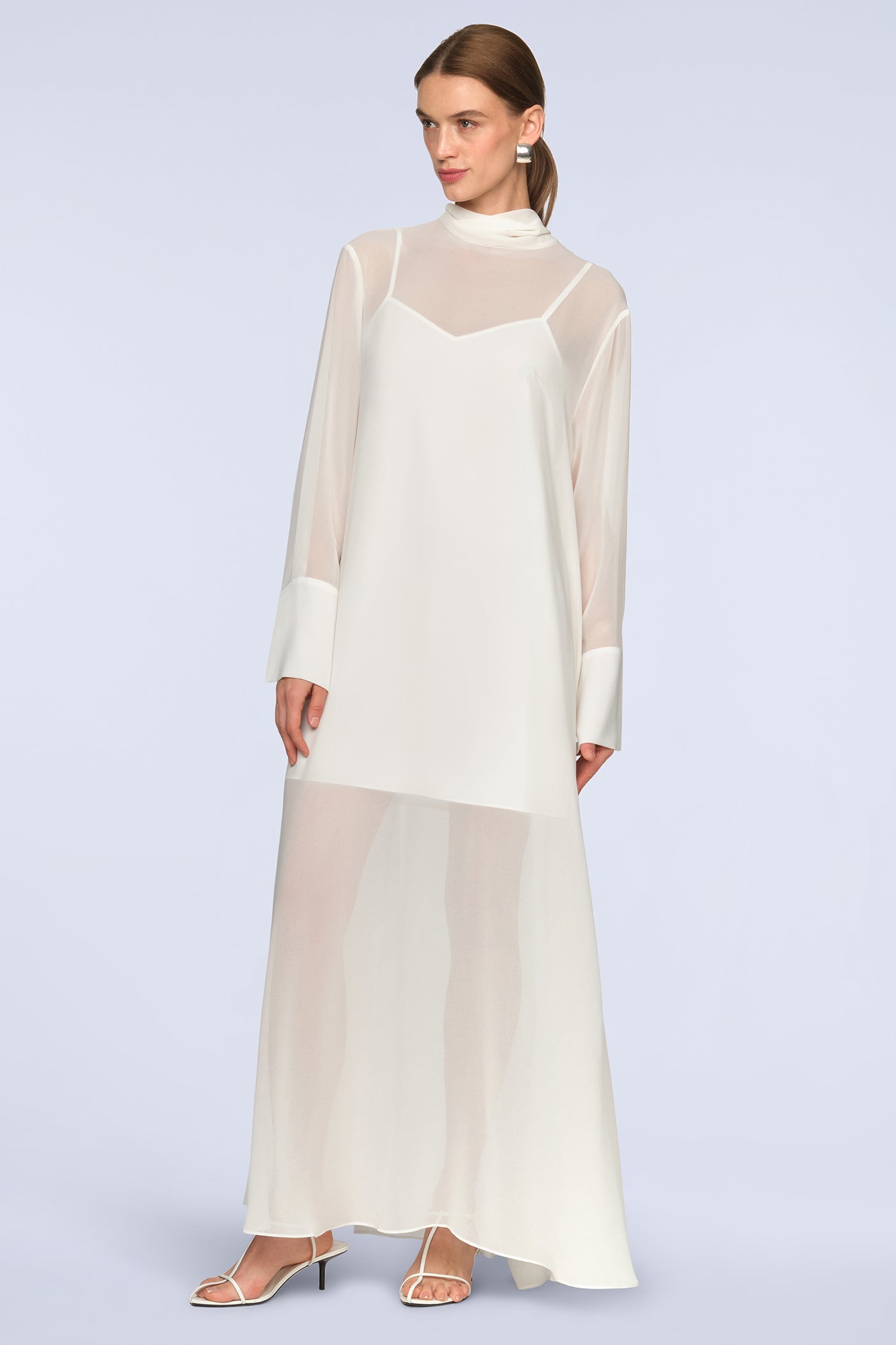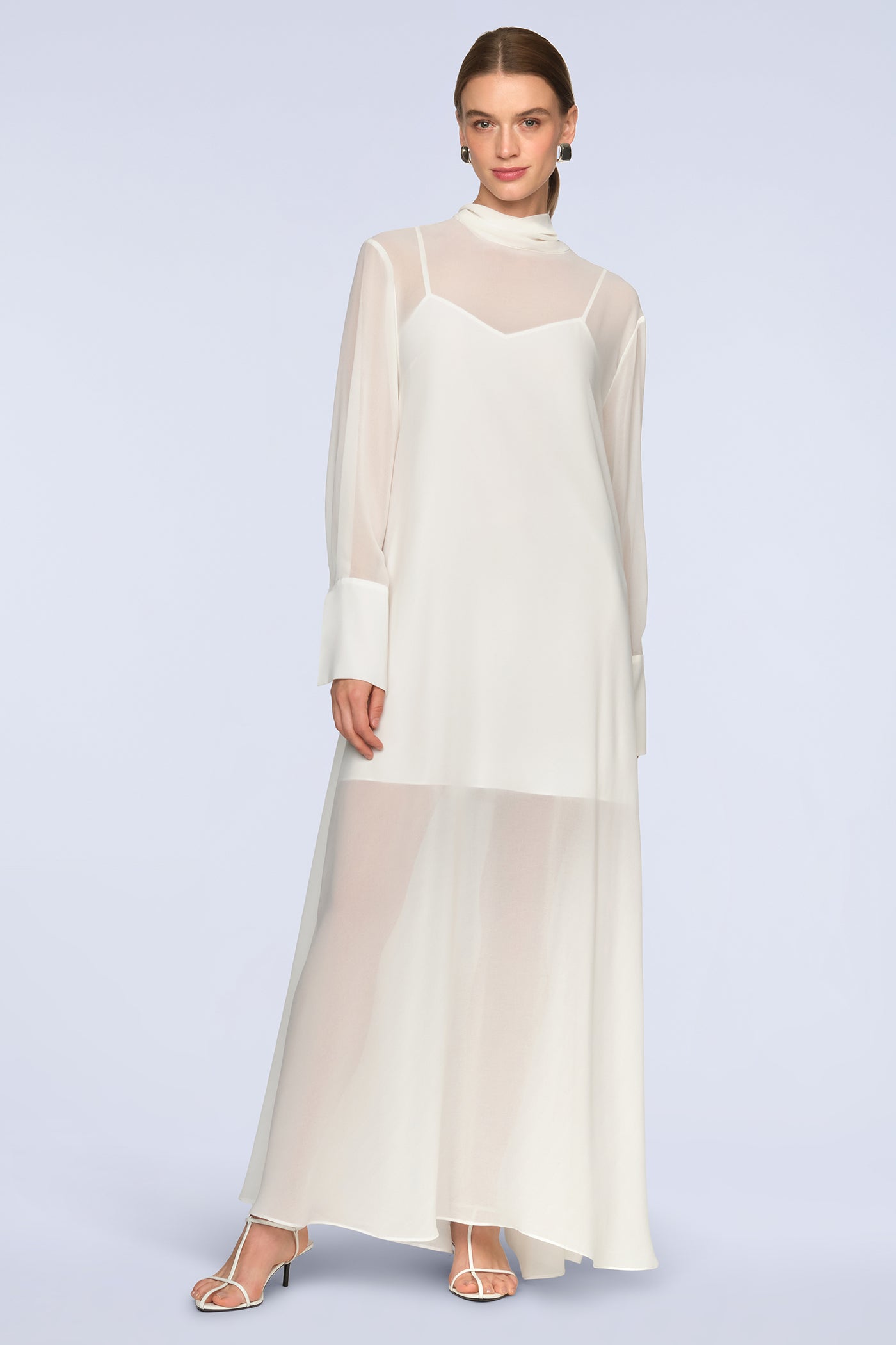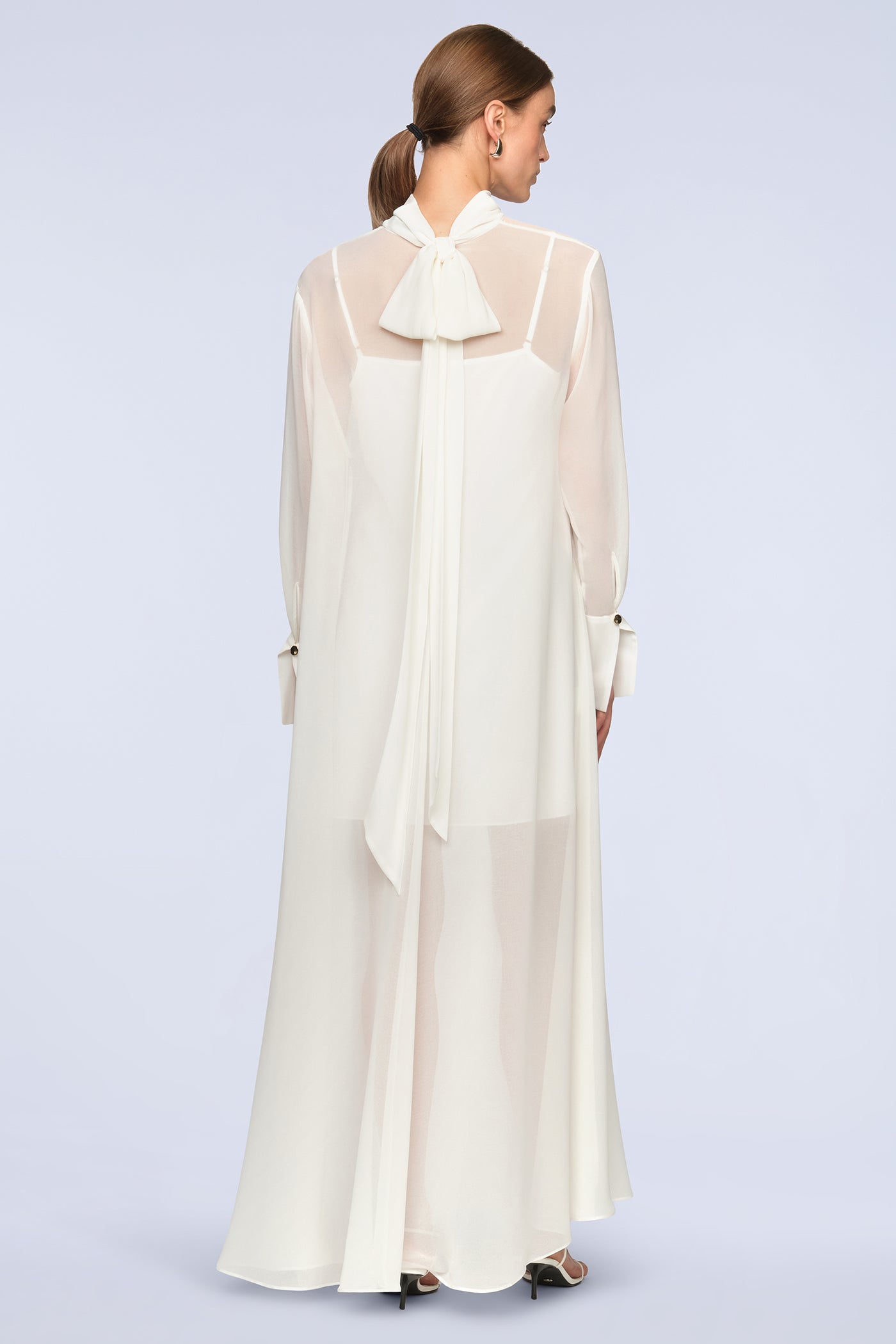Sheer ivory chiffon gown crafted with a fluid, weightless drape. Designed with soft translucence and elongated back ties that move with her. A refined statement for galas and low-lit interiors.