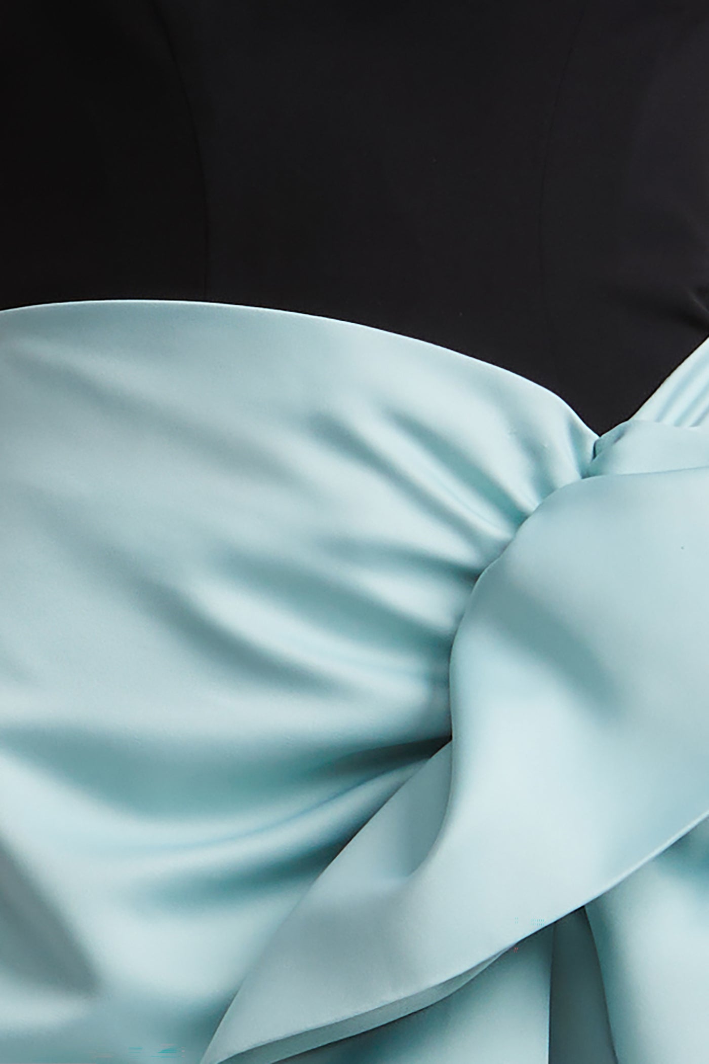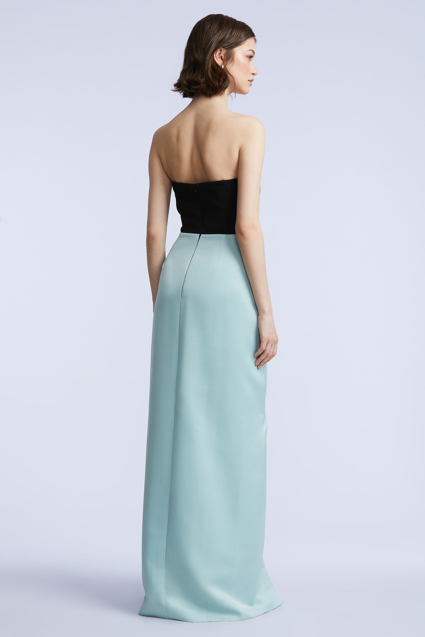 Colorblock strapless gown with a contouring bodice and sculptural satin bow detail. Features a sleek column skirt with a center slit for bold movement. A high-drama piece built for gala season.