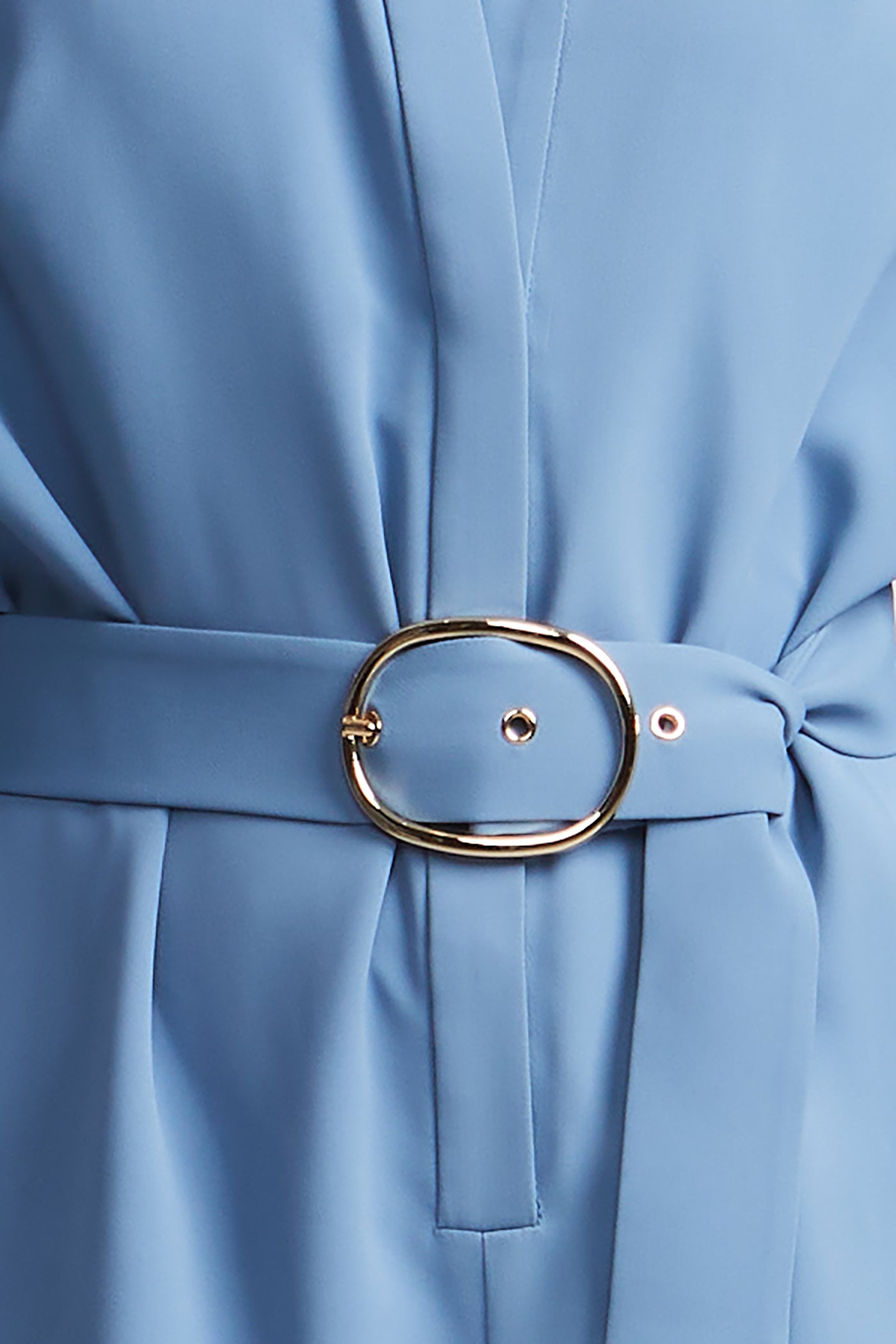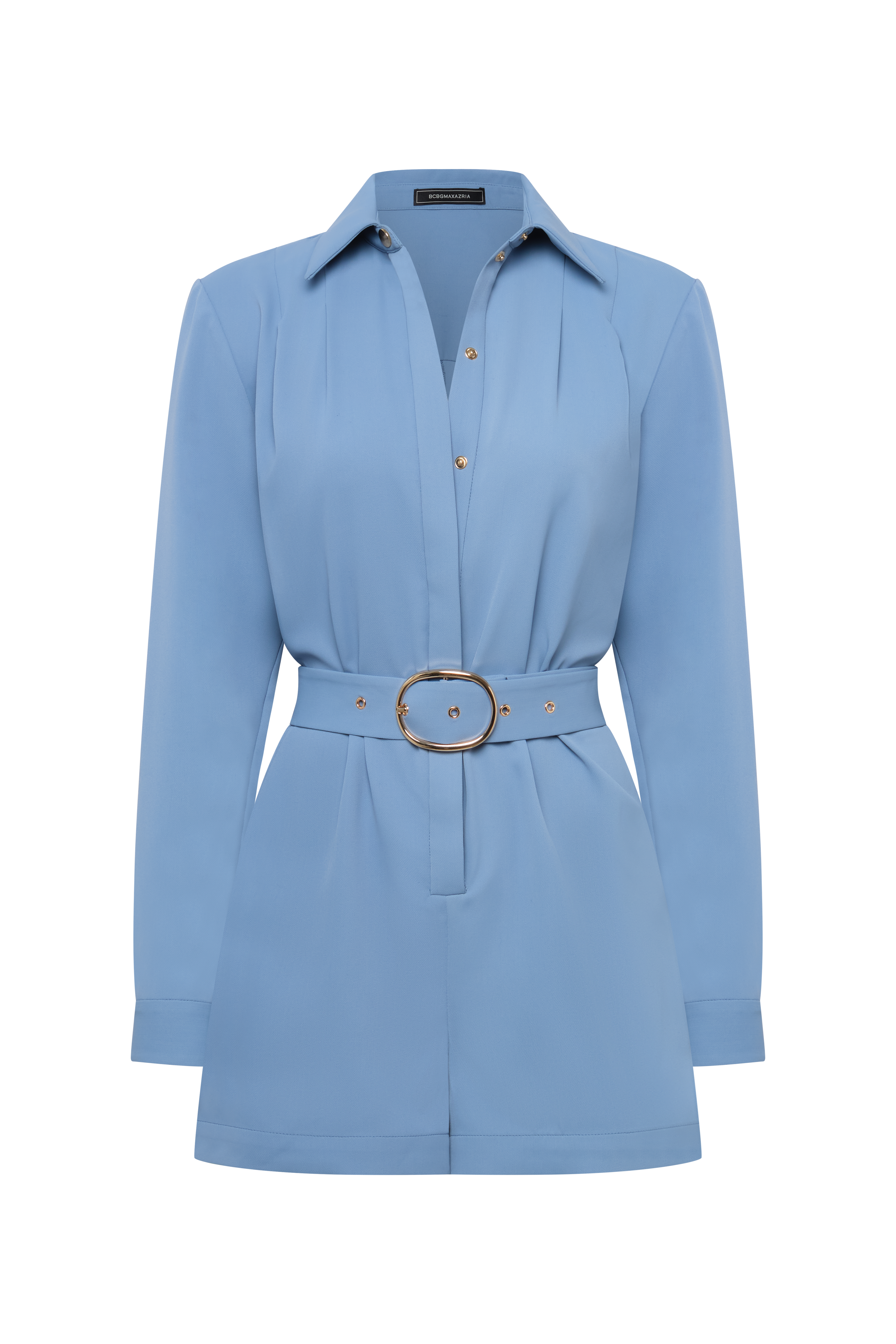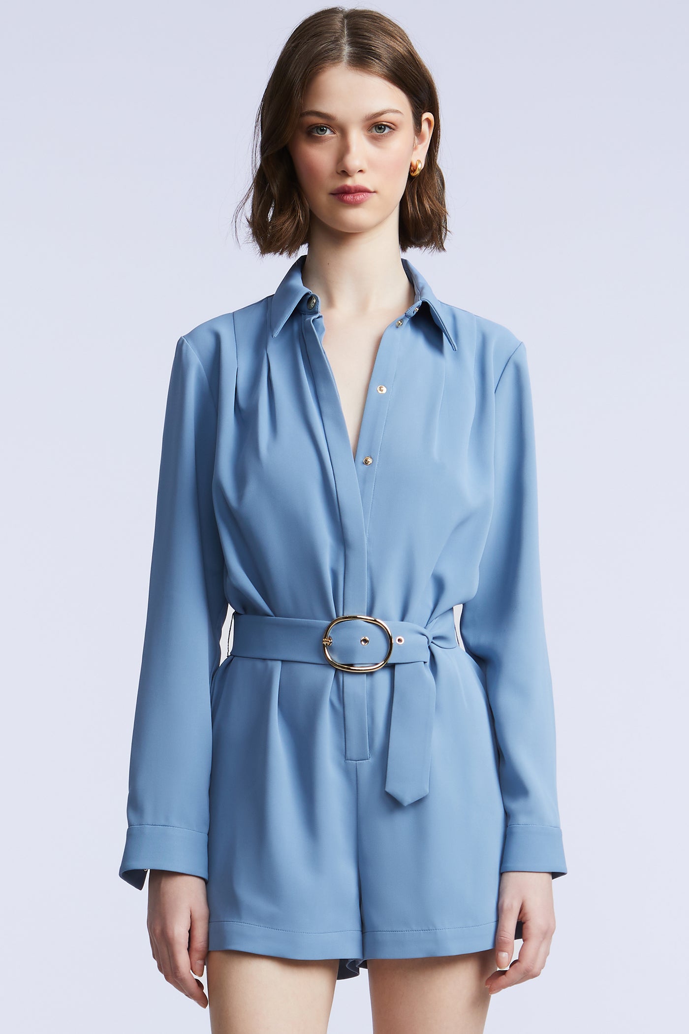 Soft crepe romper with a relaxed shirt-style bodice and a belted waist for shape. Clean pleated shorts finish the look. Easy to dress up with heels or keep casual for brunch and weekend plans.
