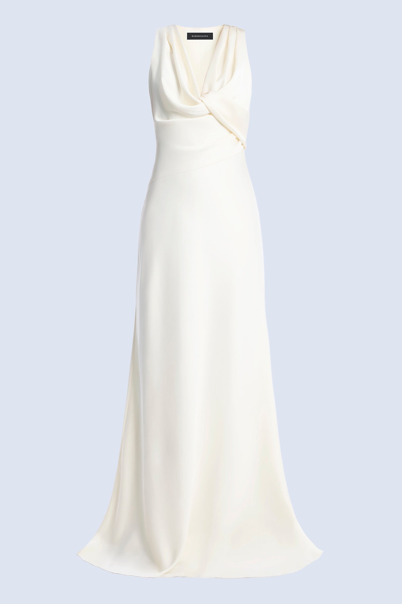 Sleek white gown cut from fluid satin with a soft, luminous finish. Artfully draped through the bodice with a twisted front detail that flows into a clean, elongated skirt, finished with an open, sculpted back. A striking yet restrained choice for modern bridal moments, black-tie evenings, or elevated celebrations.