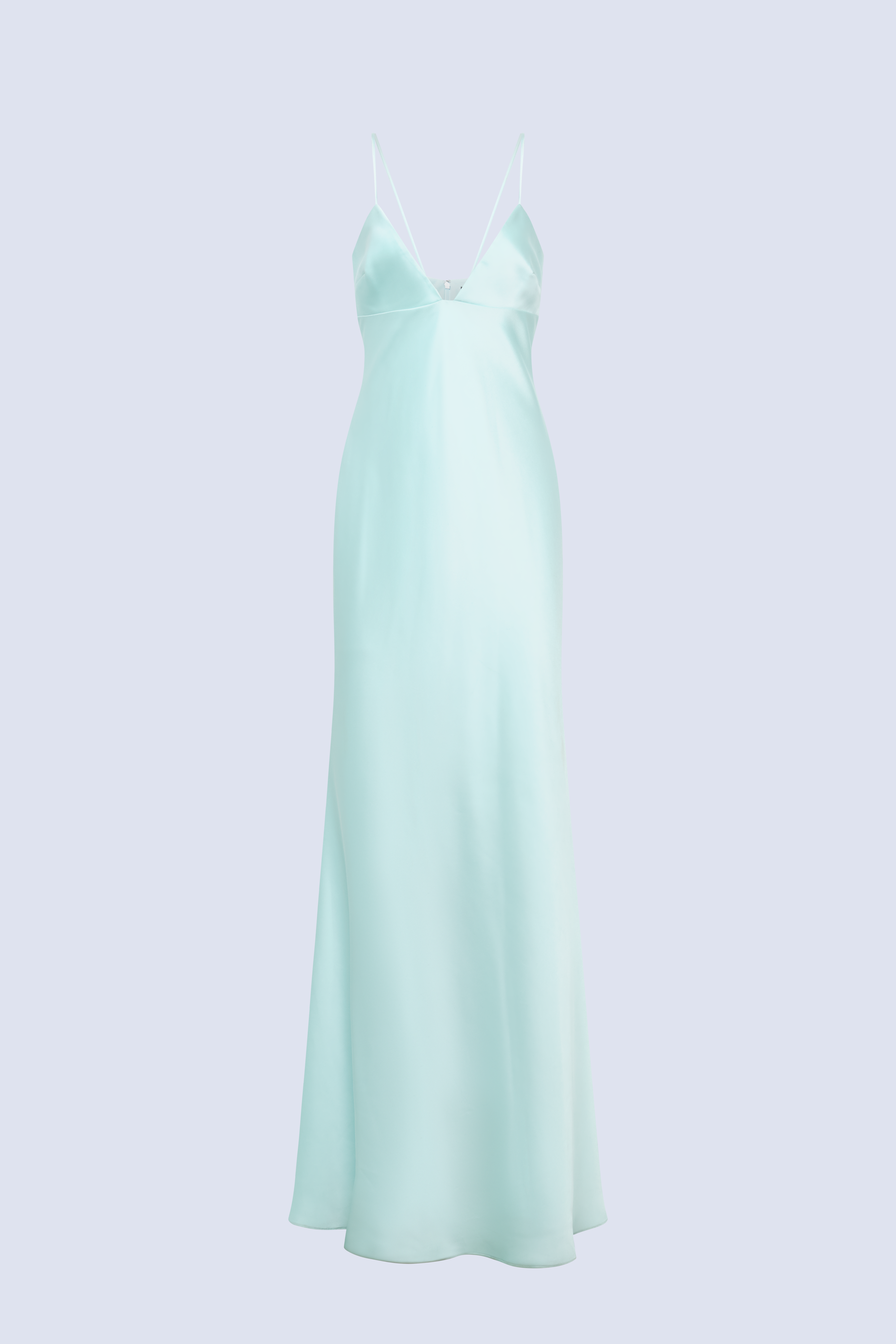 Seafoam satin gown cut with a smooth, fluid finish that skims the body with quiet polish. Designed with delicate shoulder straps and a clean plunging neckline that keeps the focus on line and proportion. A refined choice for formal weddings, evening receptions, and modern black-tie moments.