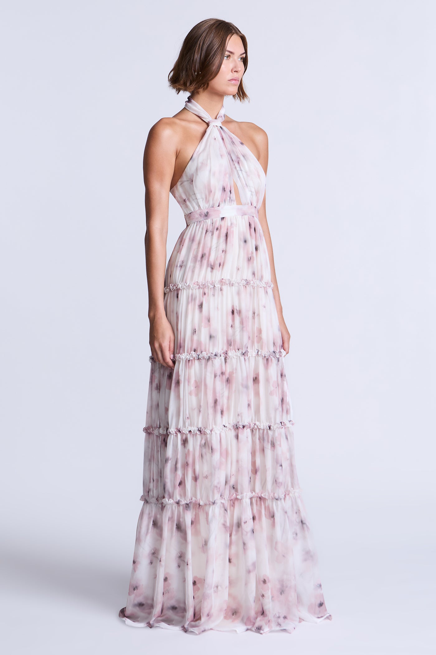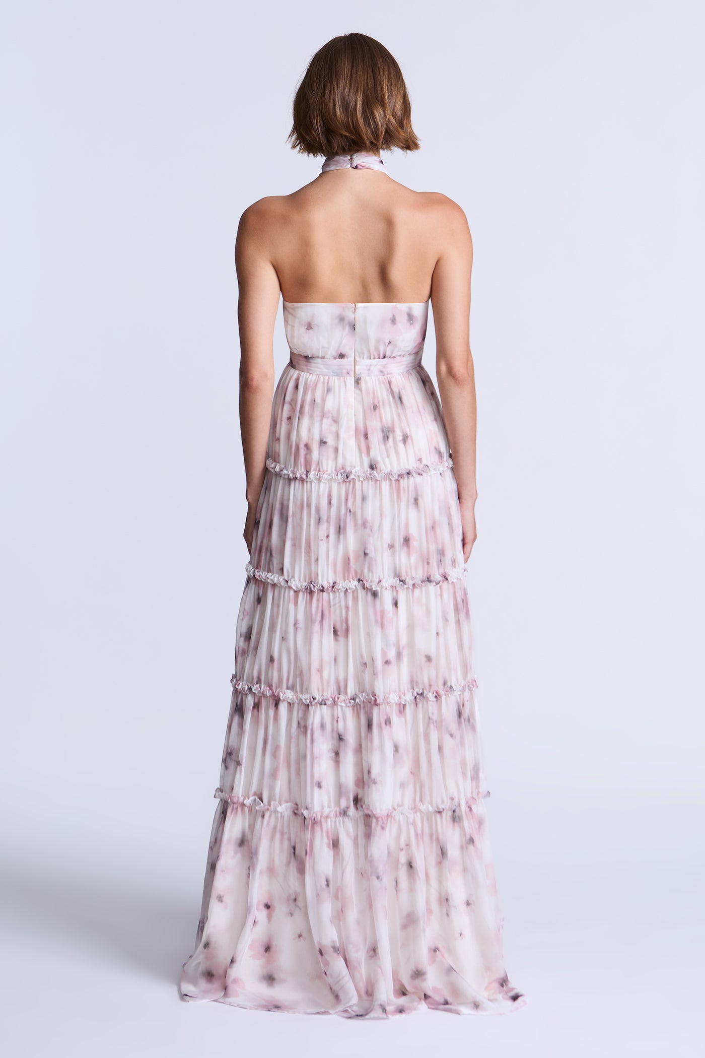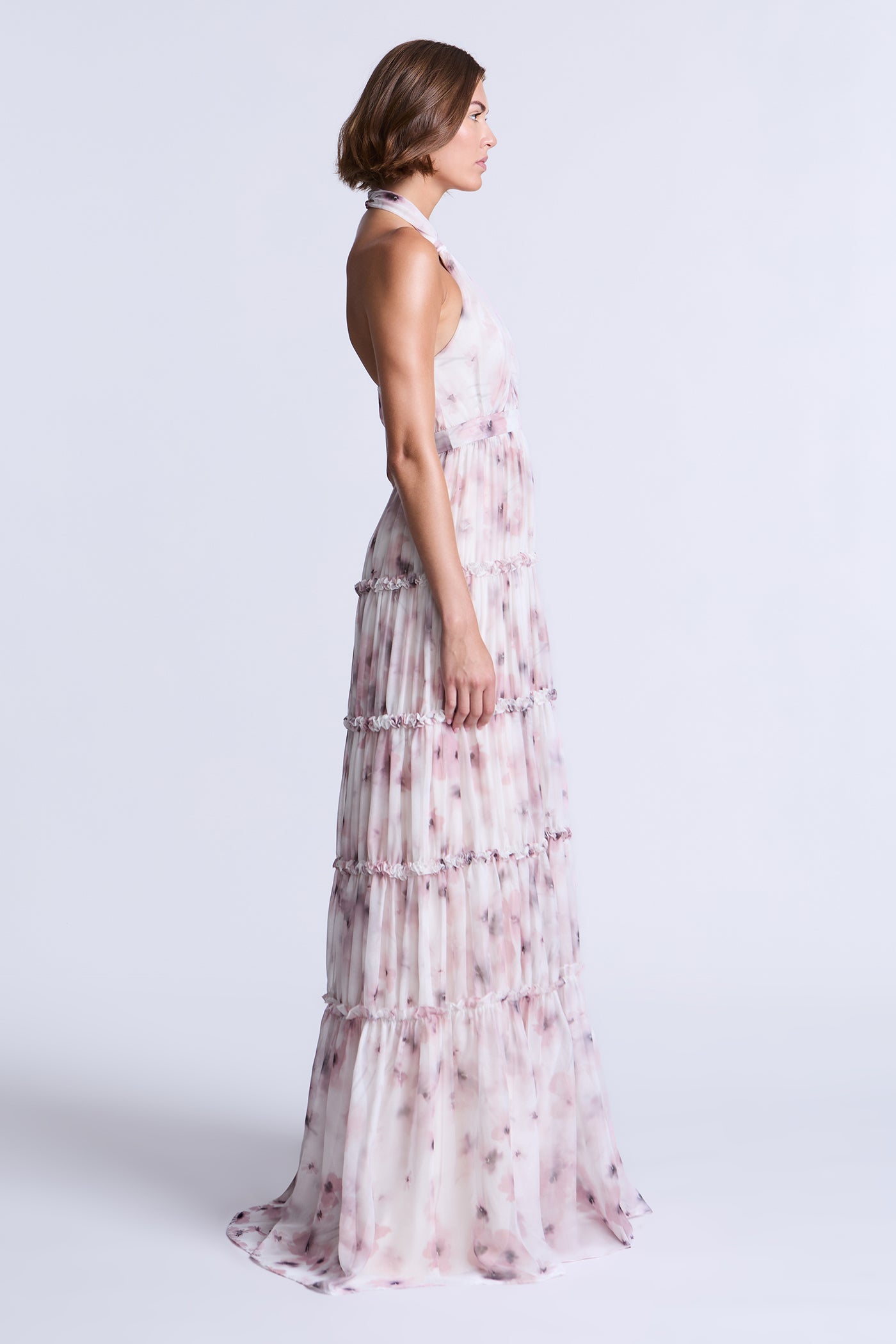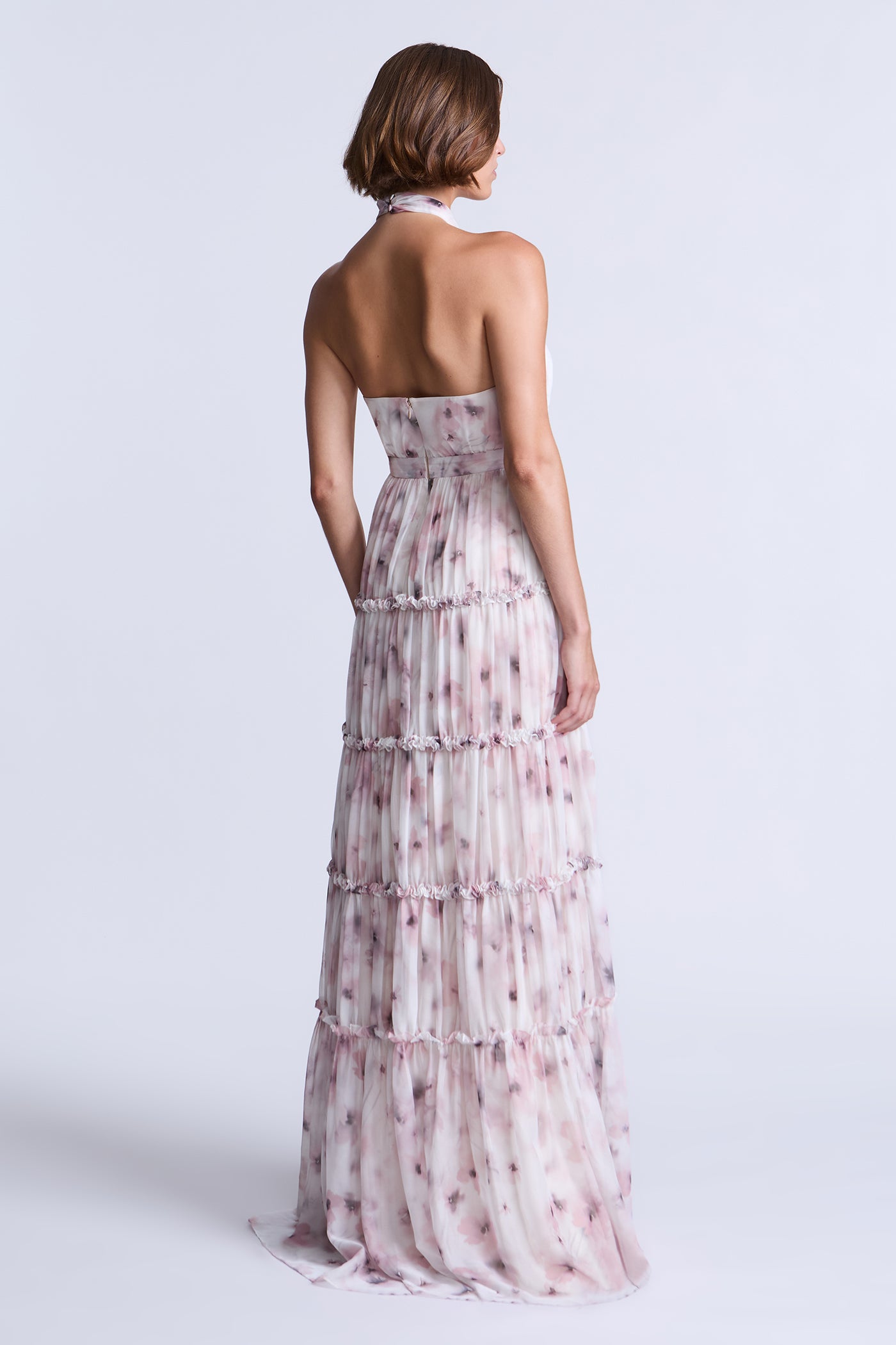 Pleated halter gown with a soft, fluid drape and a romantic tiered construction. Designed with a plunging neckline and delicate gathered detailing through the bodice, it falls into airy, softly ruffled tiers that move beautifully with each step. An effortless choice for garden weddings, formal celebrations, or warm-weather evenings.
