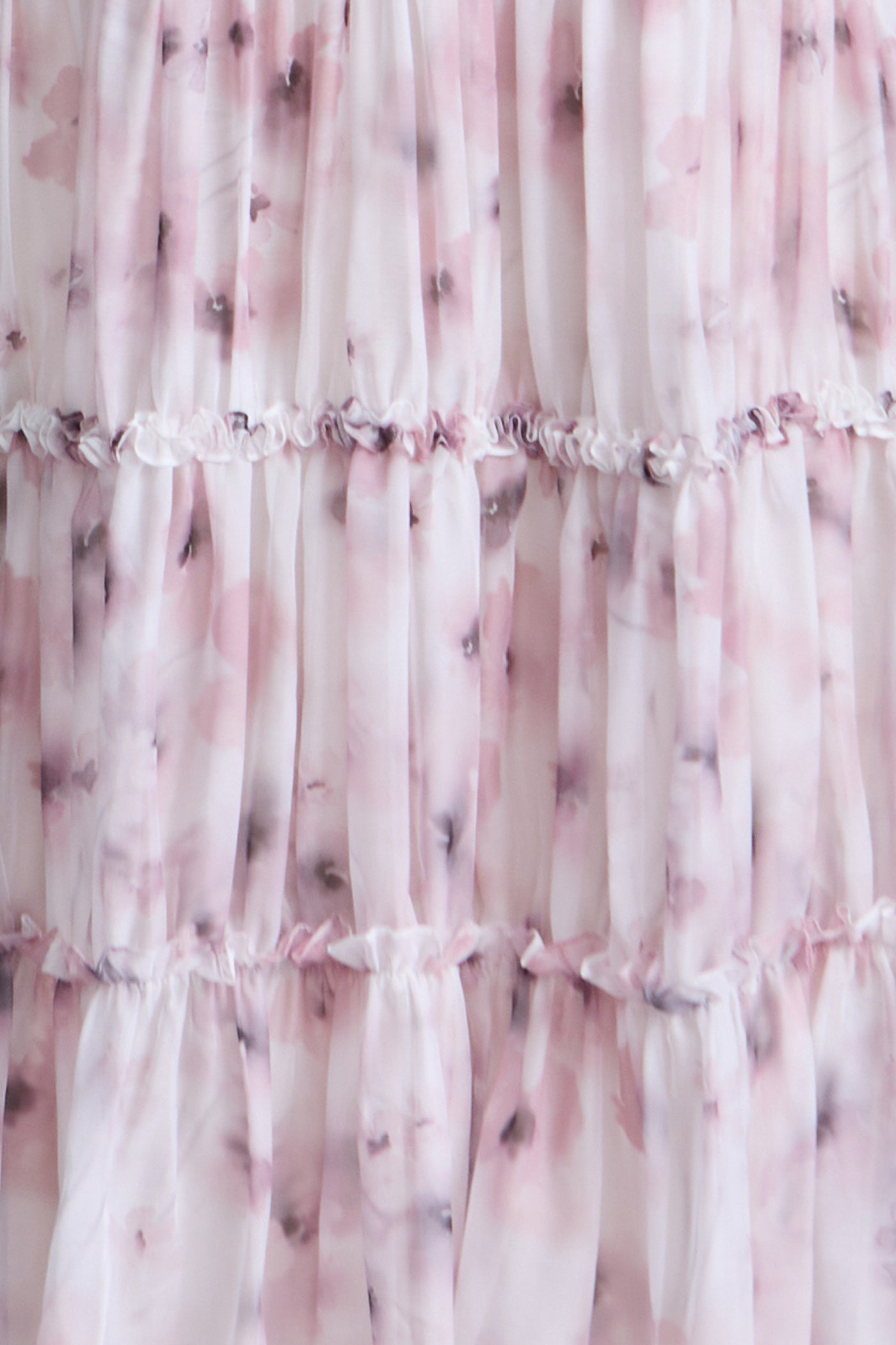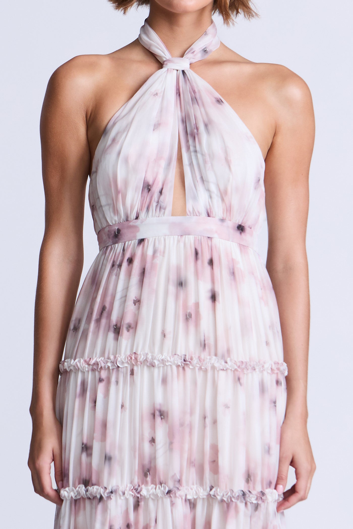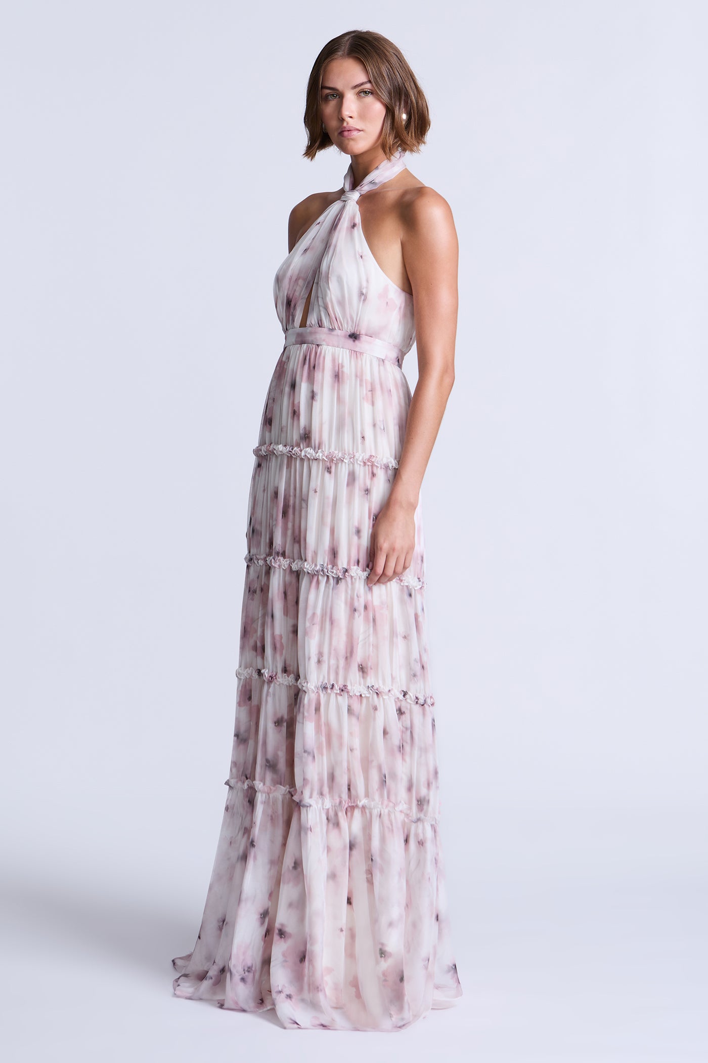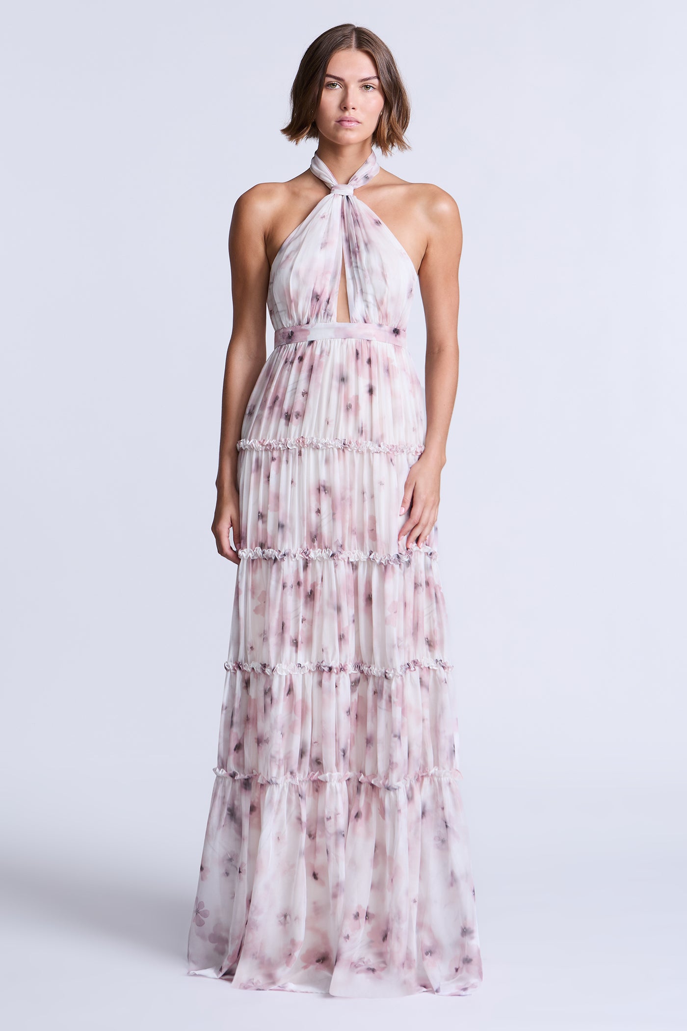 Pleated halter gown with a soft, fluid drape and a romantic tiered construction. Designed with a plunging neckline and delicate gathered detailing through the bodice, it falls into airy, softly ruffled tiers that move beautifully with each step. An effortless choice for garden weddings, formal celebrations, or warm-weather evenings.