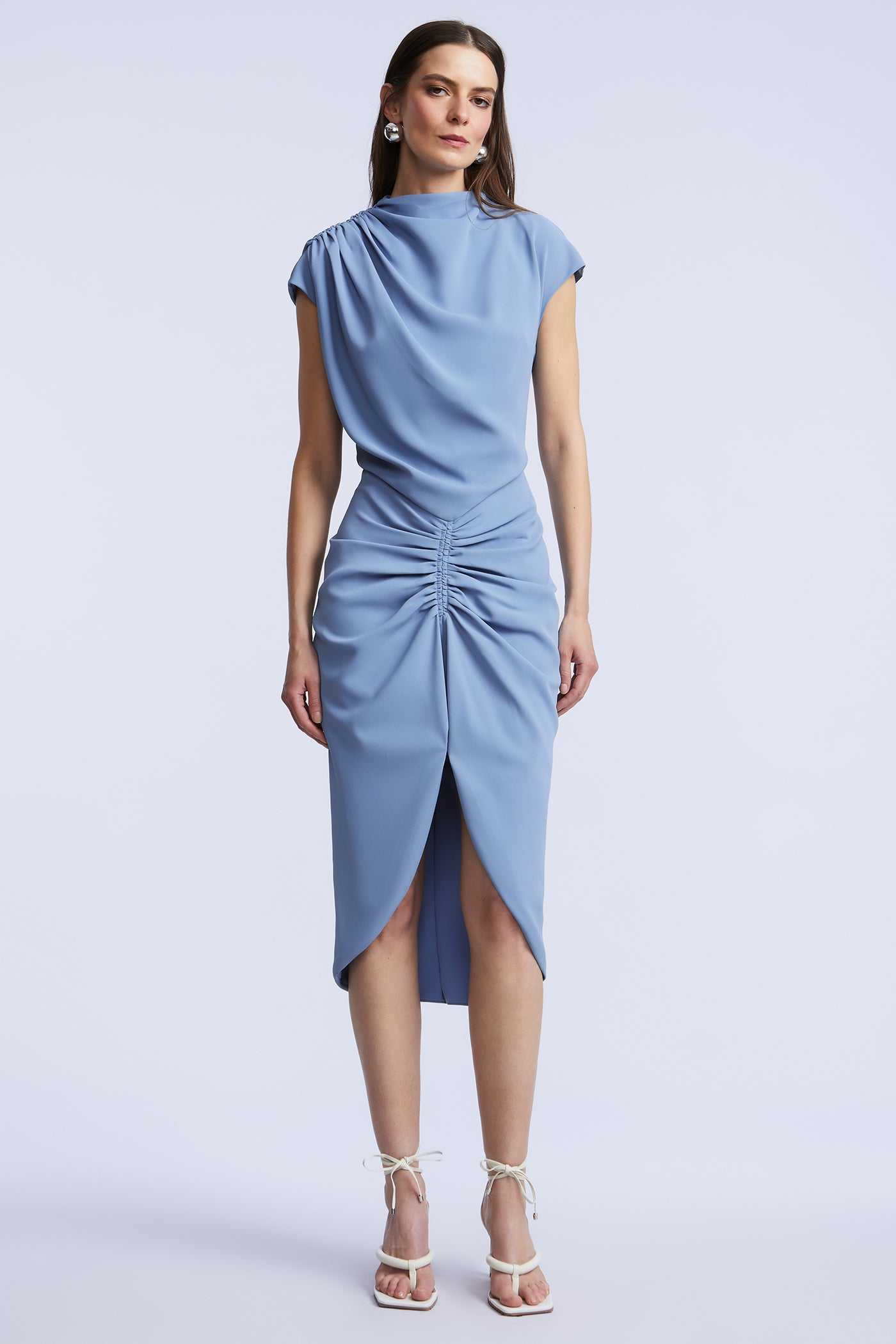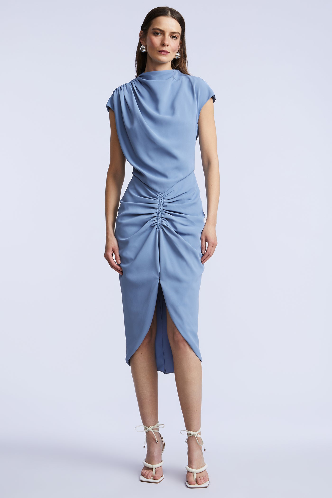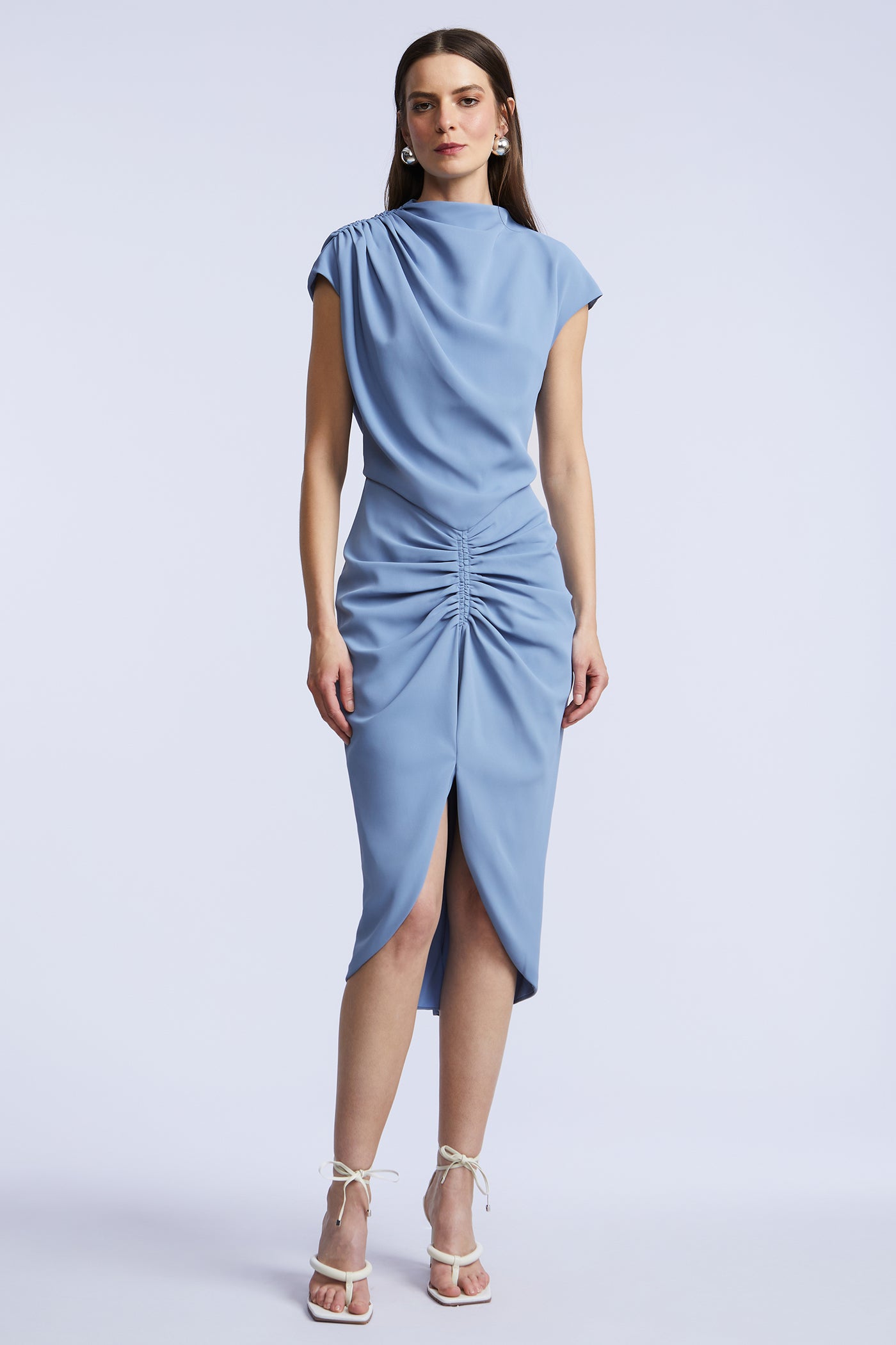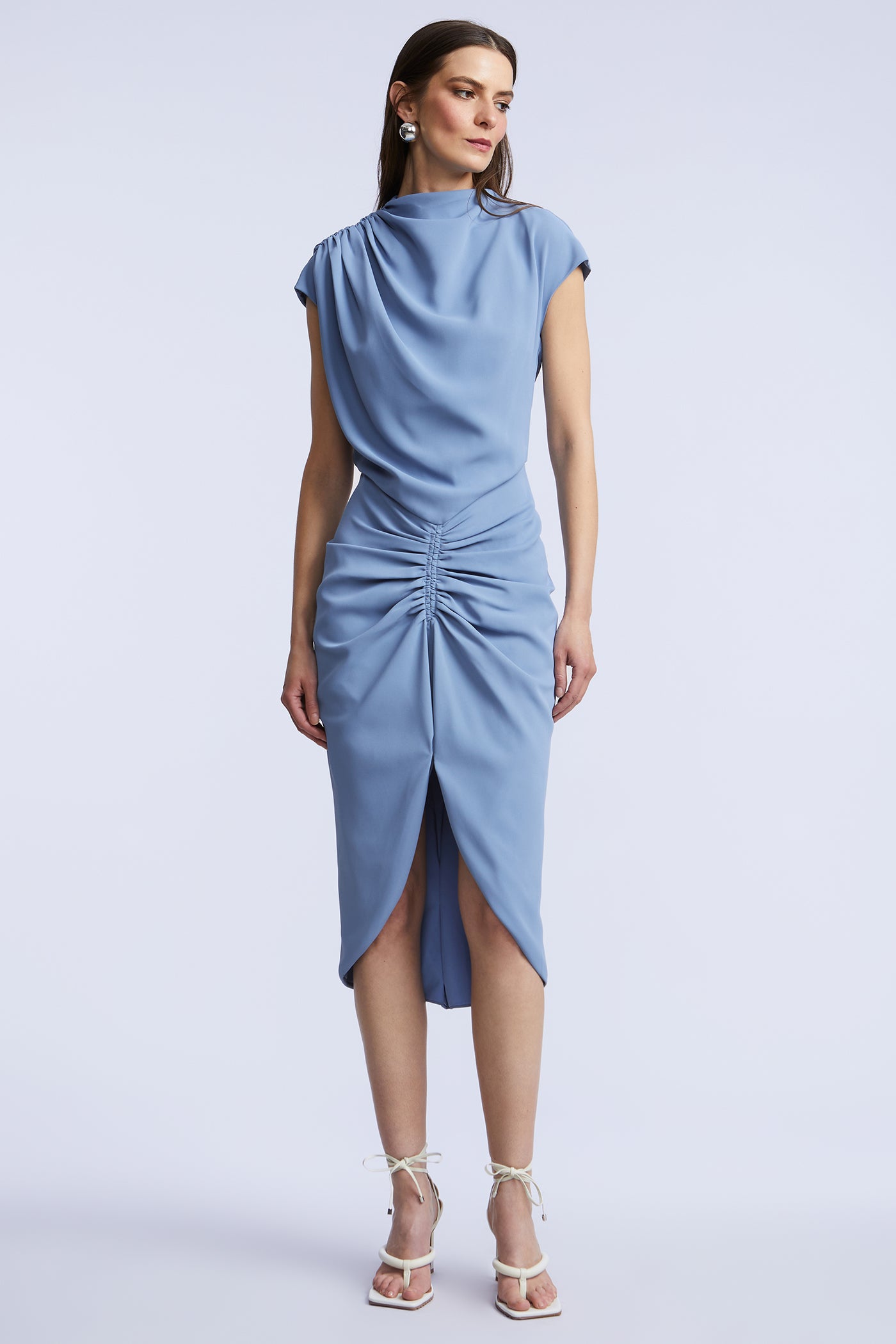Soft crepe dress with a draped bodice and gathered waist that creates an easy, sculpted shape. Finished with a front slit for movement. A polished pick for dinners, showers, and dressed-up plans.