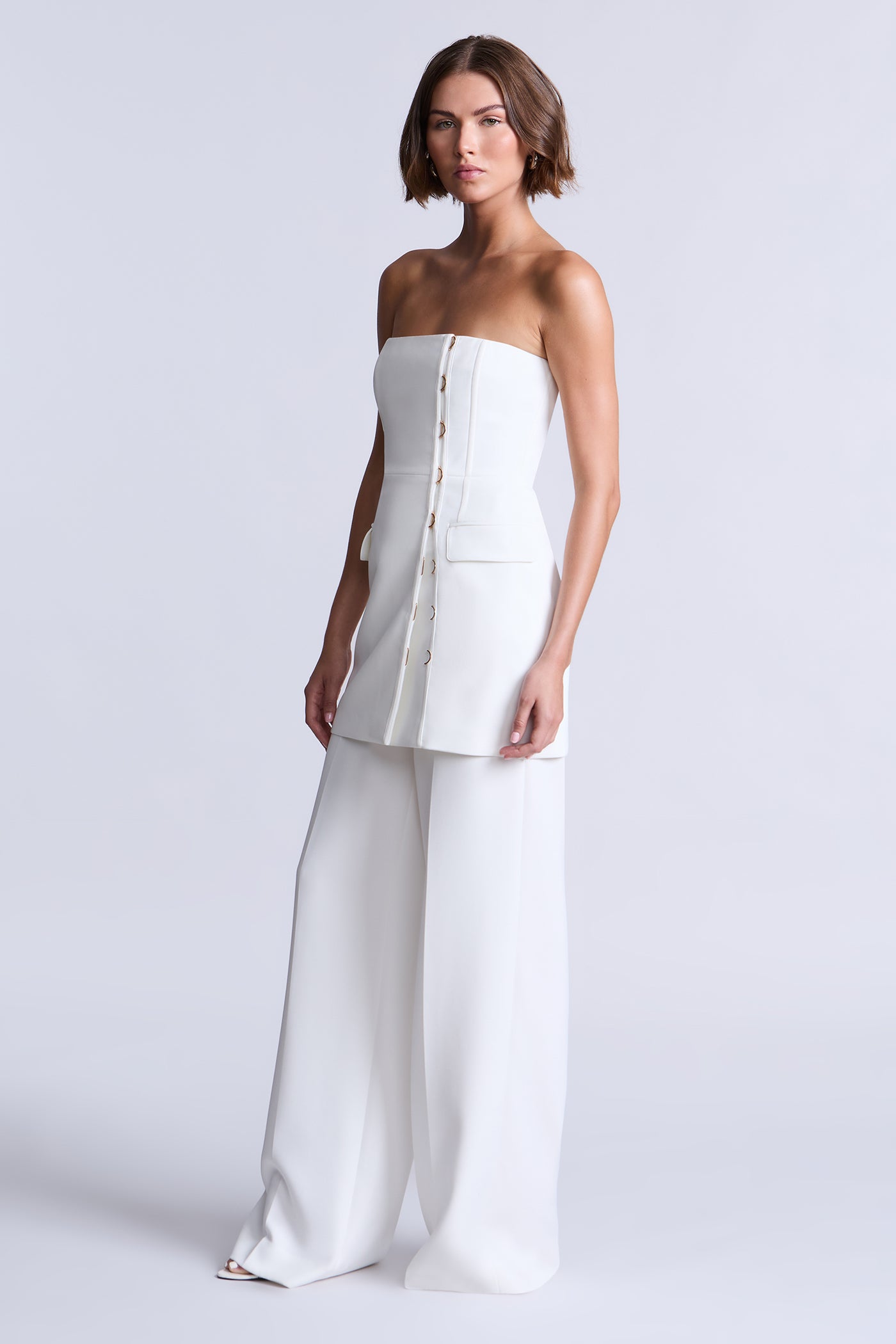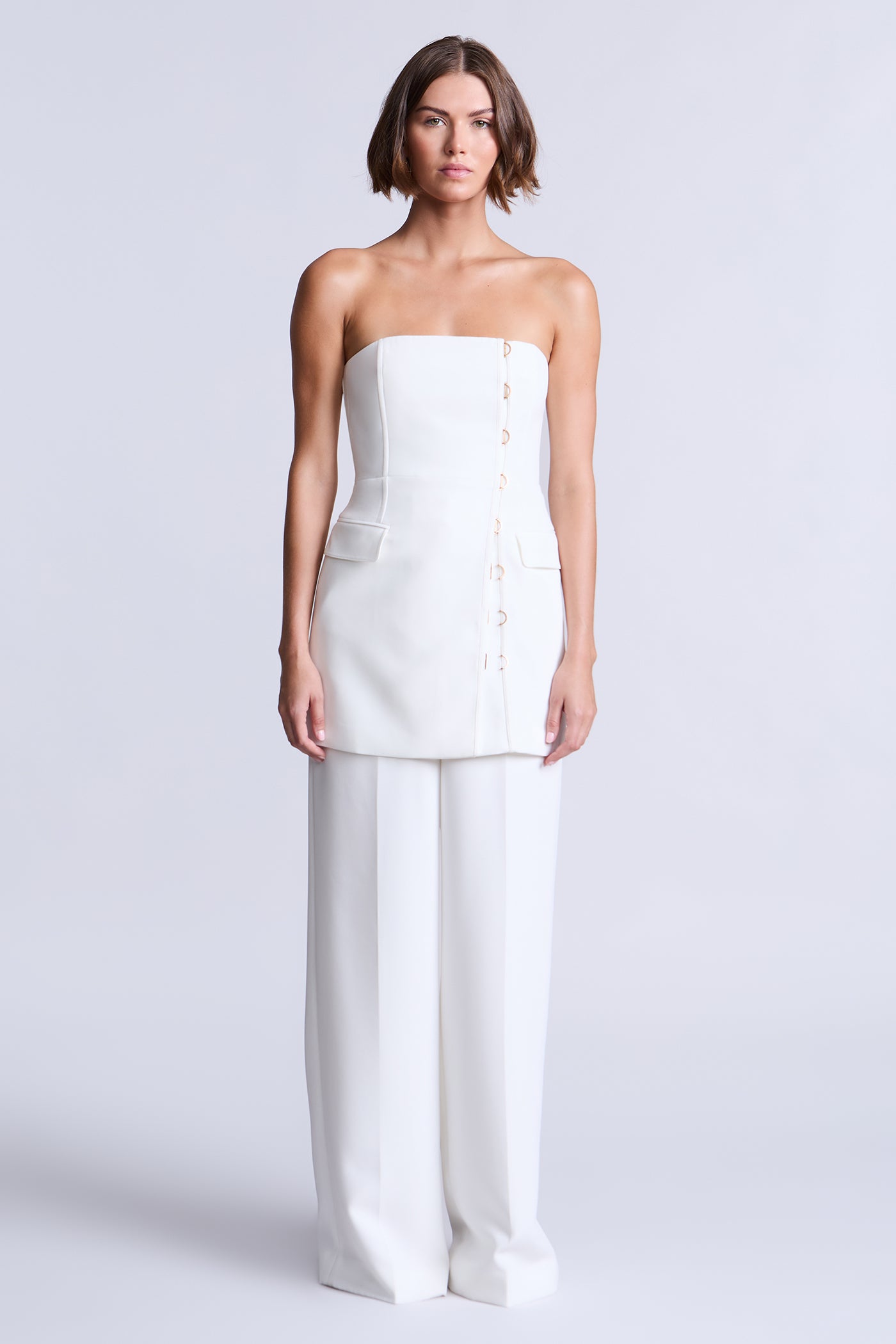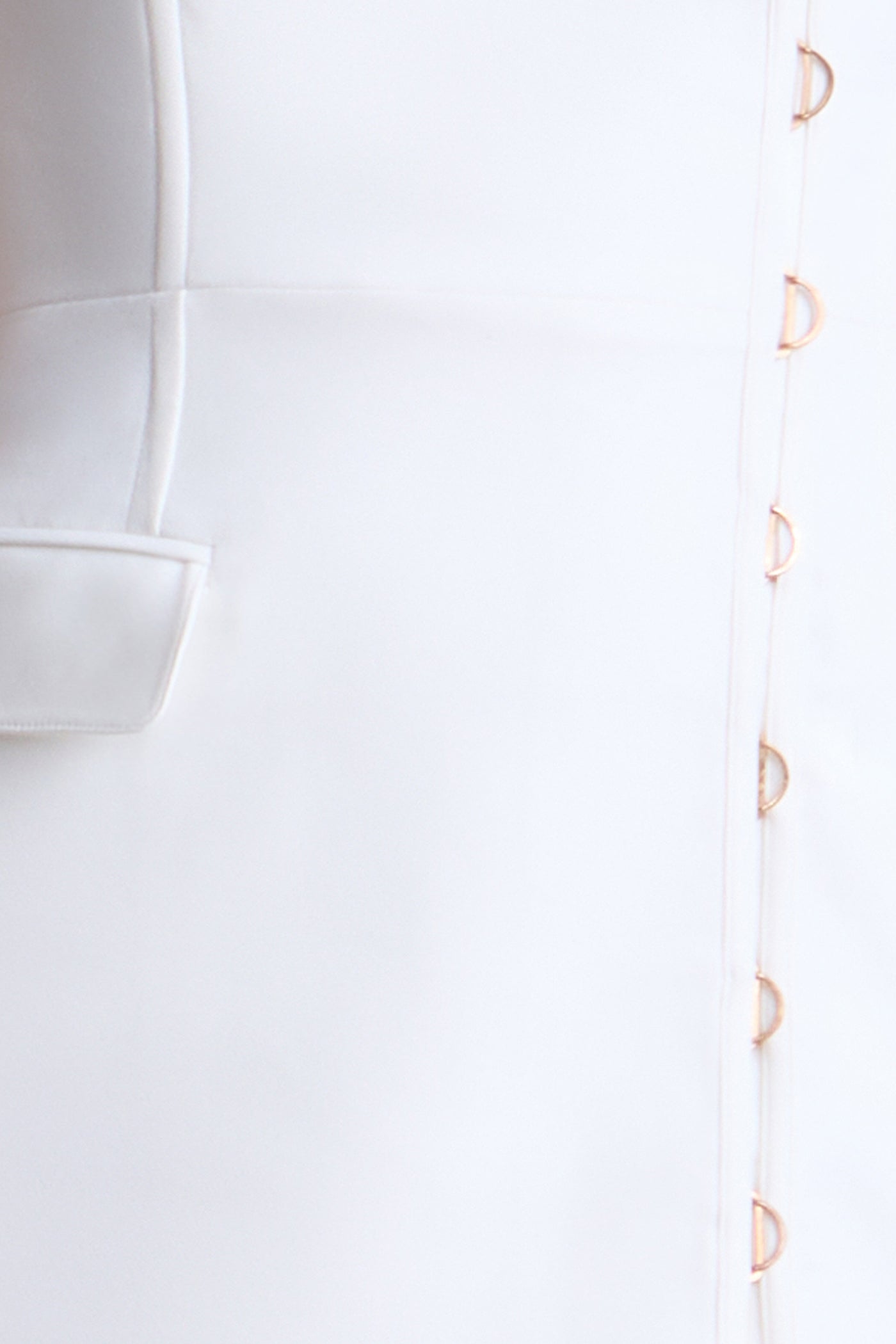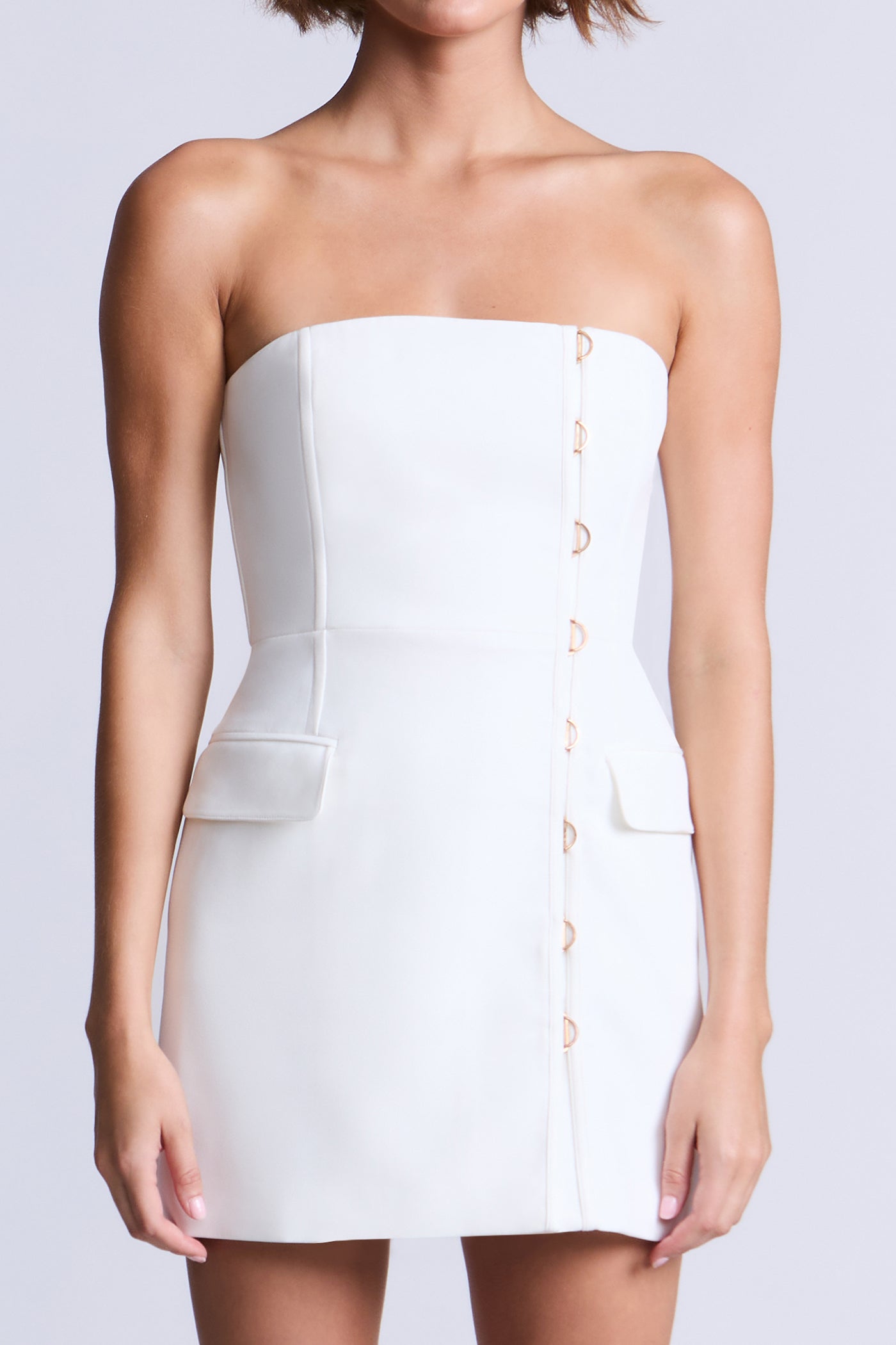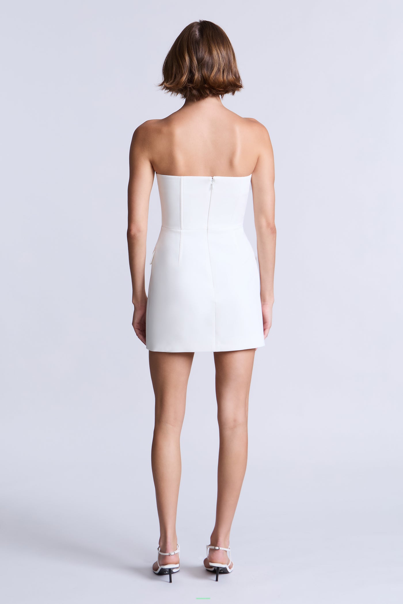 Sculpted mini dress with a smooth, fitted finish. Tailored with precise contour seaming that defines the waist through subtle architectural shaping. It moves easily from day to night—layered over tailored trousers, styled under a blazer, worn out after dark, or reimagined for a modern bridal moment.