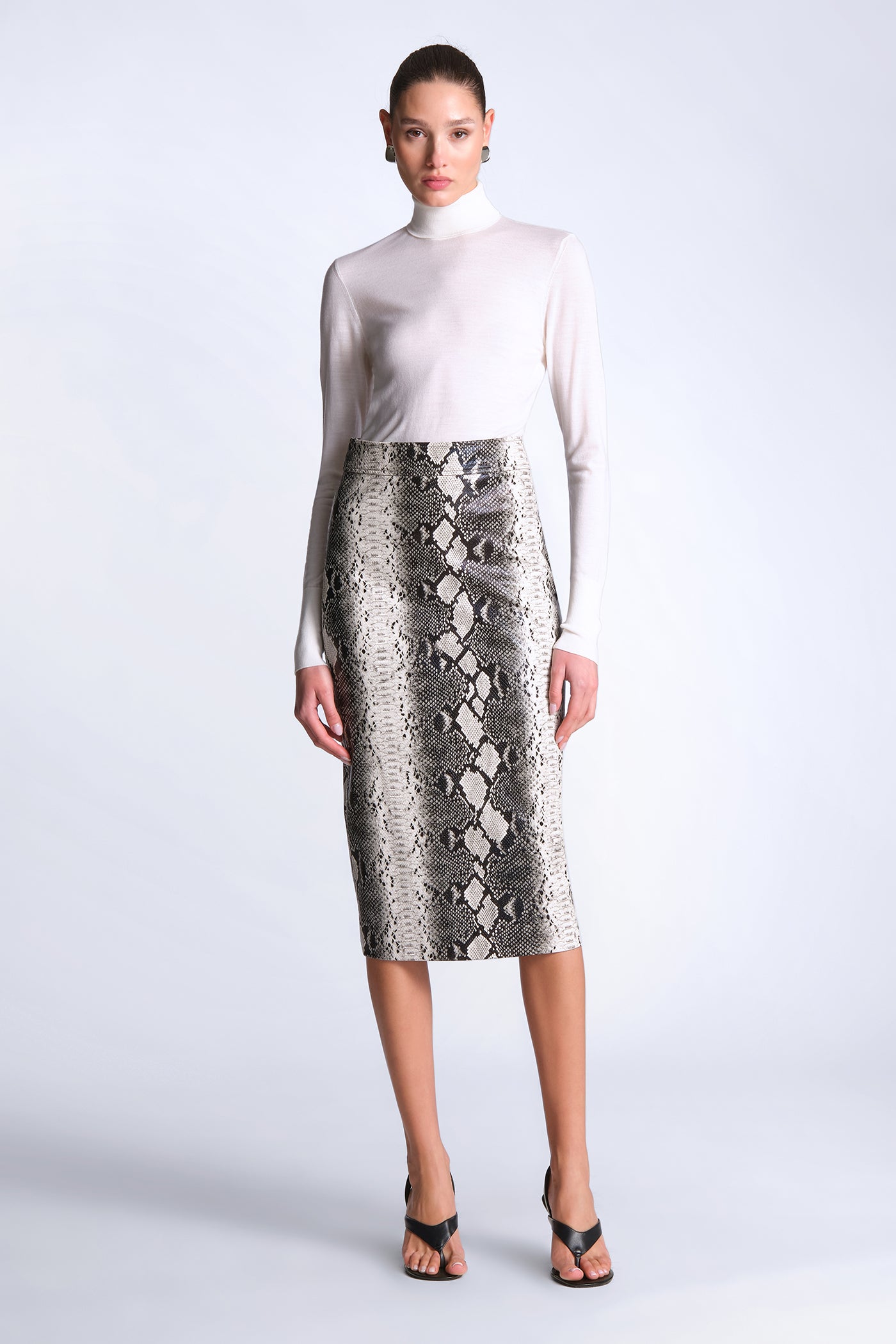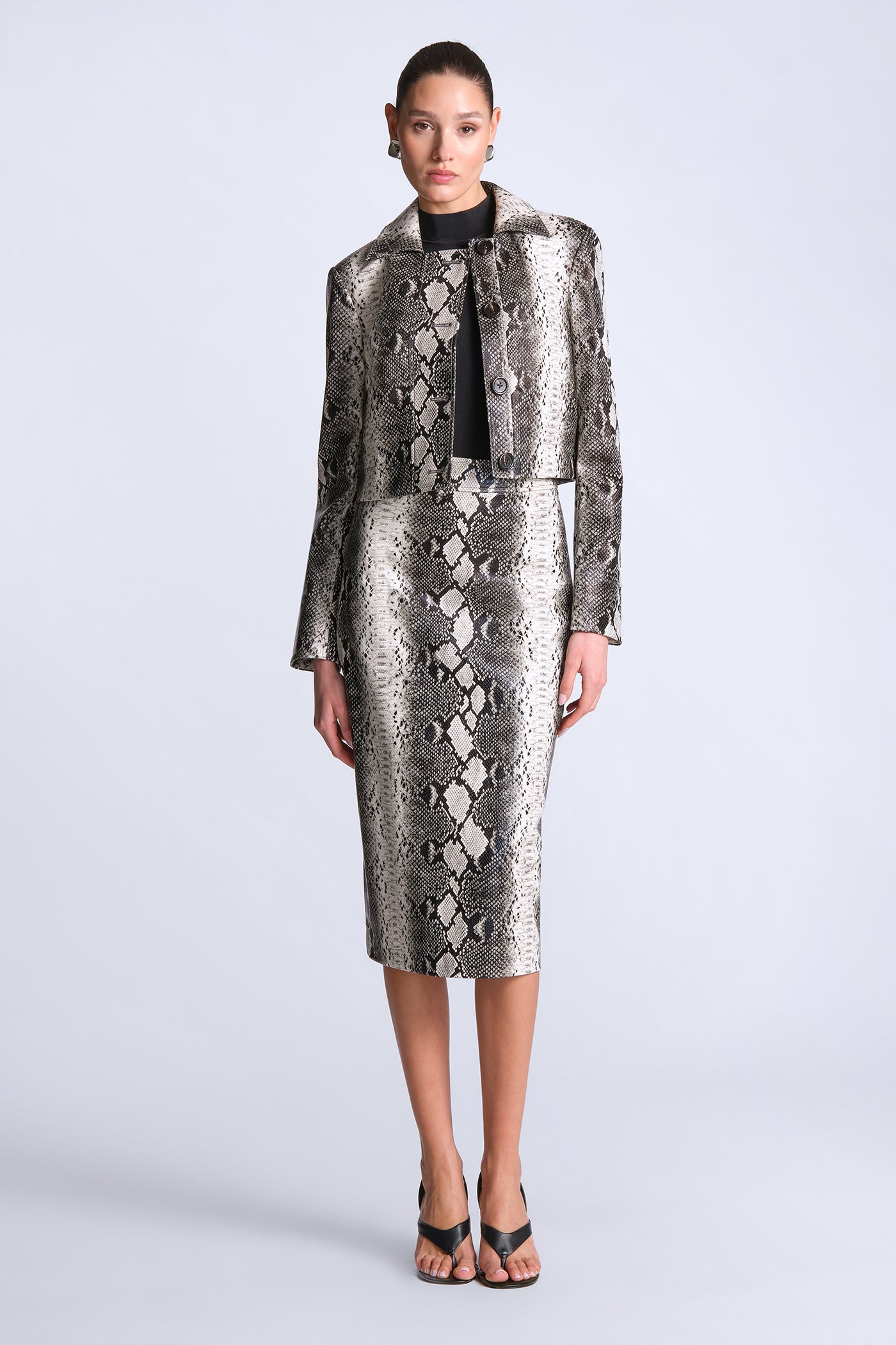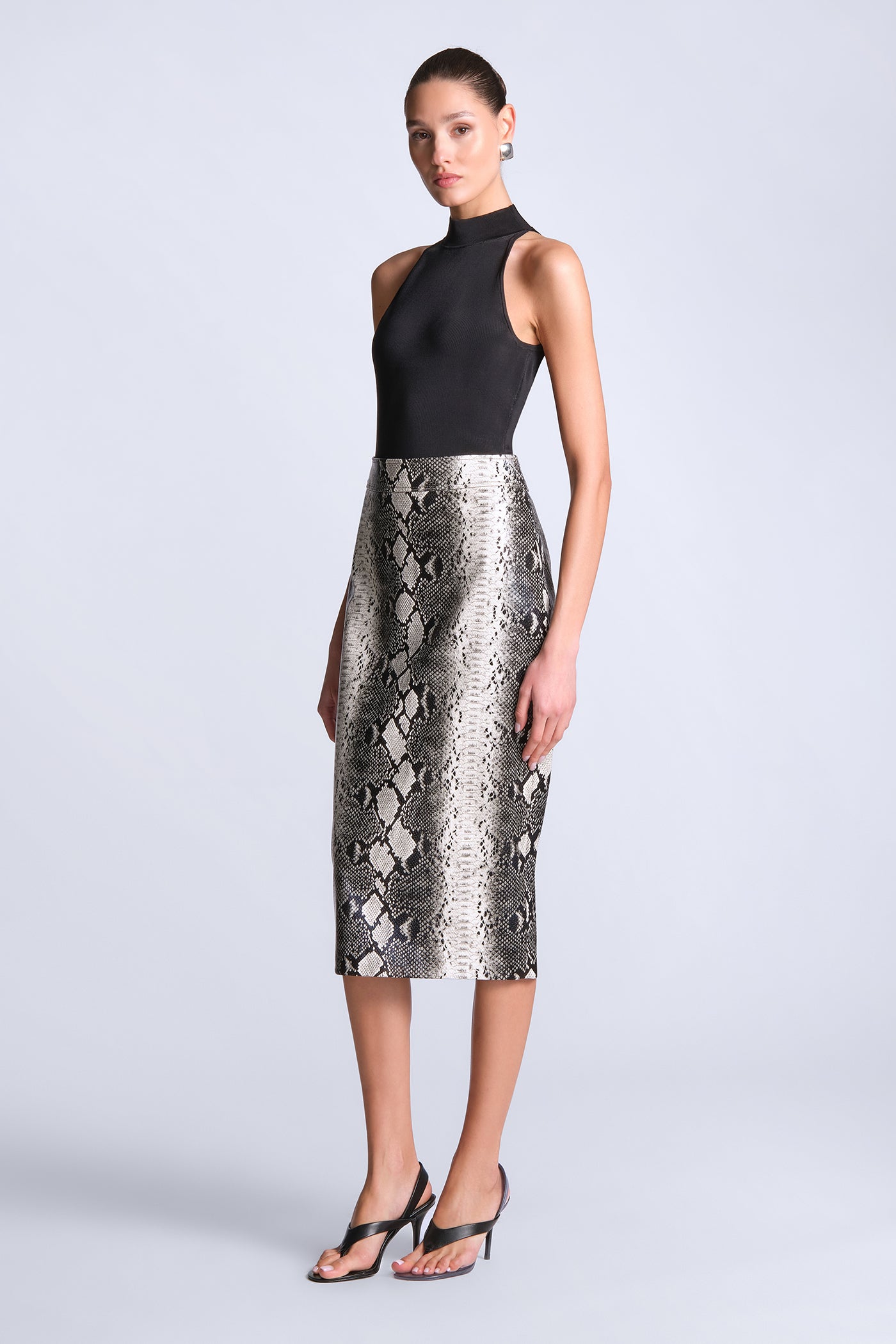 Python-print pencil skirt cut with a structured, glossy finish. Tailored with clean, streamlined seaming for a smooth, sculpted fit through the body. Bold and directional—made to style as a set or offset with crisp shirting for sharp day-to-night impact.