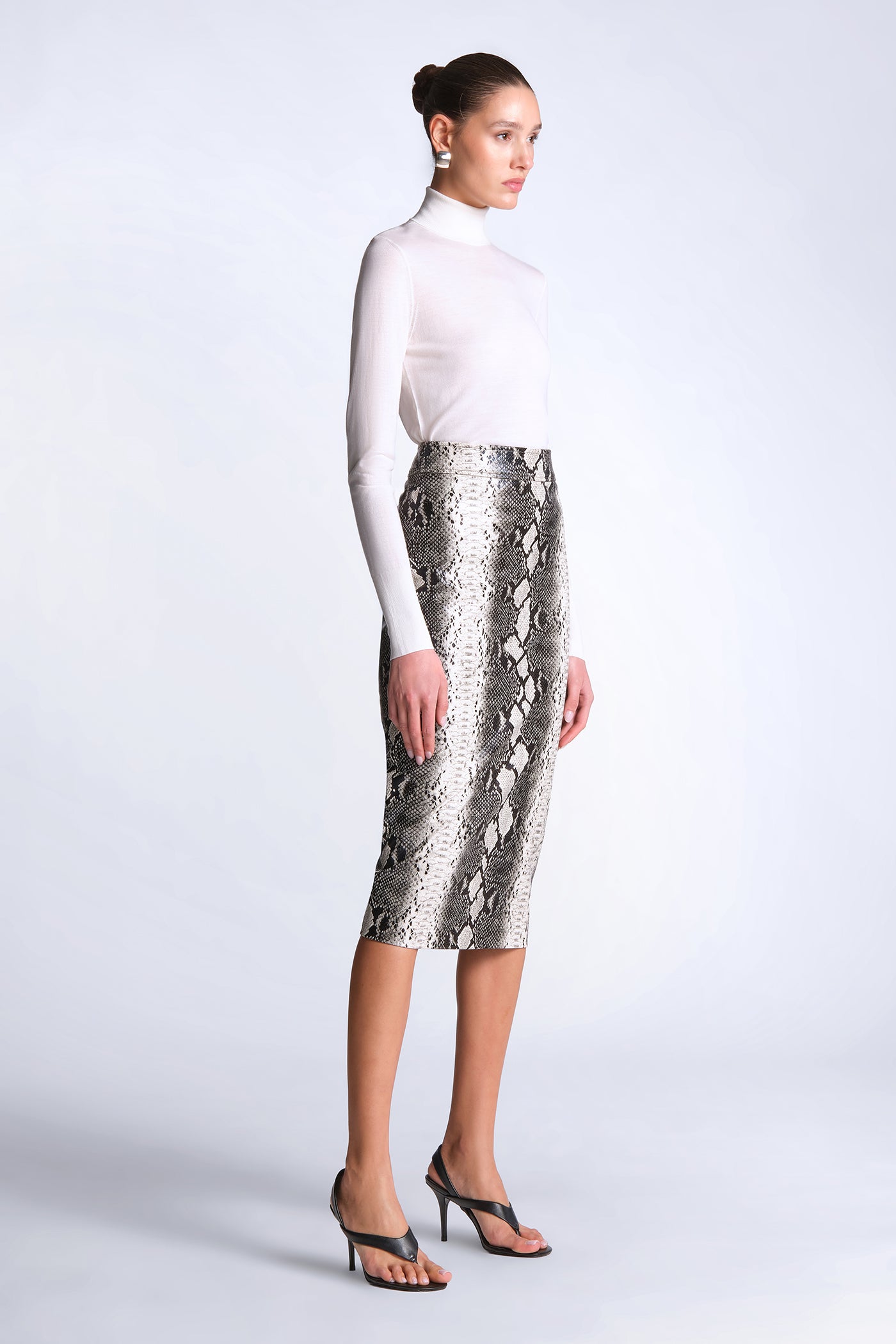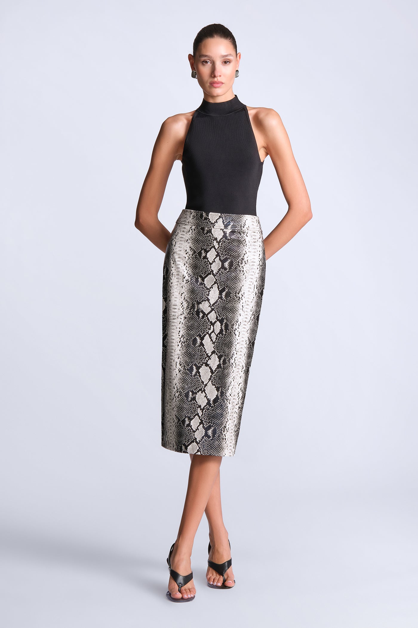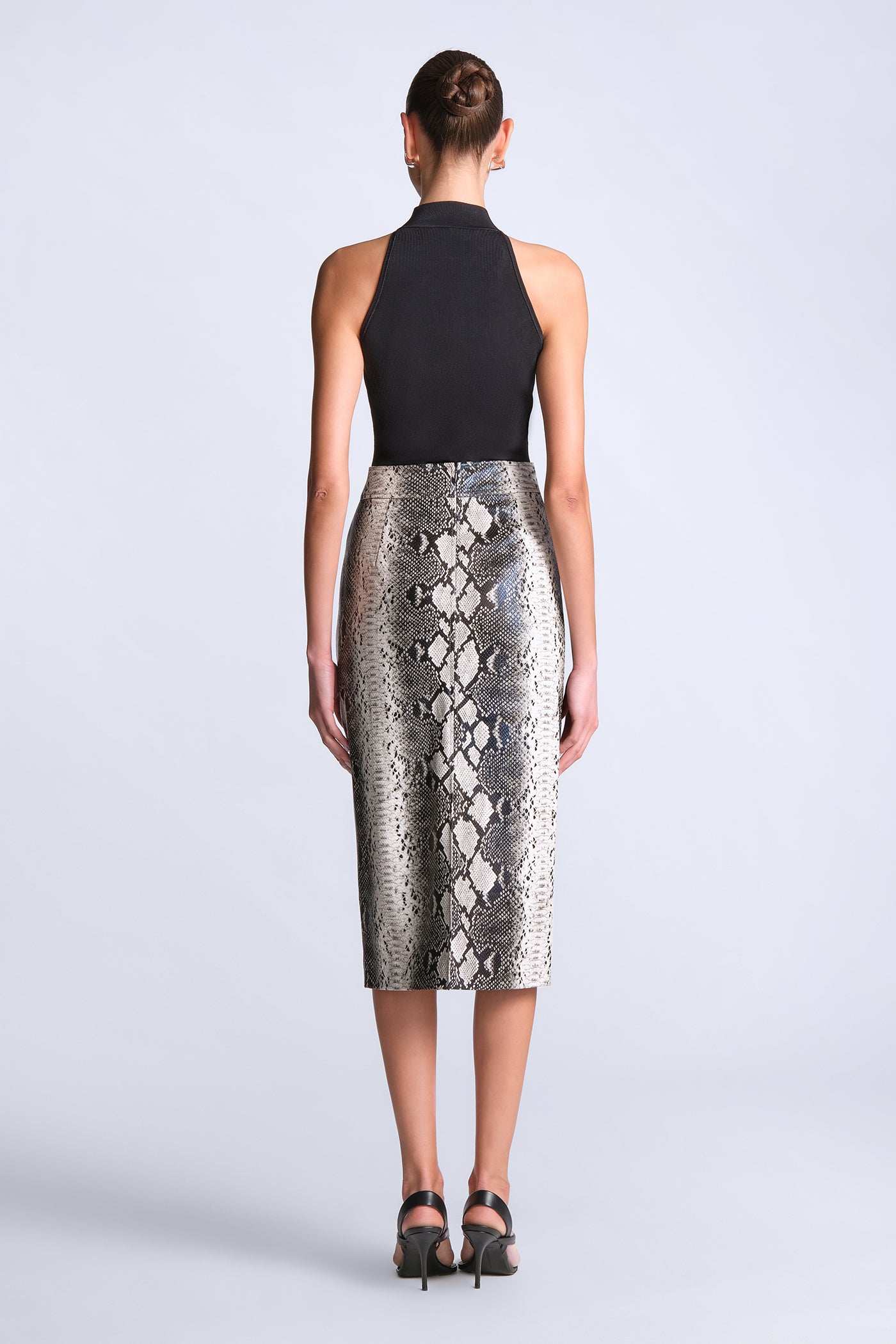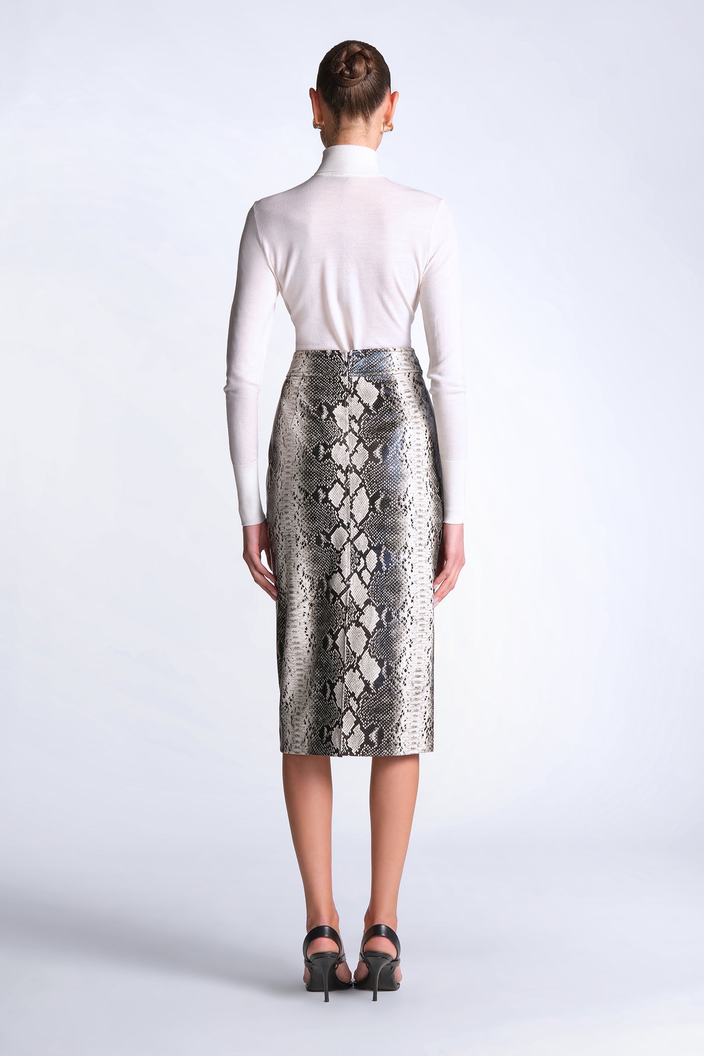 Python-print pencil skirt cut with a structured, glossy finish. Tailored with clean, streamlined seaming for a smooth, sculpted fit through the body. Bold and directional—made to style as a set or offset with crisp shirting for sharp day-to-night impact.