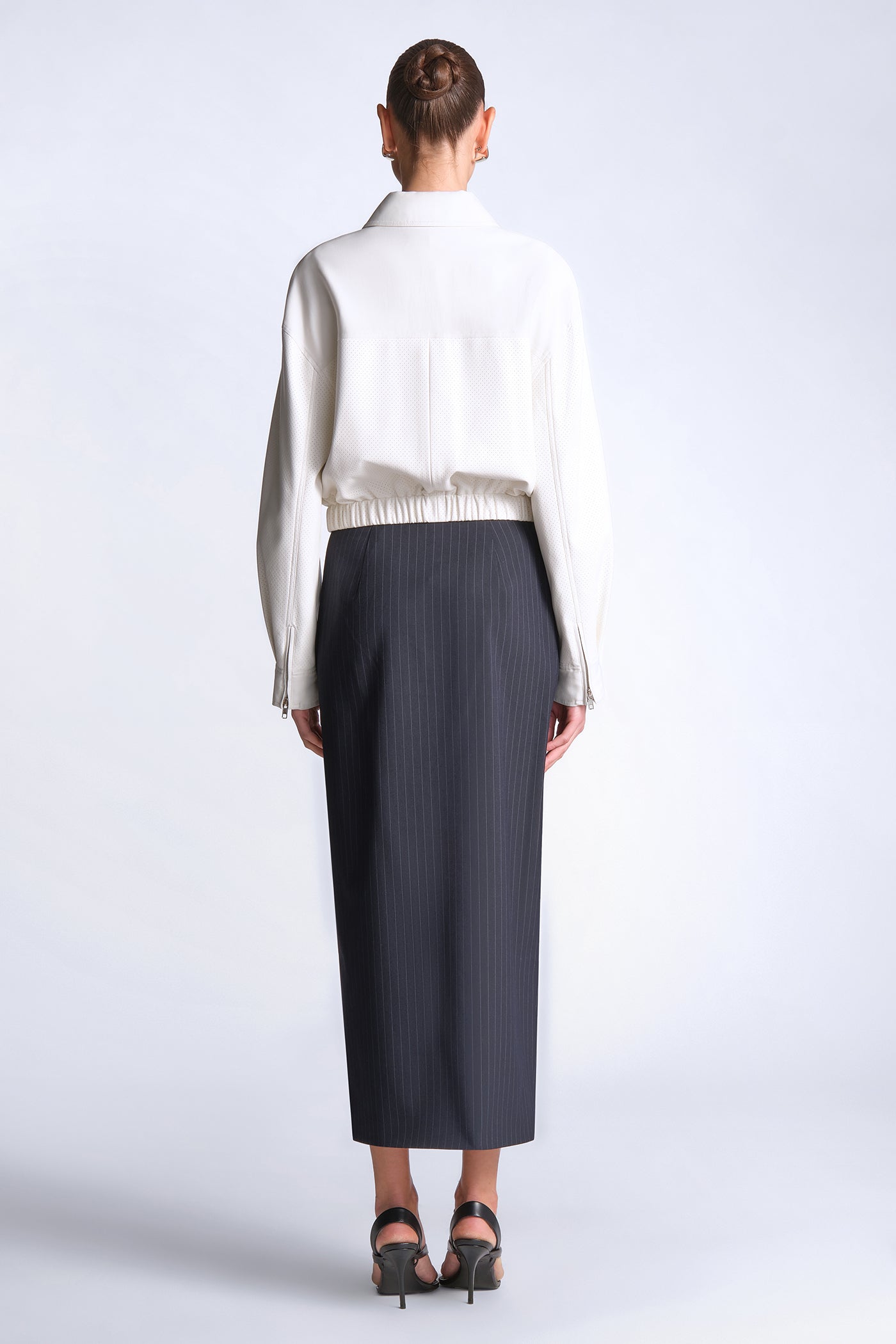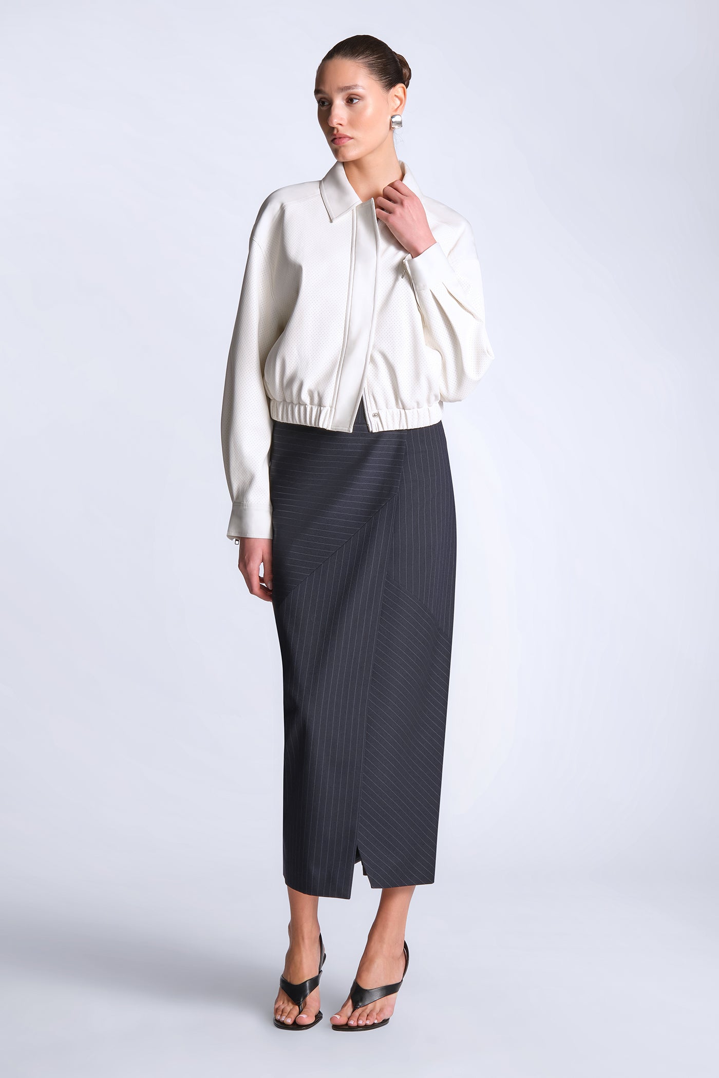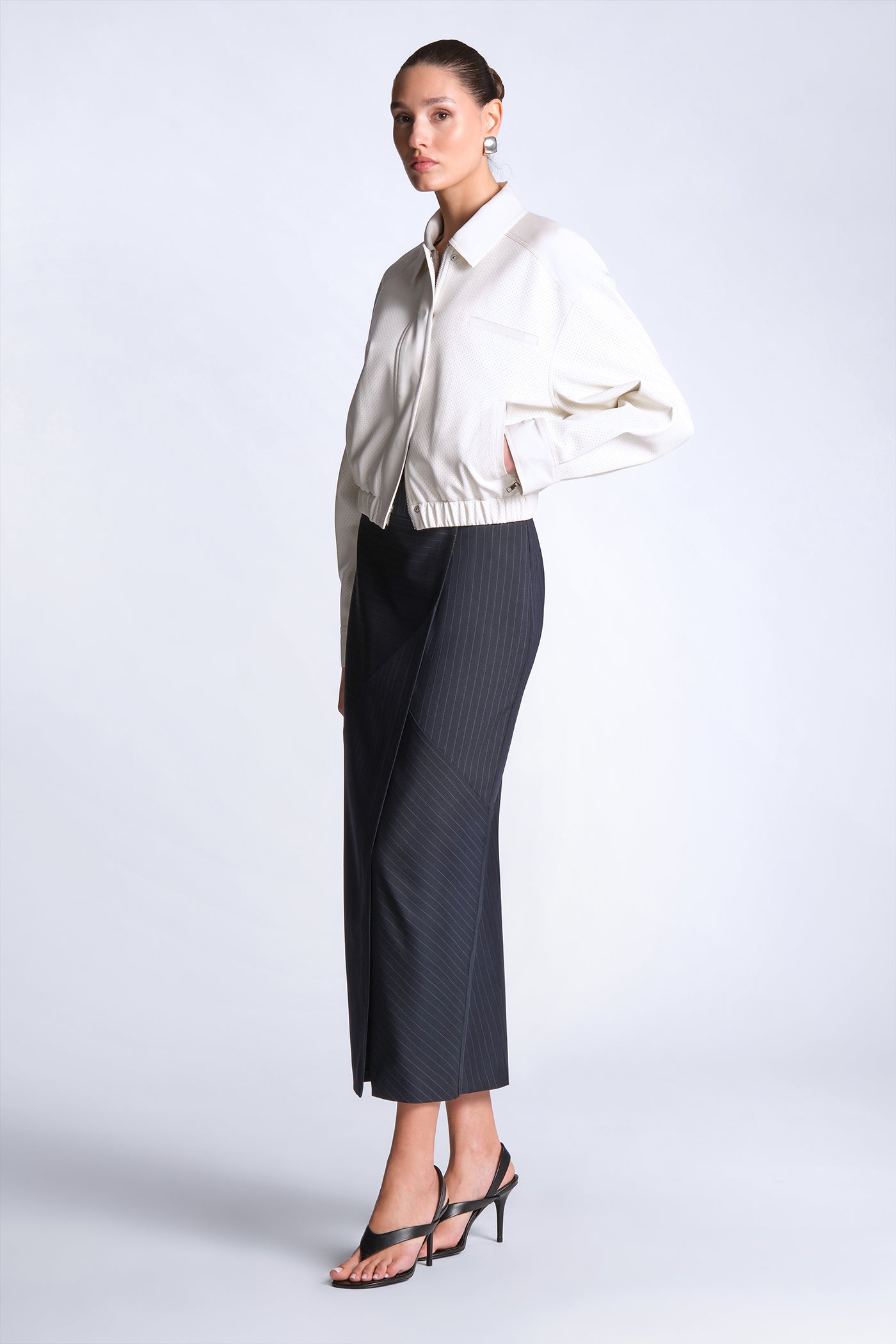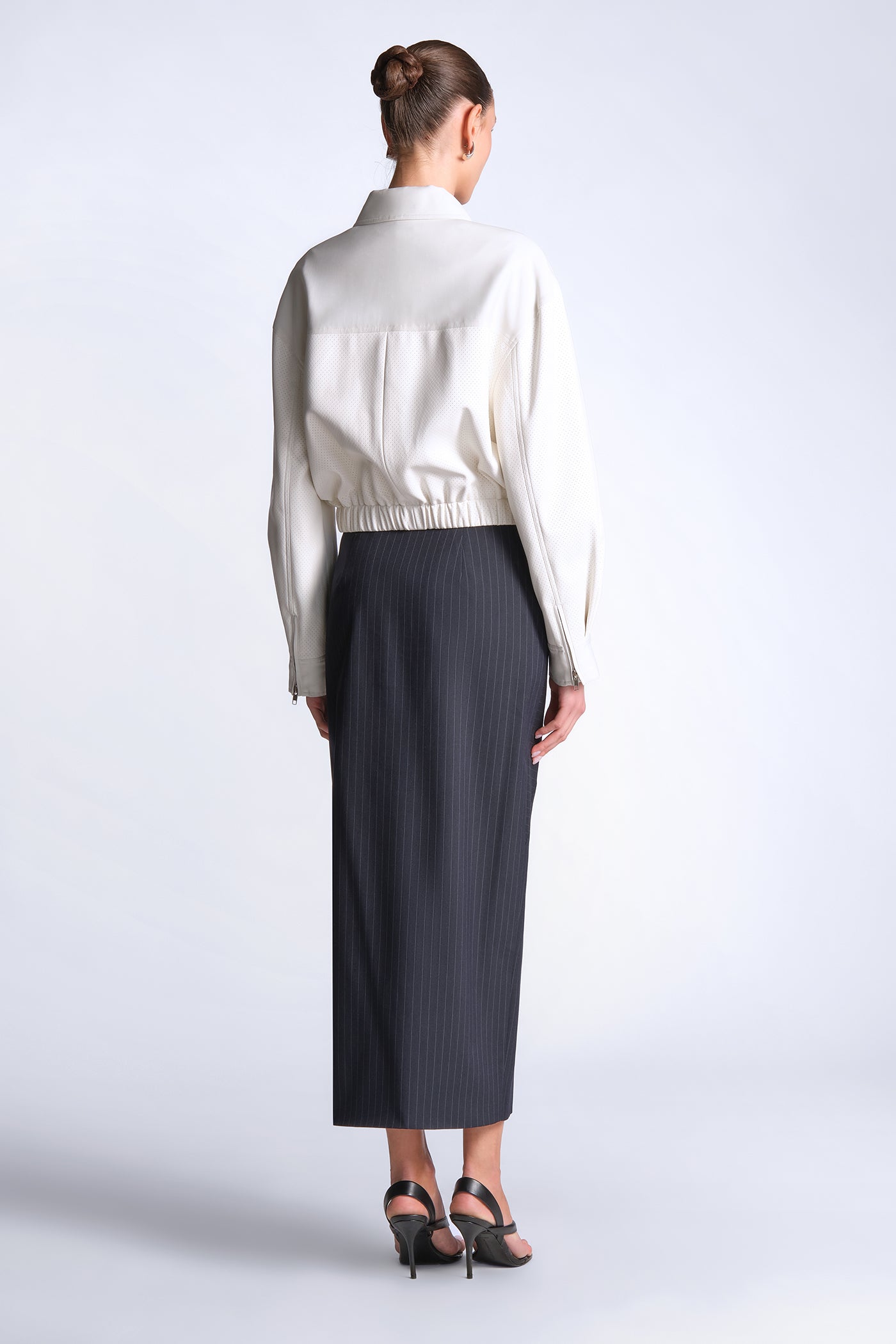 Cropped perforated jacket crafted from smooth faux leather with a subtle matte finish. Designed with a classic collar, elasticated hem, and clean paneling that adds structure while keeping the feel lightweight. A layering piece that sharpens everything from dresses to tailored separates.