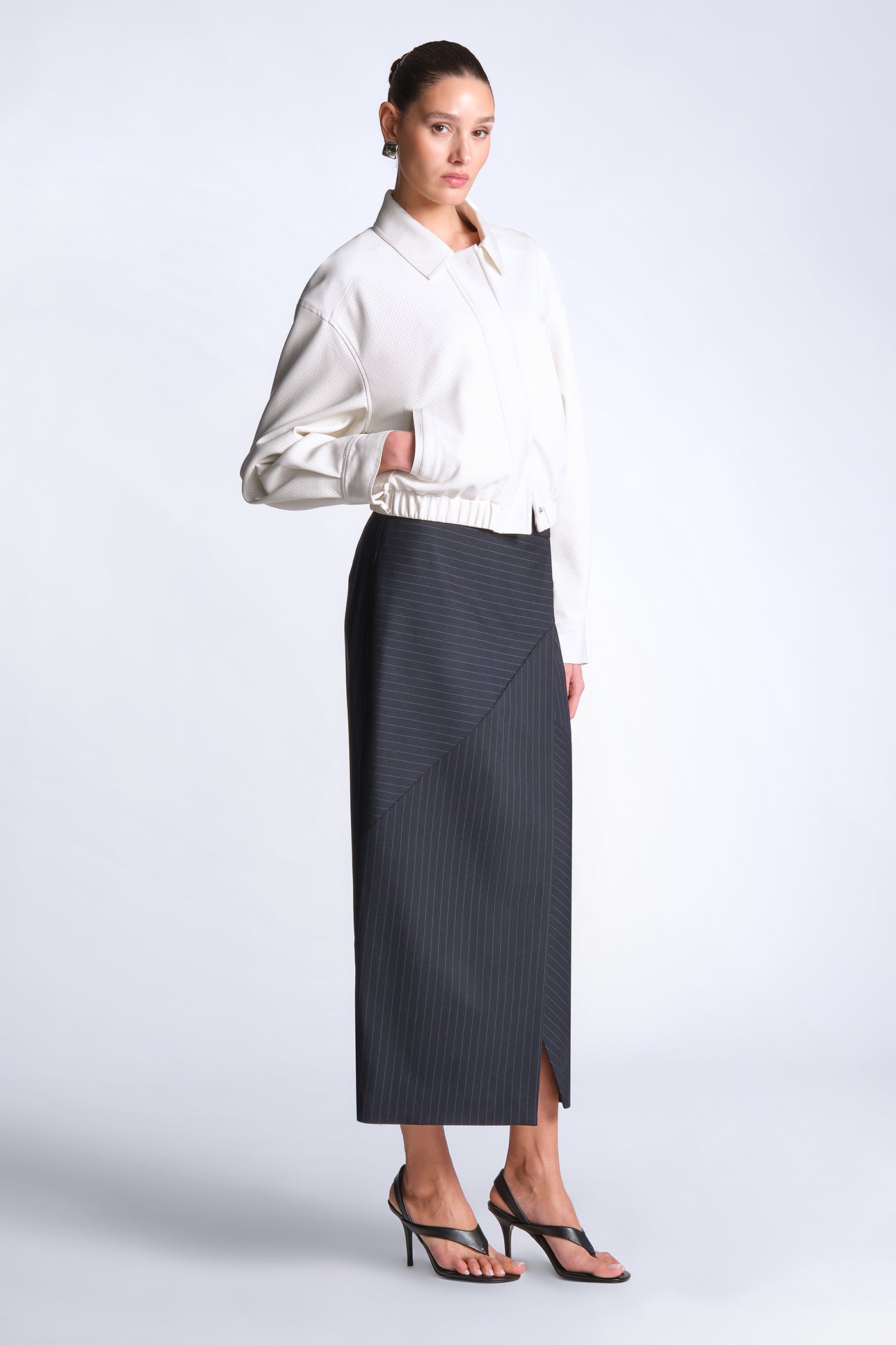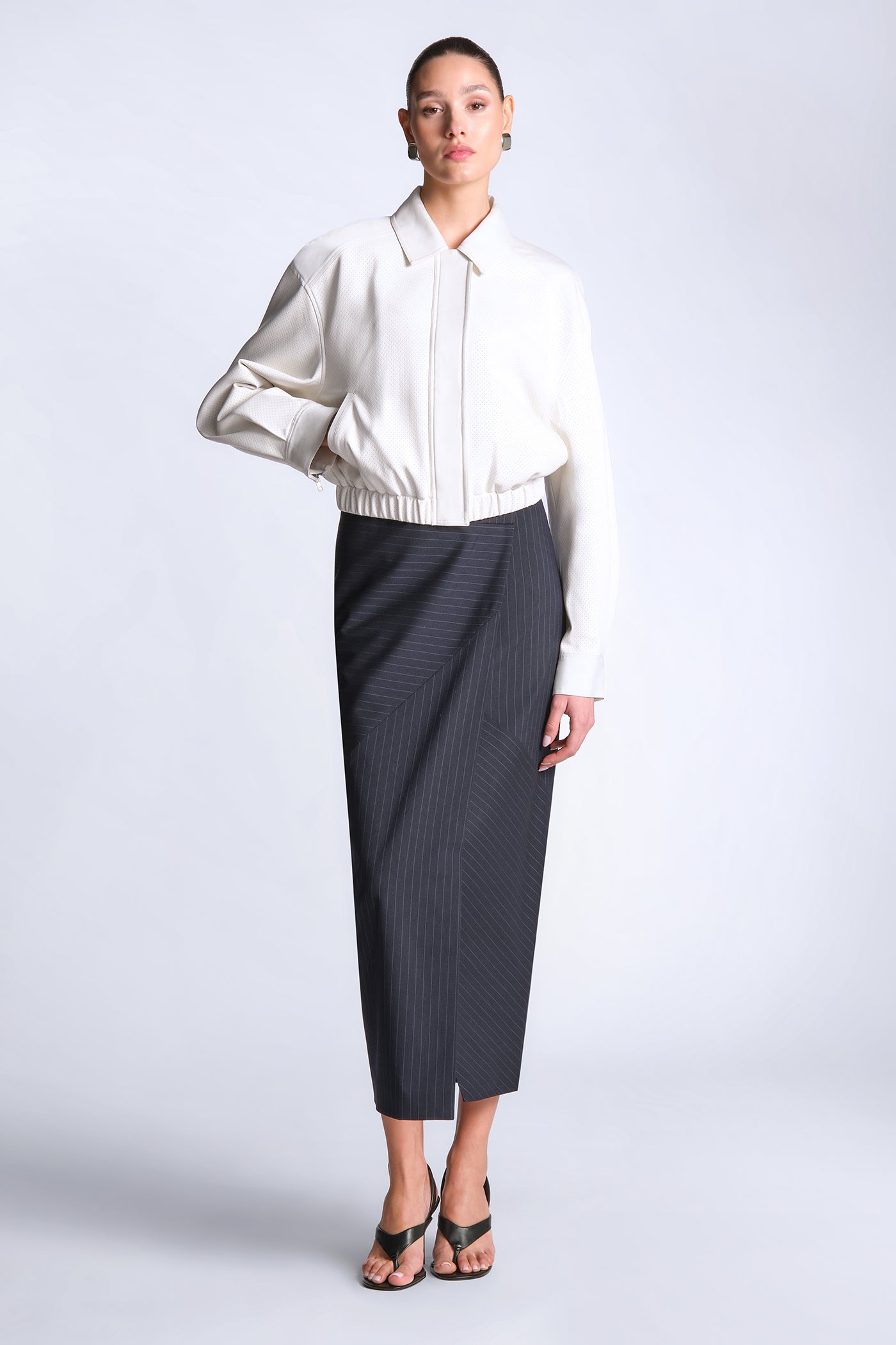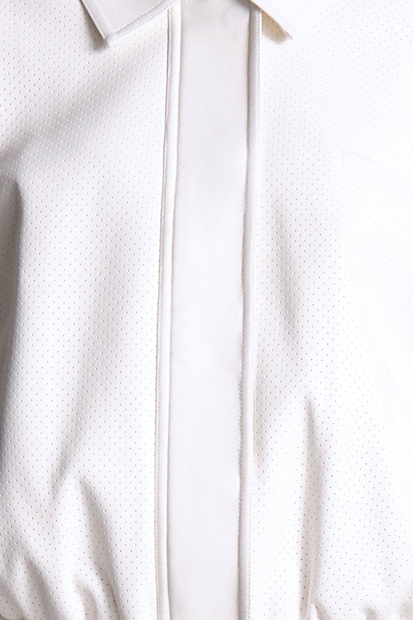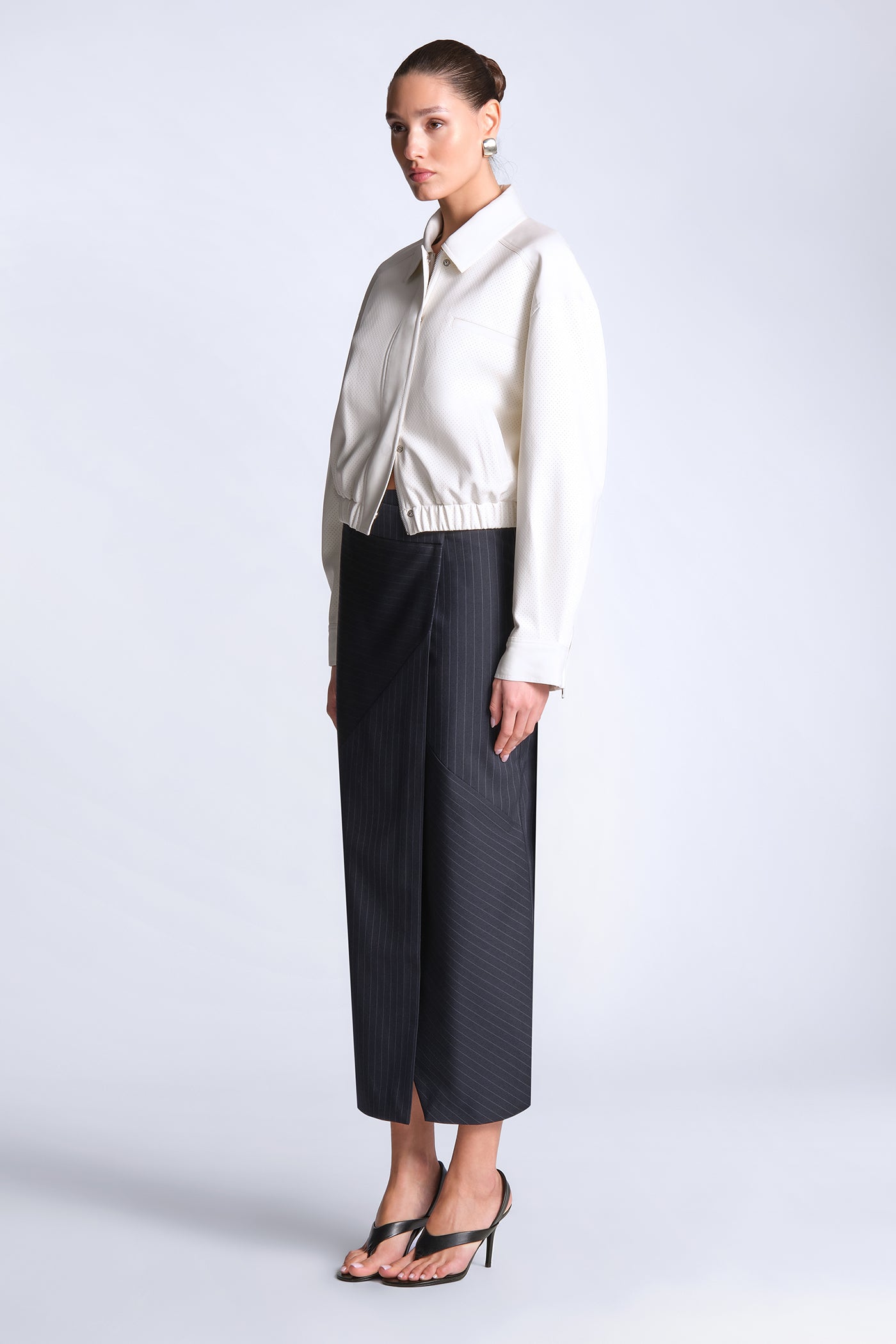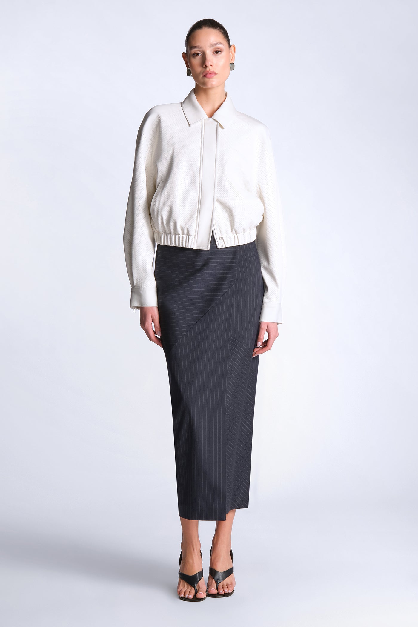 Cropped perforated jacket crafted from smooth faux leather with a subtle matte finish. Designed with a classic collar, elasticated hem, and clean paneling that adds structure while keeping the feel lightweight. A layering piece that sharpens everything from dresses to tailored separates.