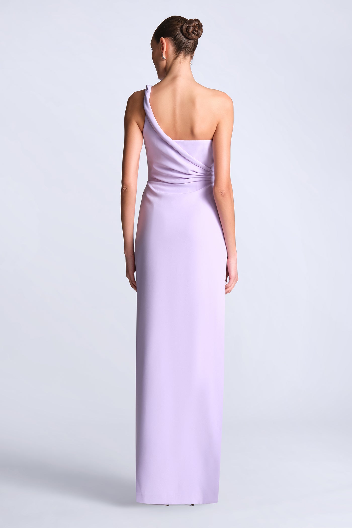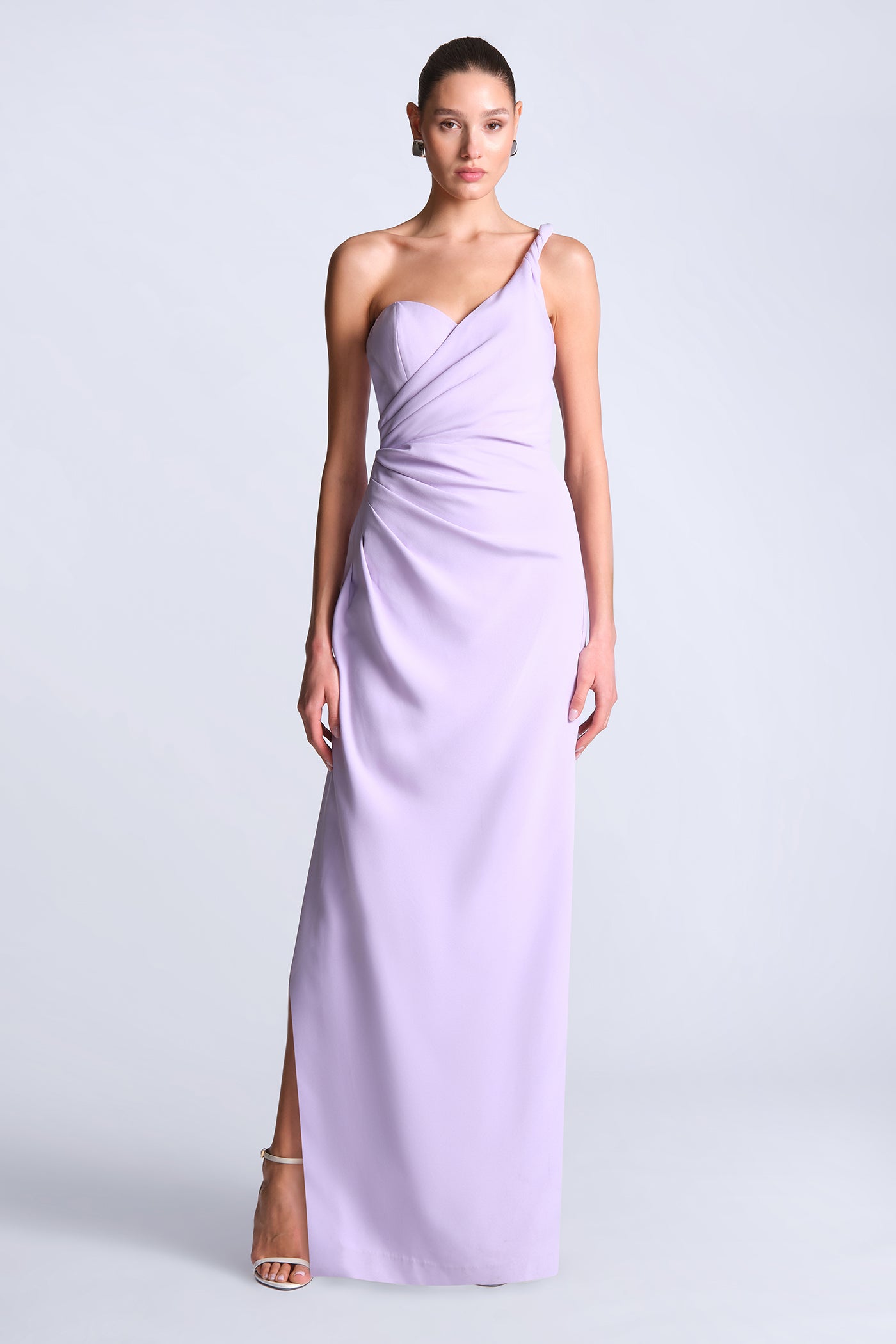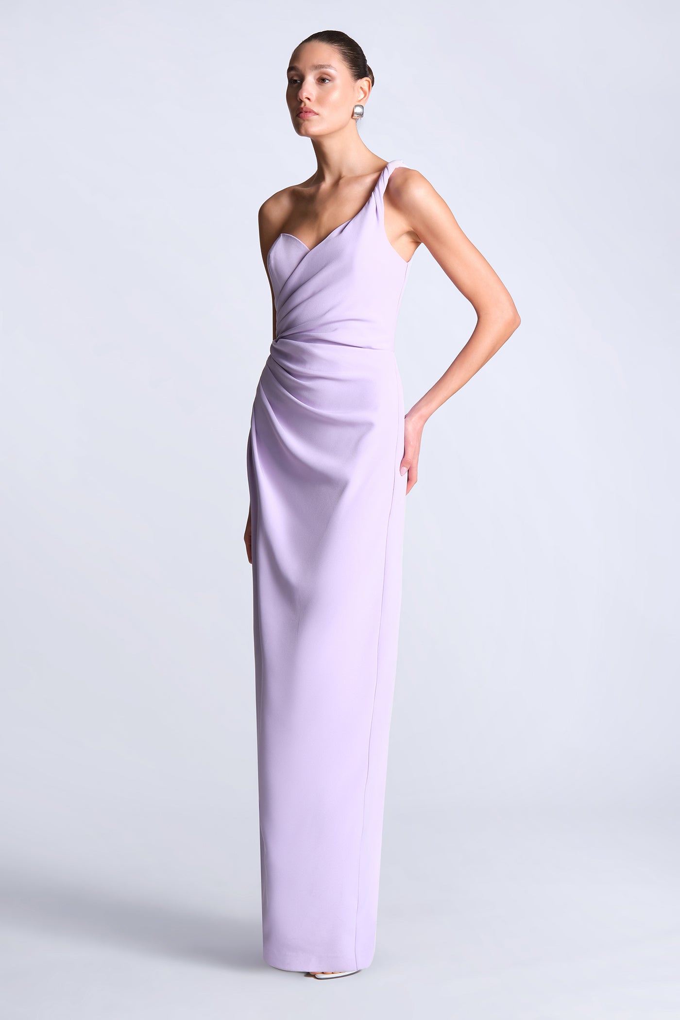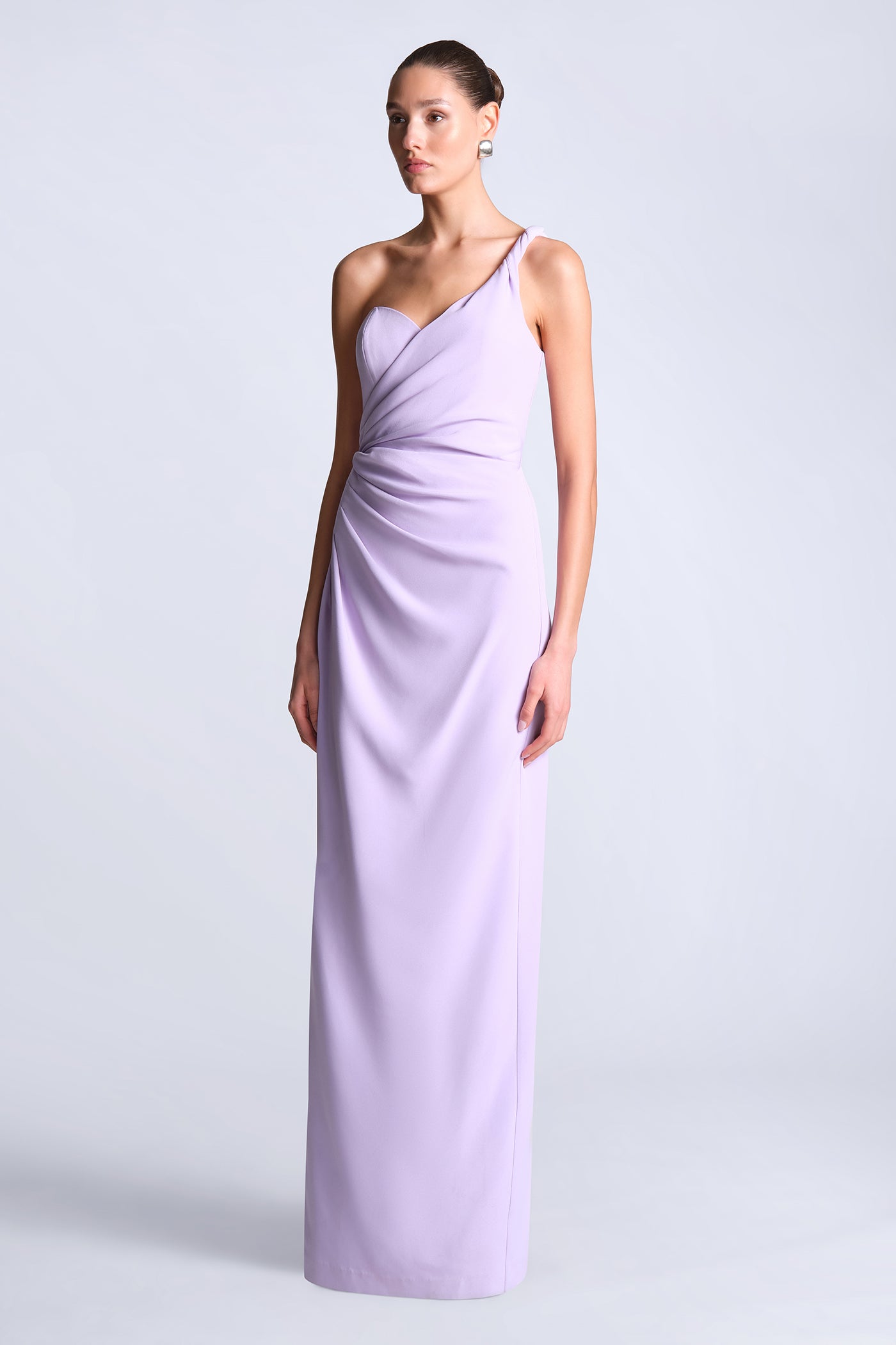 Soft crepe one-shoulder gown with a sculpted draped bodice and gathered detailing that shapes the waist. Finished with a sleek column skirt for a long, refined line. A graceful pick for weddings, galas, and evening celebrations.