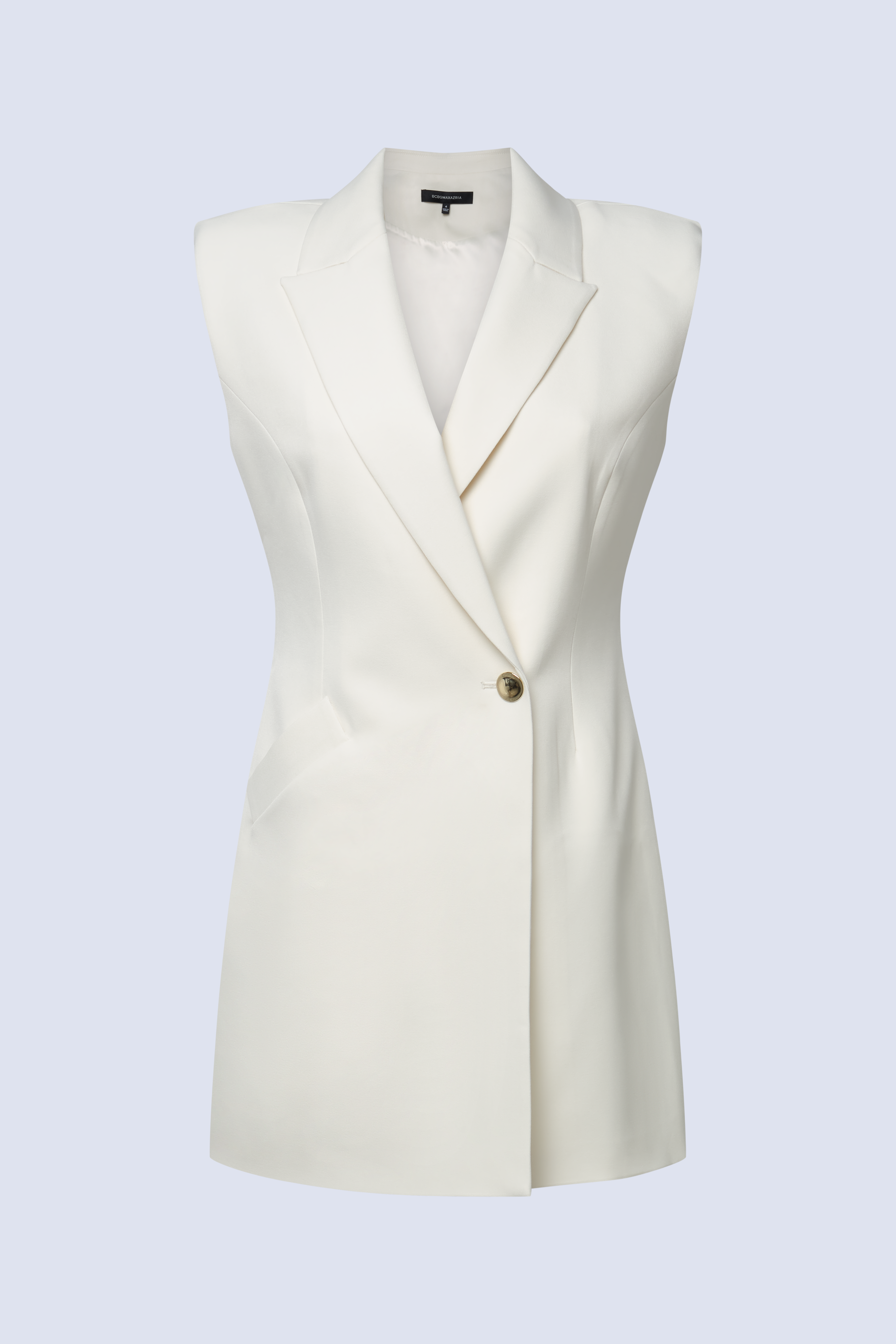 Sleeveless crepe blazer dress in crisp white, defined by strong shoulders and a single gold button closure. Tailored seams shape the waist for a sharp, modern line. A fresh, polished choice for work events and nights out.