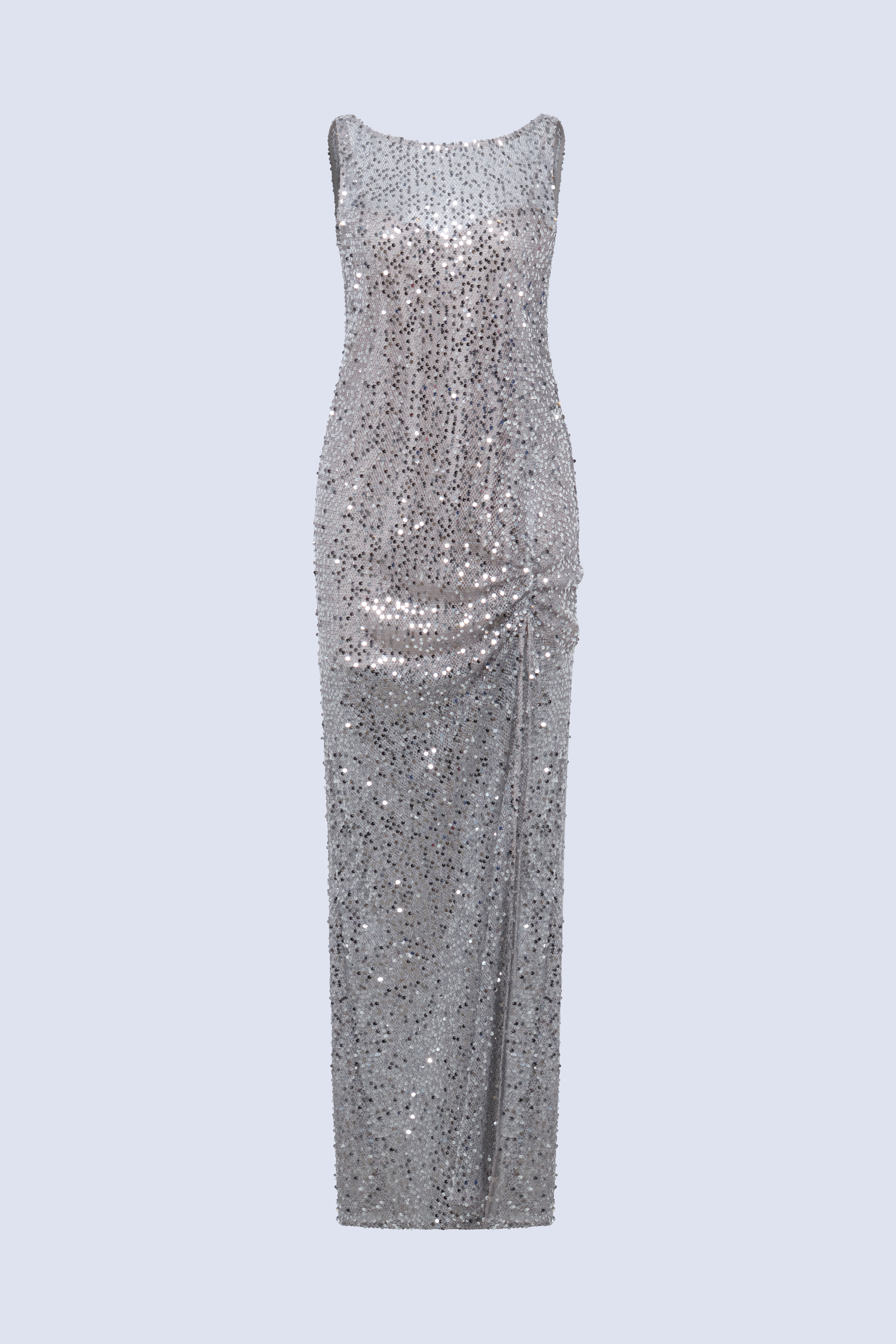 Silver sequin gown crafted with a fluid, light-catching finish that glimmers with every step. Designed with a clean, elongated line and a dramatic open back for understated allure. A refined choice for red carpet moments, premiere events, and evening receptions.