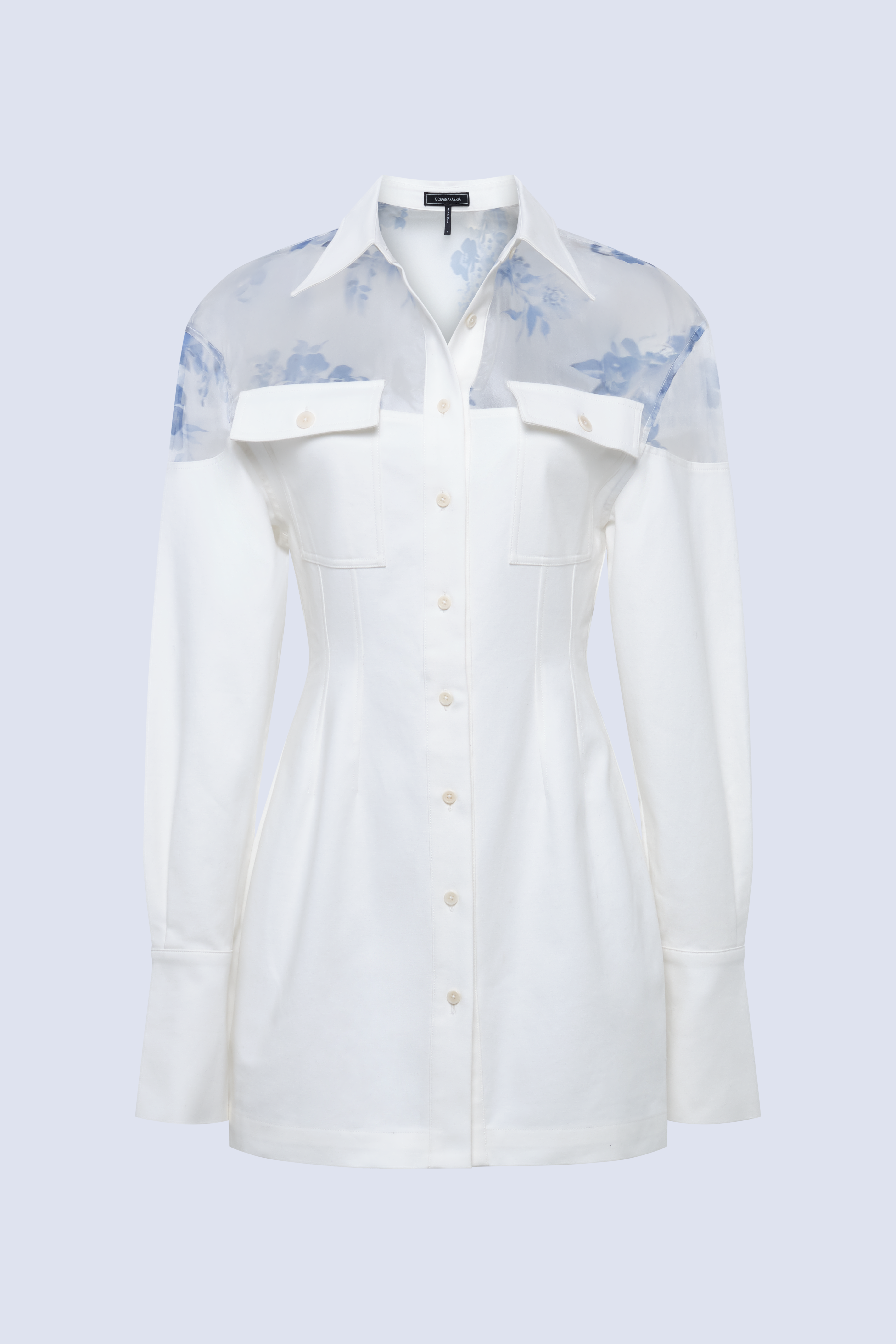 Mixed-media shirt dress that uses sheer contrast to create the illusion of layering. Designed with a crisp woven body and a floral organza yoke that subtly softens the shoulders and sleeves. Finished with a classic collar and button-front closure, moving seamlessly from polished daytime wear to evening styling.