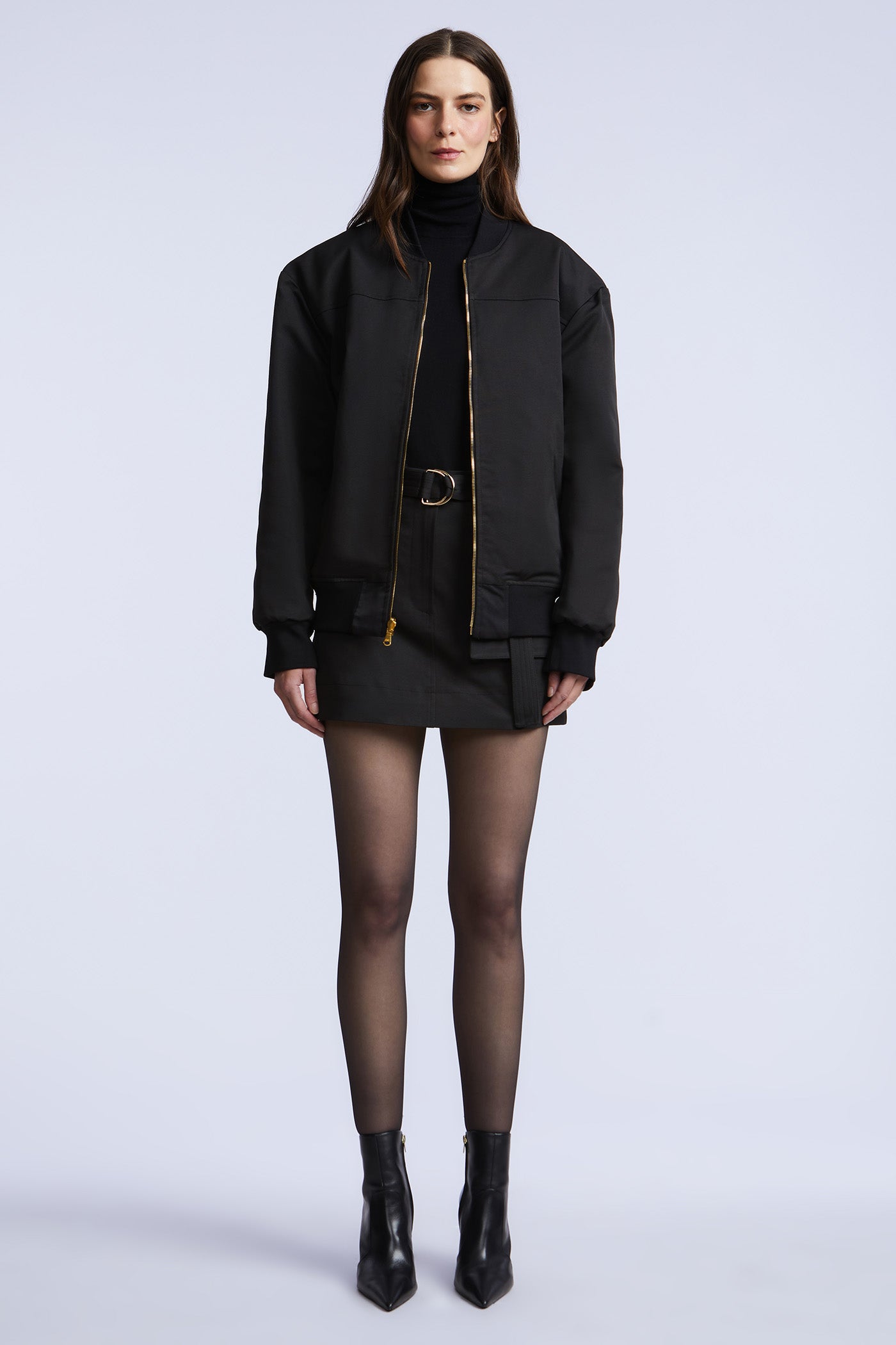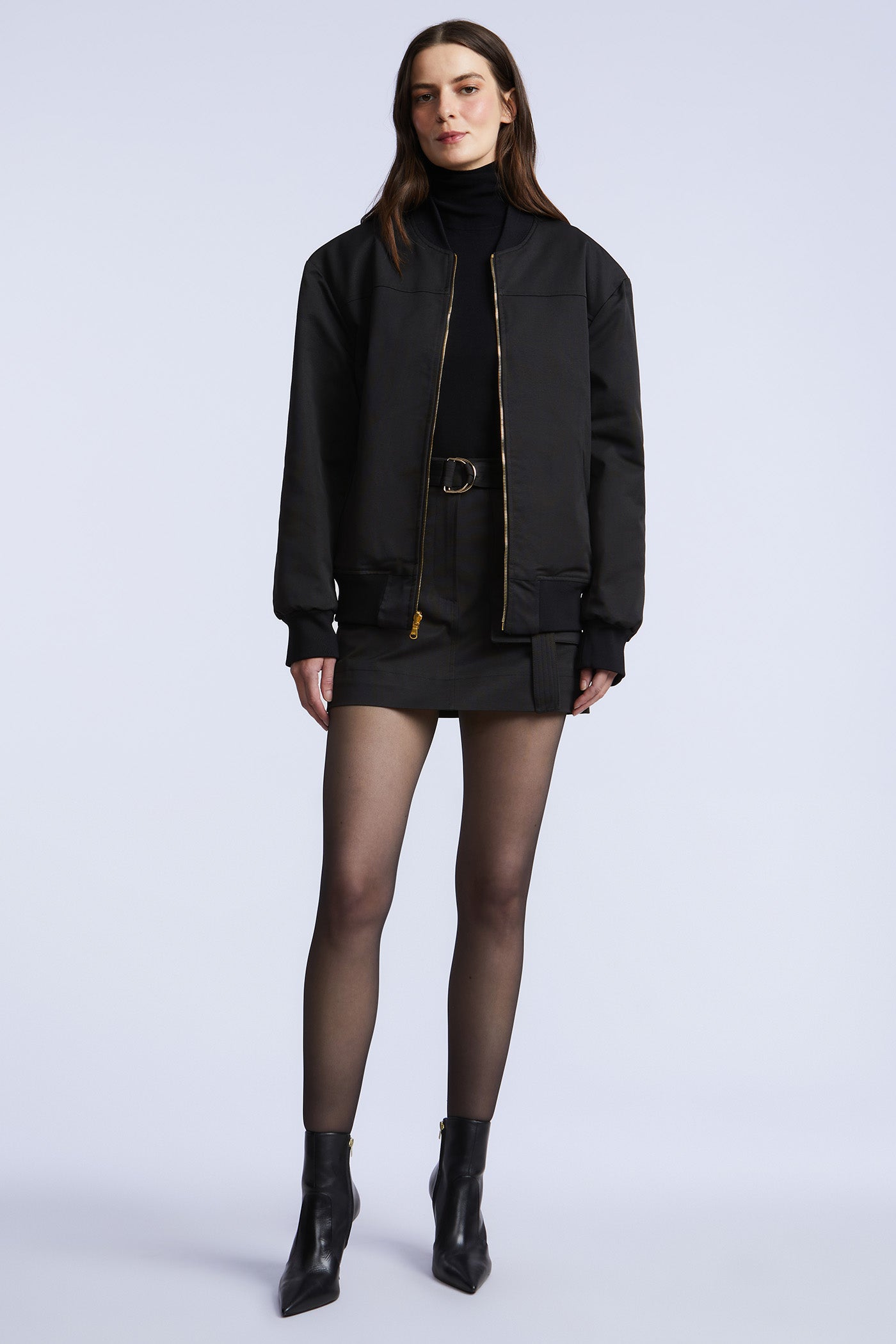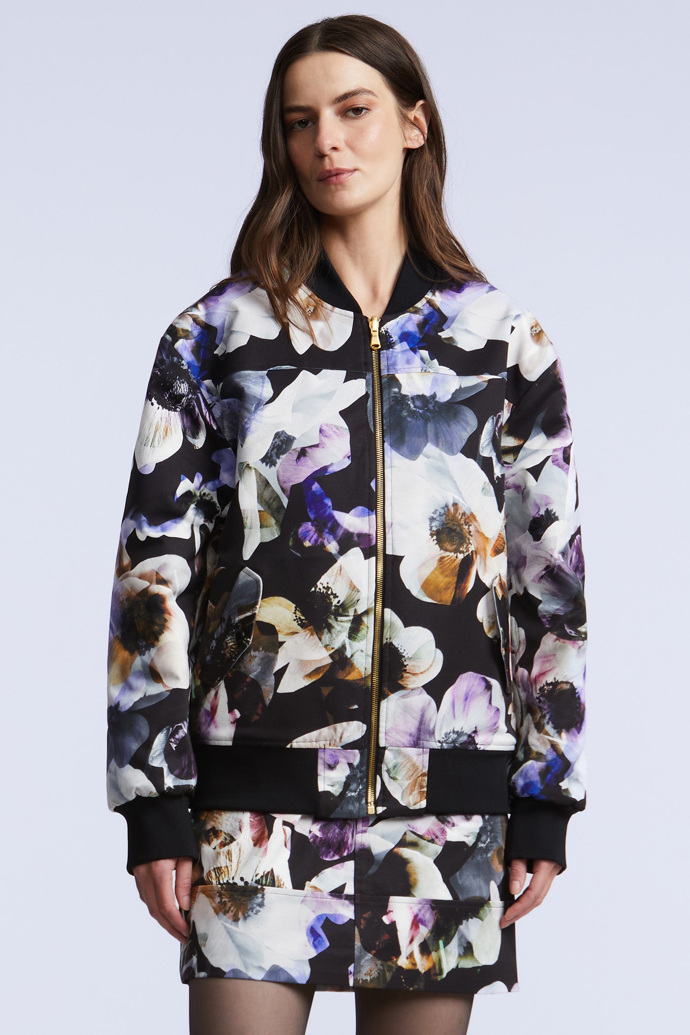 Reversible bomber jacket crafted from a structured twill with soft sheen and light padding. One side features a painterly floral print on black; the other a clean solid with minimal lines. Ribbed trim and a zip front keep it classic. A double-duty layer that flips the script.