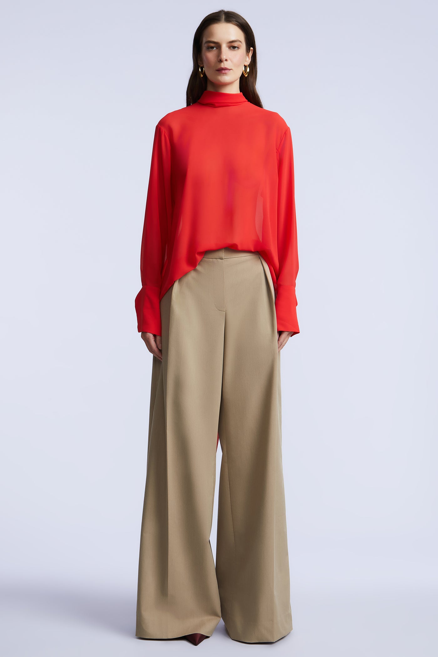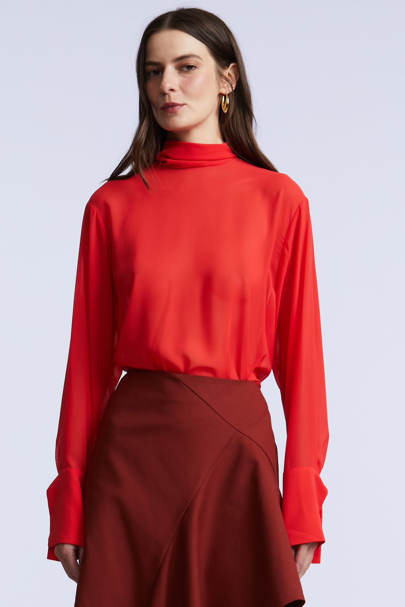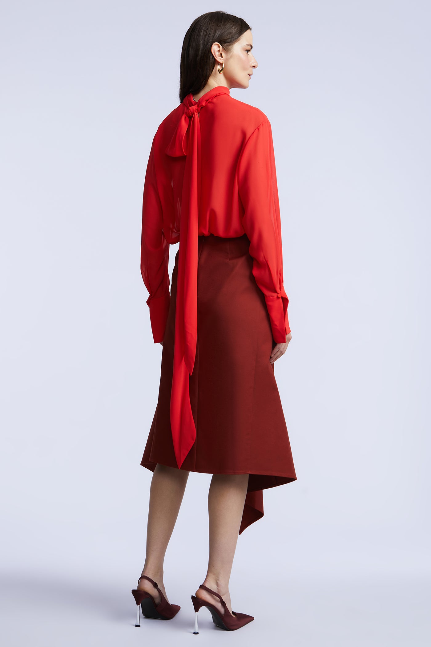 Sheer scarlet blouse crafted from fluid chiffon with a light, airy drape. Designed with soft volume and elongated back ties that create movement from every angle. A refined layer that brings quiet drama to polished looks.