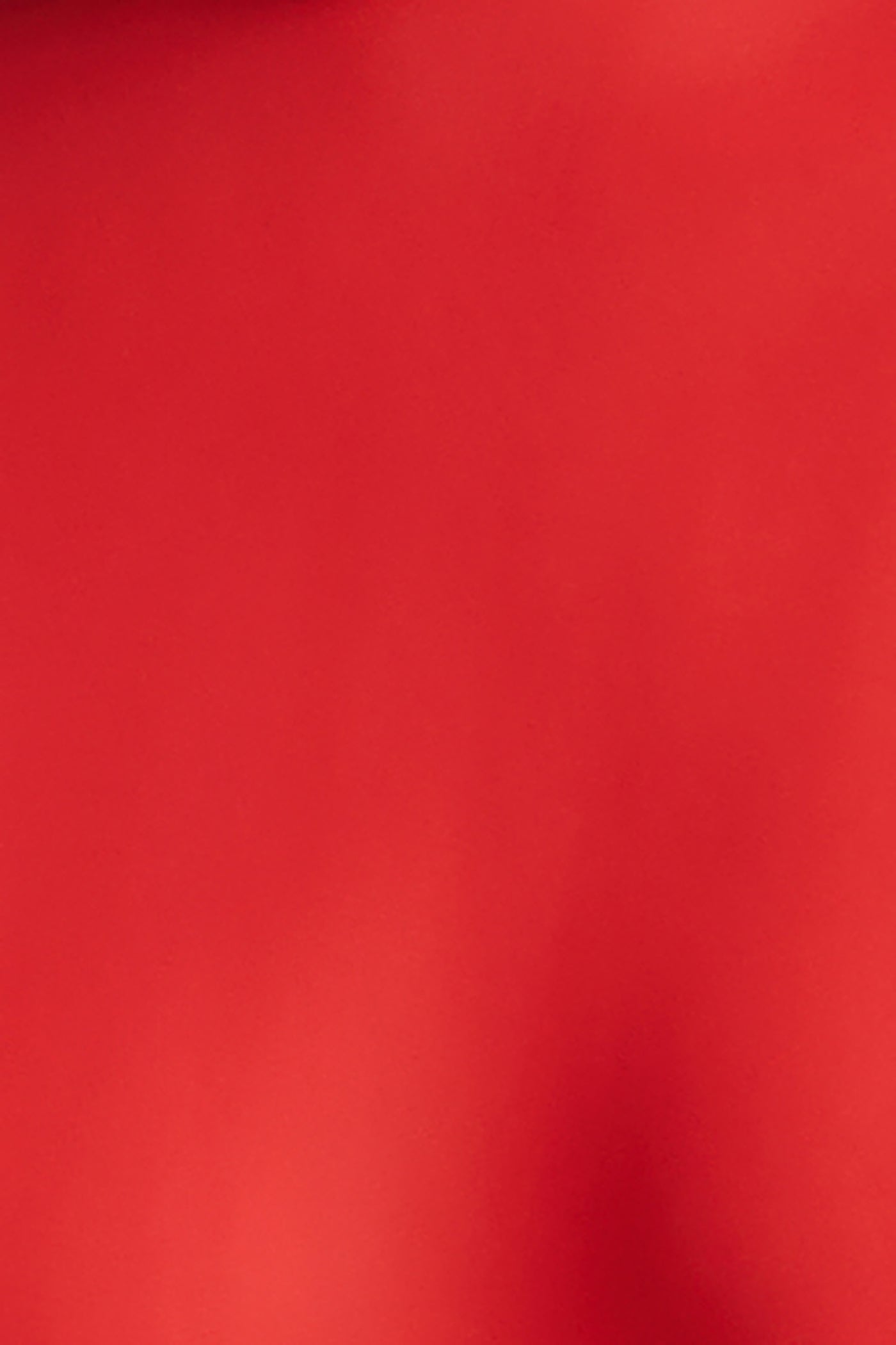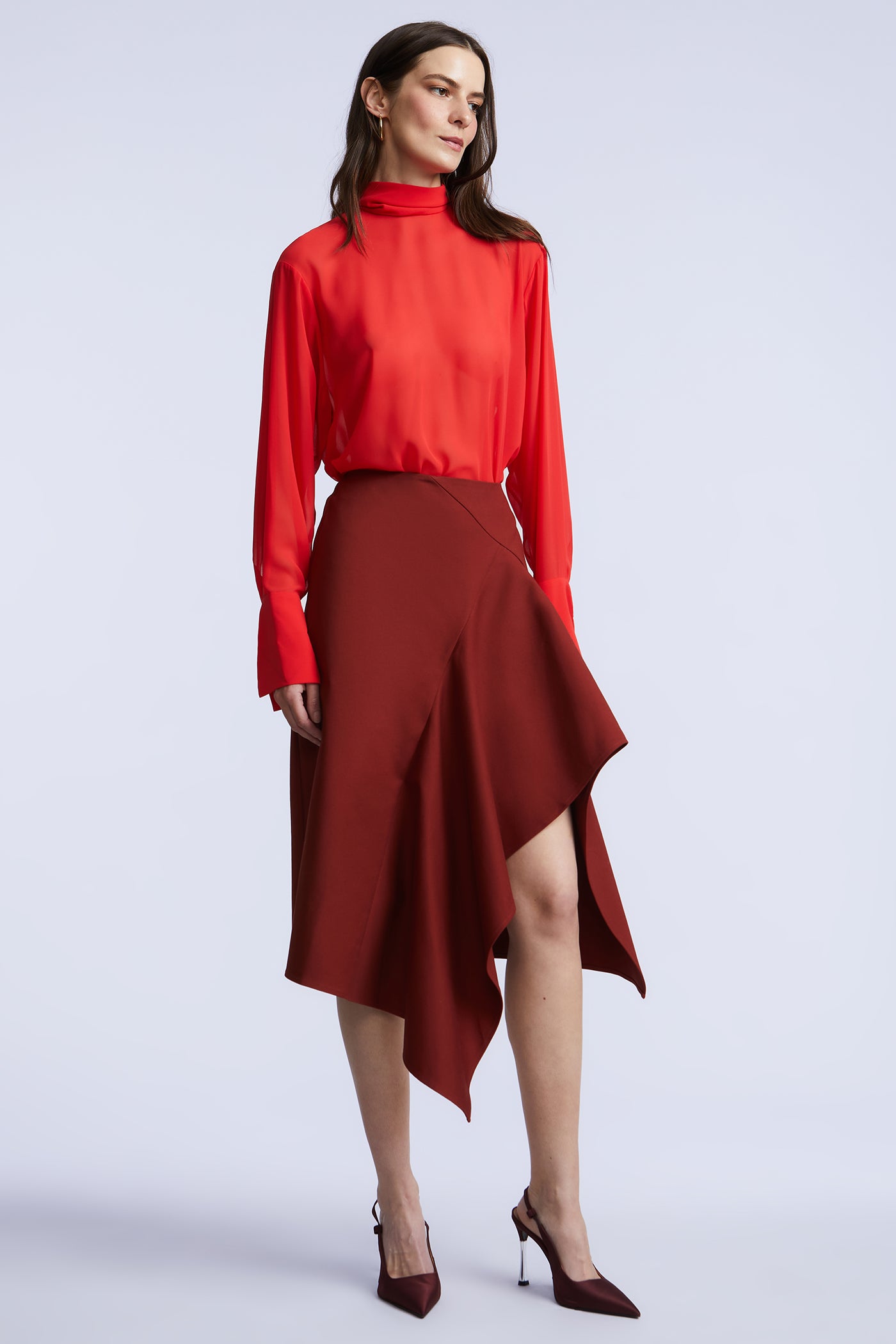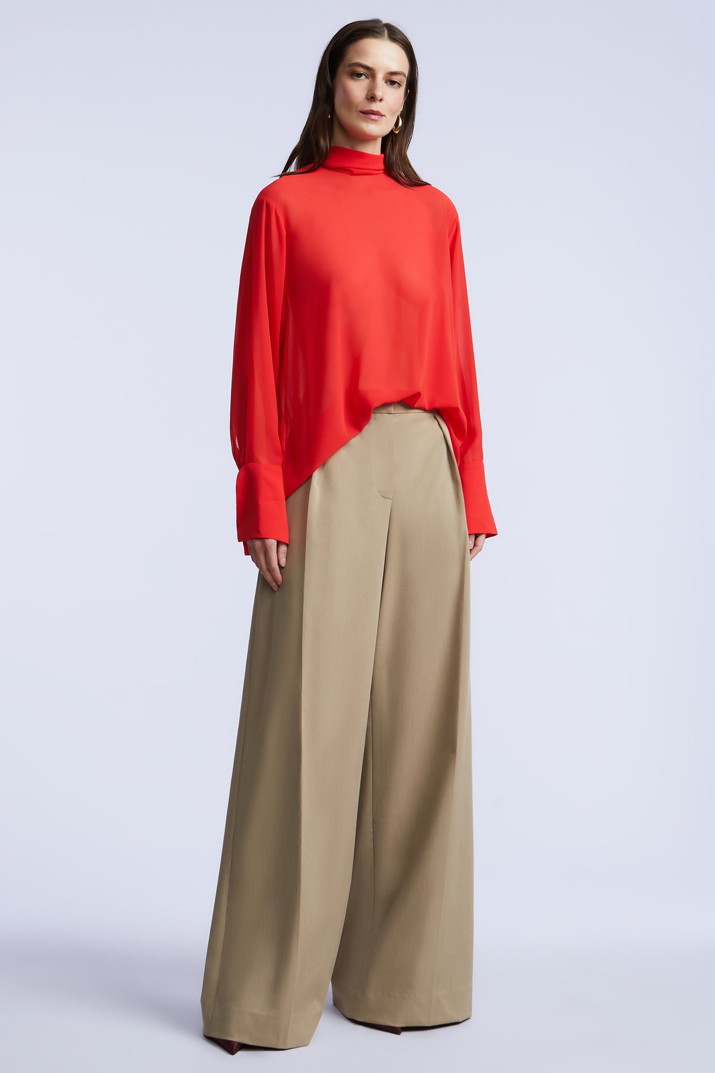 Sheer scarlet blouse crafted from fluid chiffon with a light, airy drape. Designed with soft volume and elongated back ties that create movement from every angle. A refined layer that brings quiet drama to polished looks.