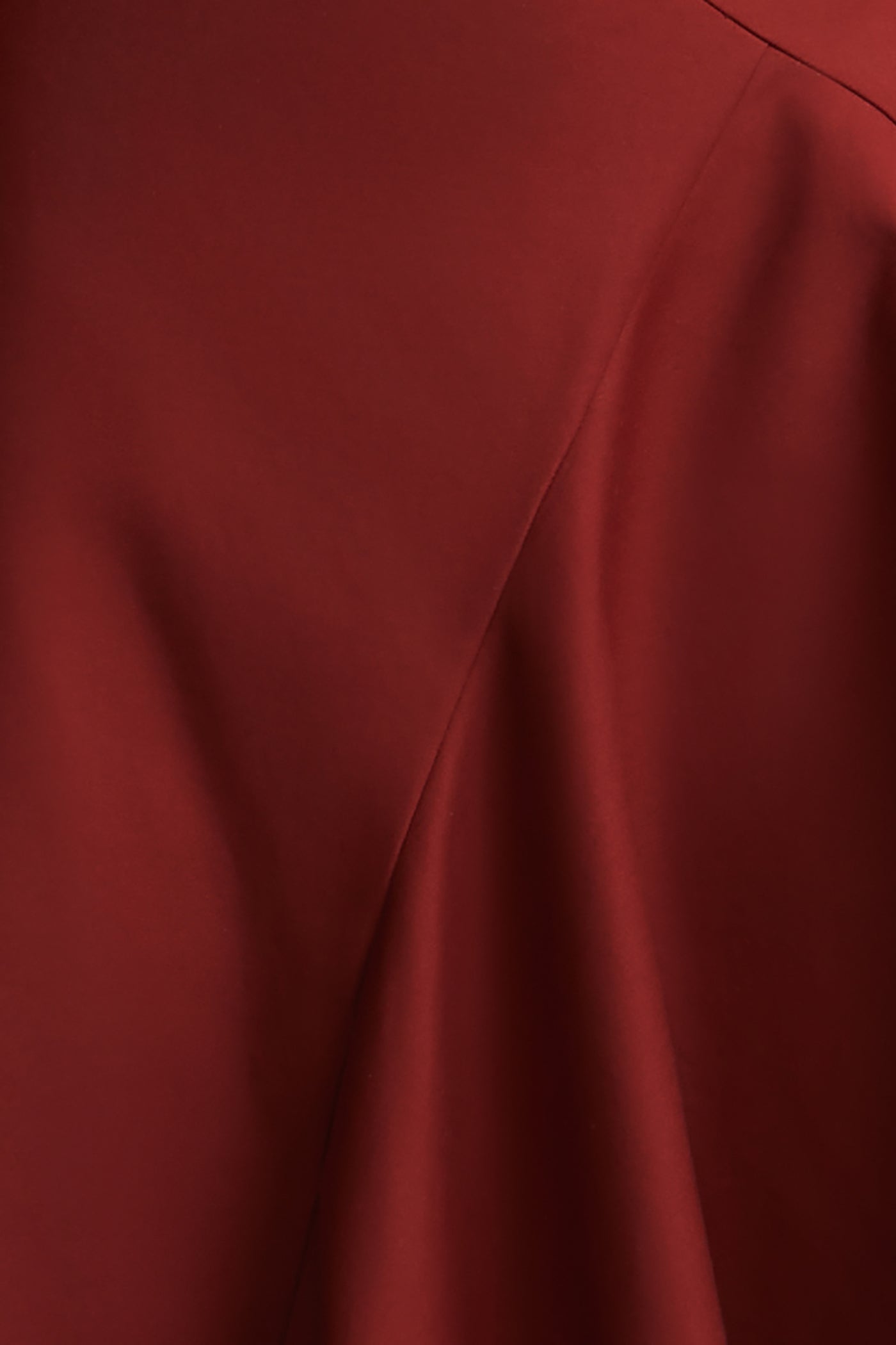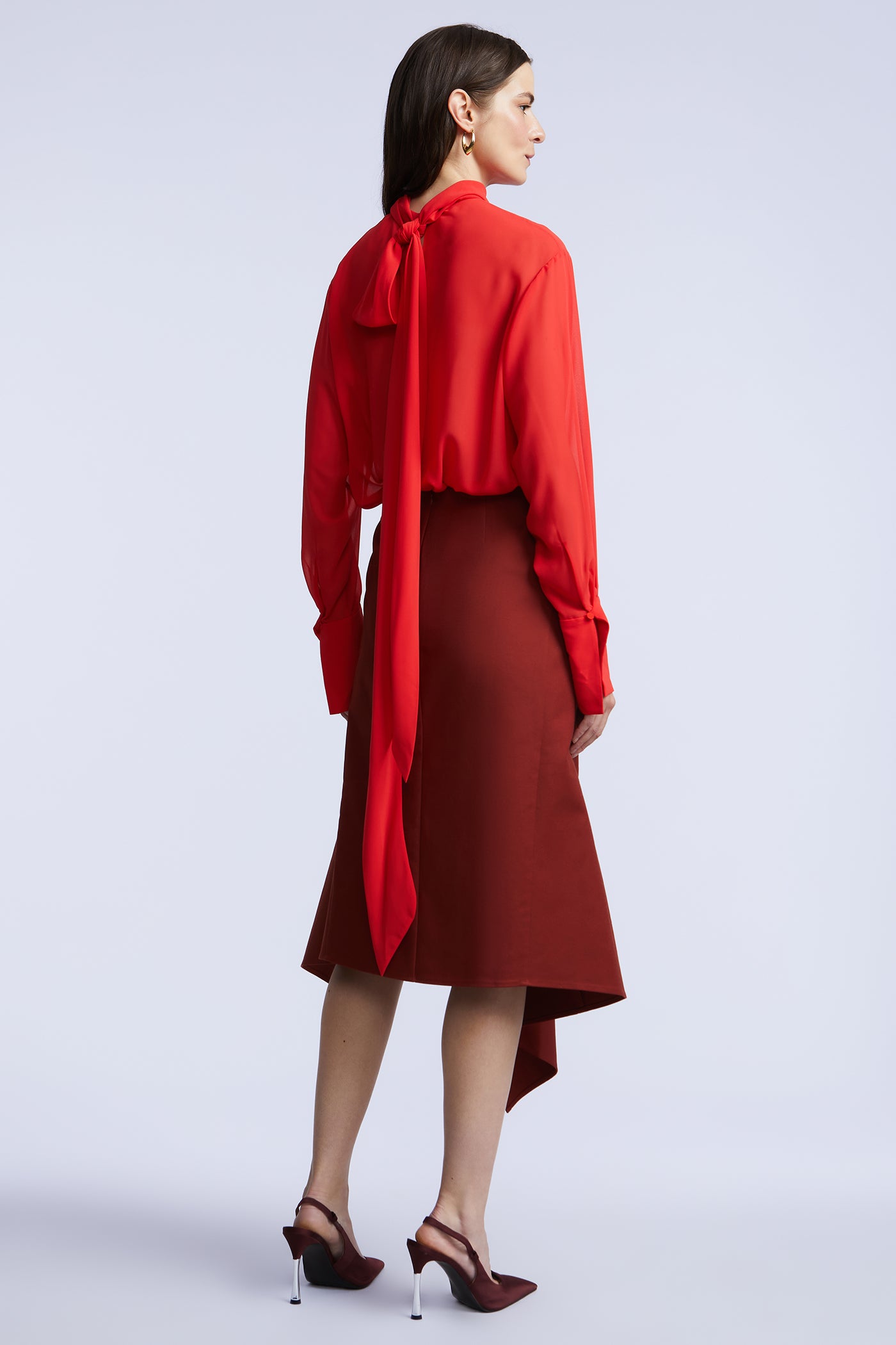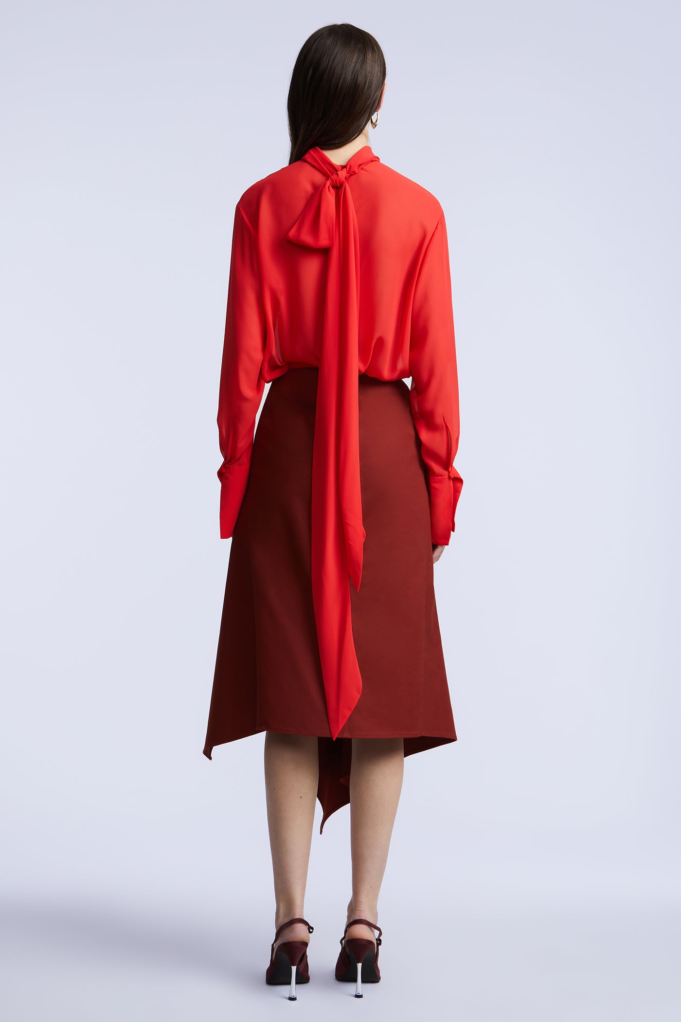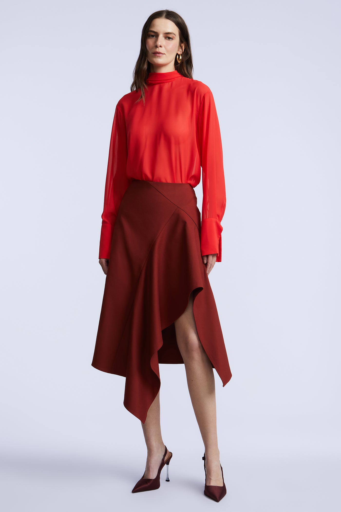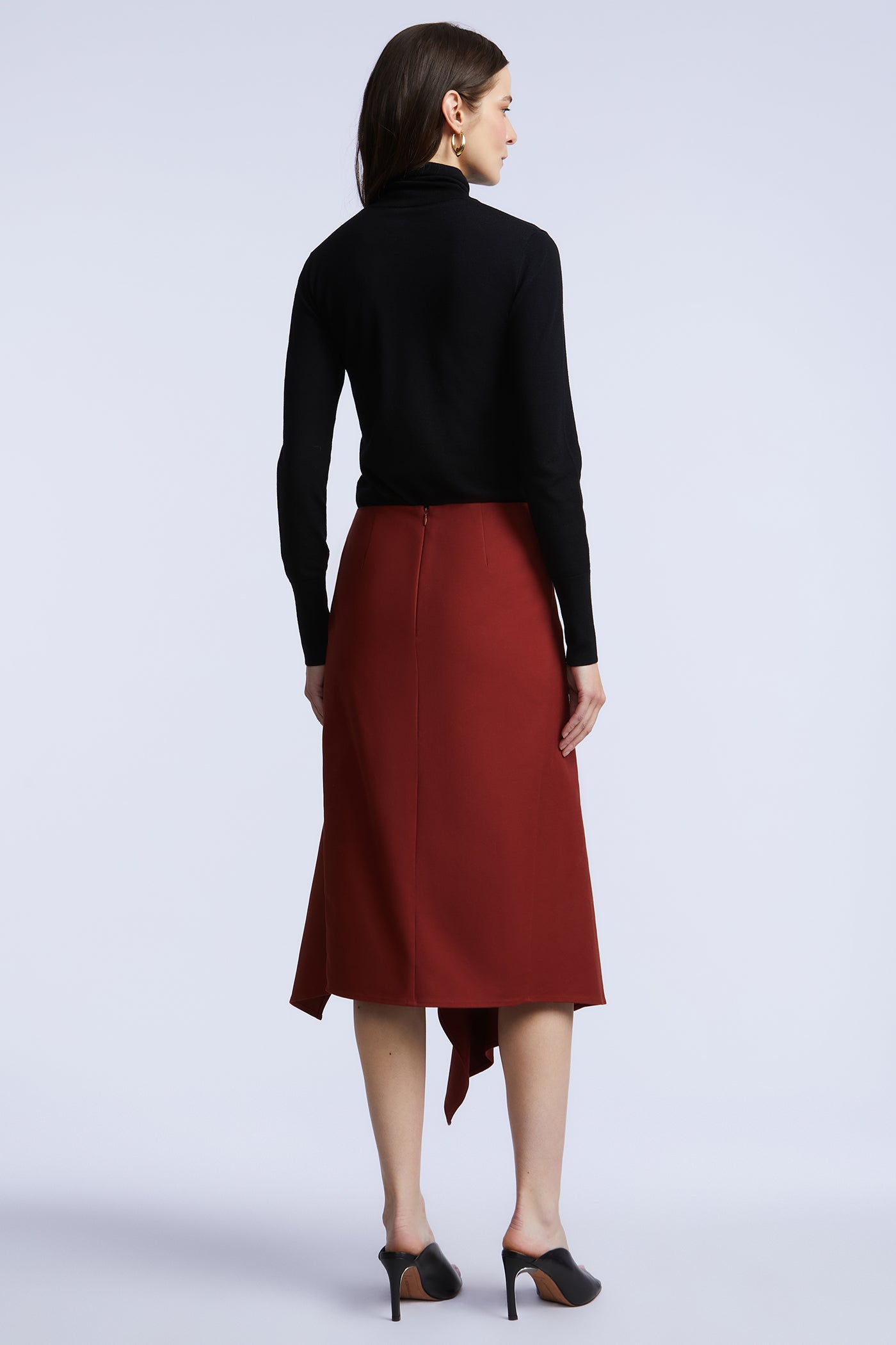 Asymmetric rust crepe skirt crafted with a smooth, fluid hand. Designed with an angled overlay that creates clean movement and quiet dimension. A refined essential for modern city settings.