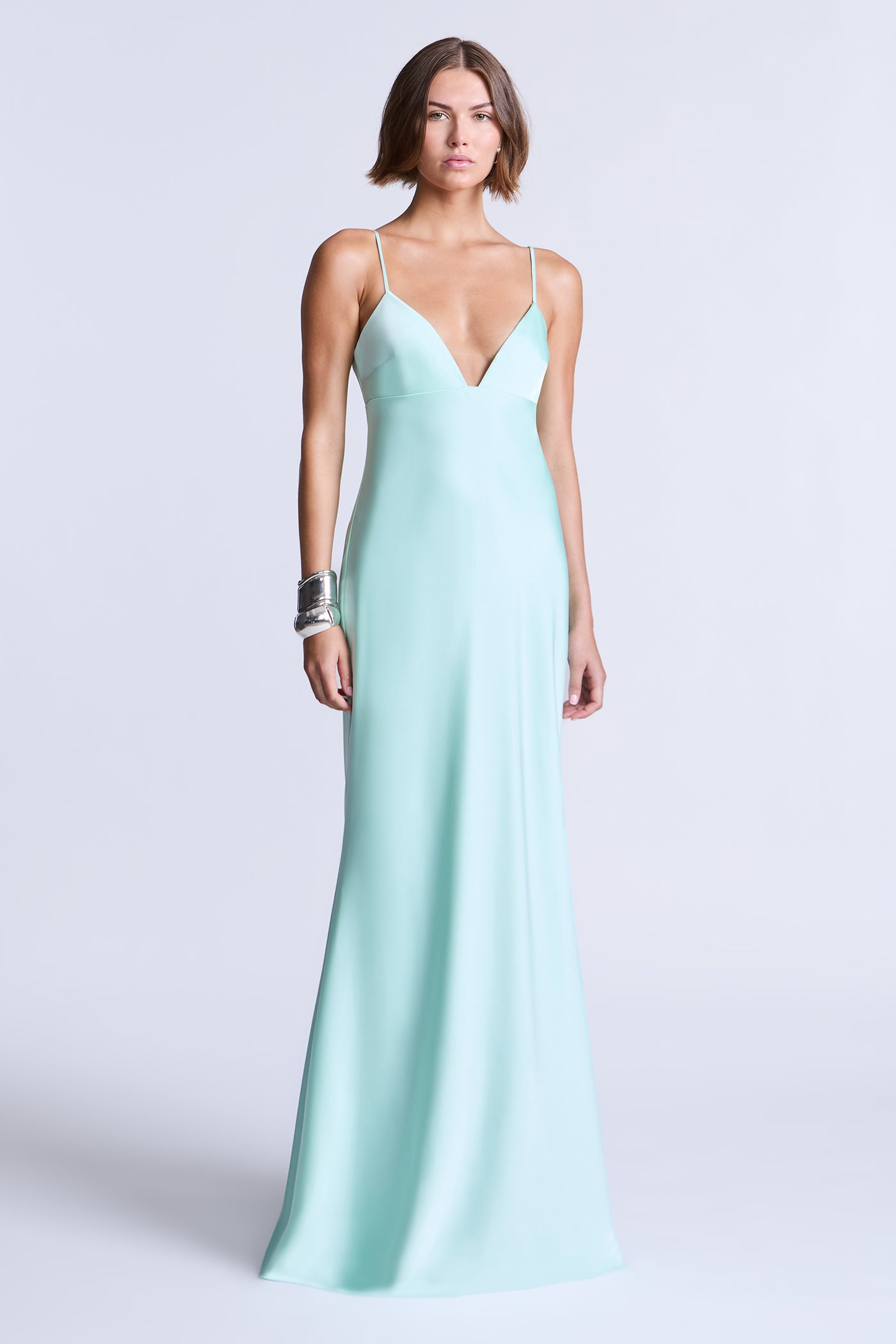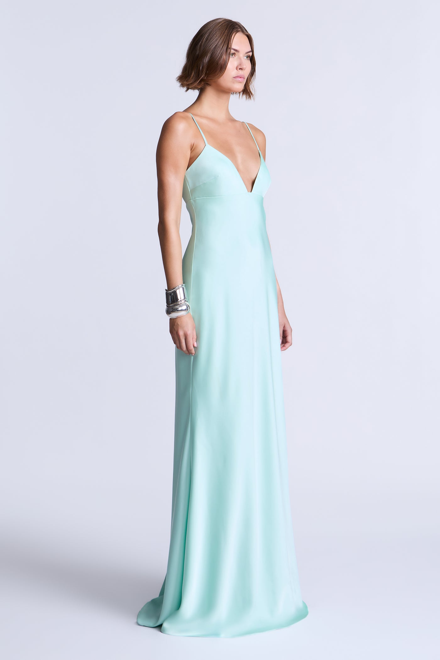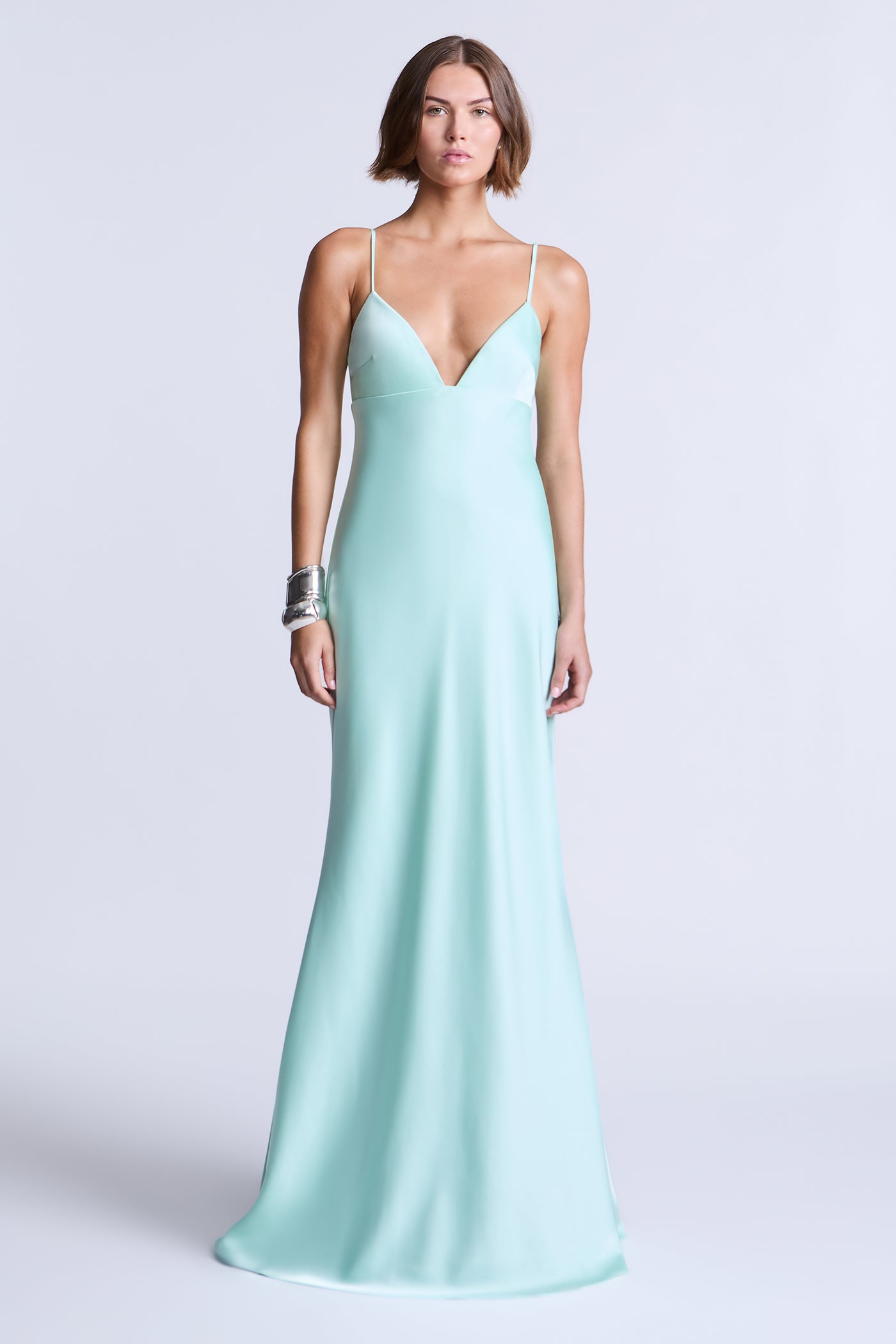 Seafoam satin gown cut with a smooth, fluid finish that skims the body with quiet polish. Designed with delicate shoulder straps and a clean plunging neckline that keeps the focus on line and proportion. A refined choice for formal weddings, evening receptions, and modern black-tie moments.