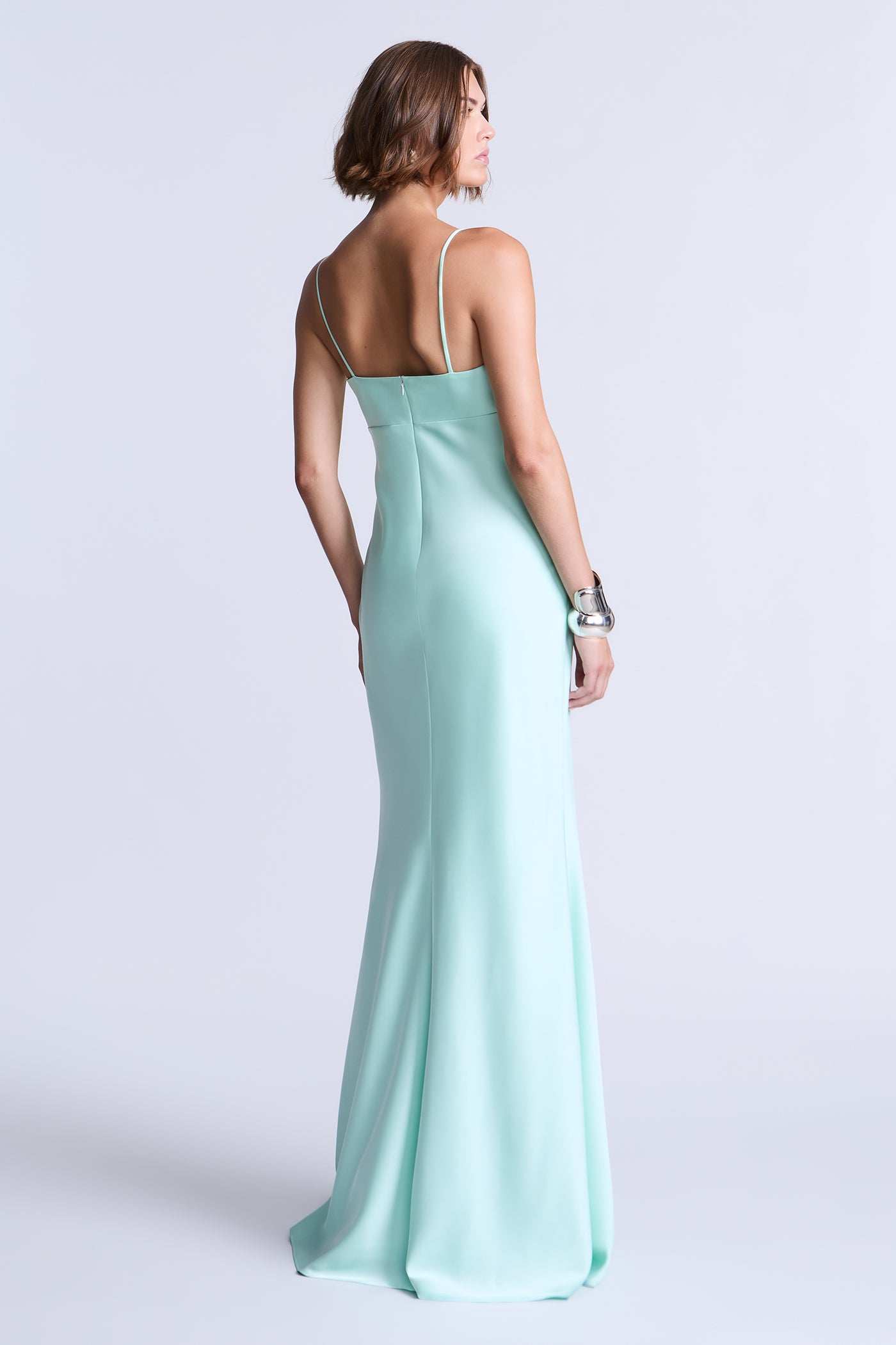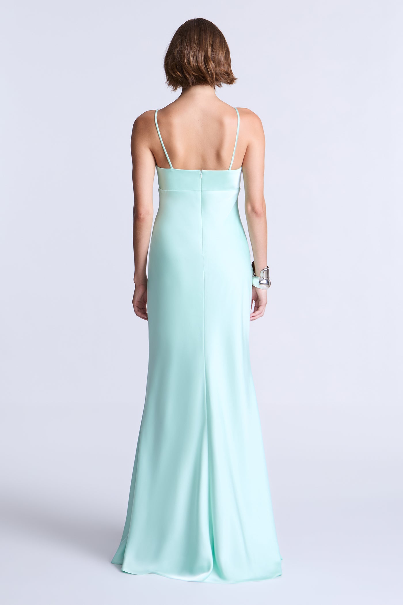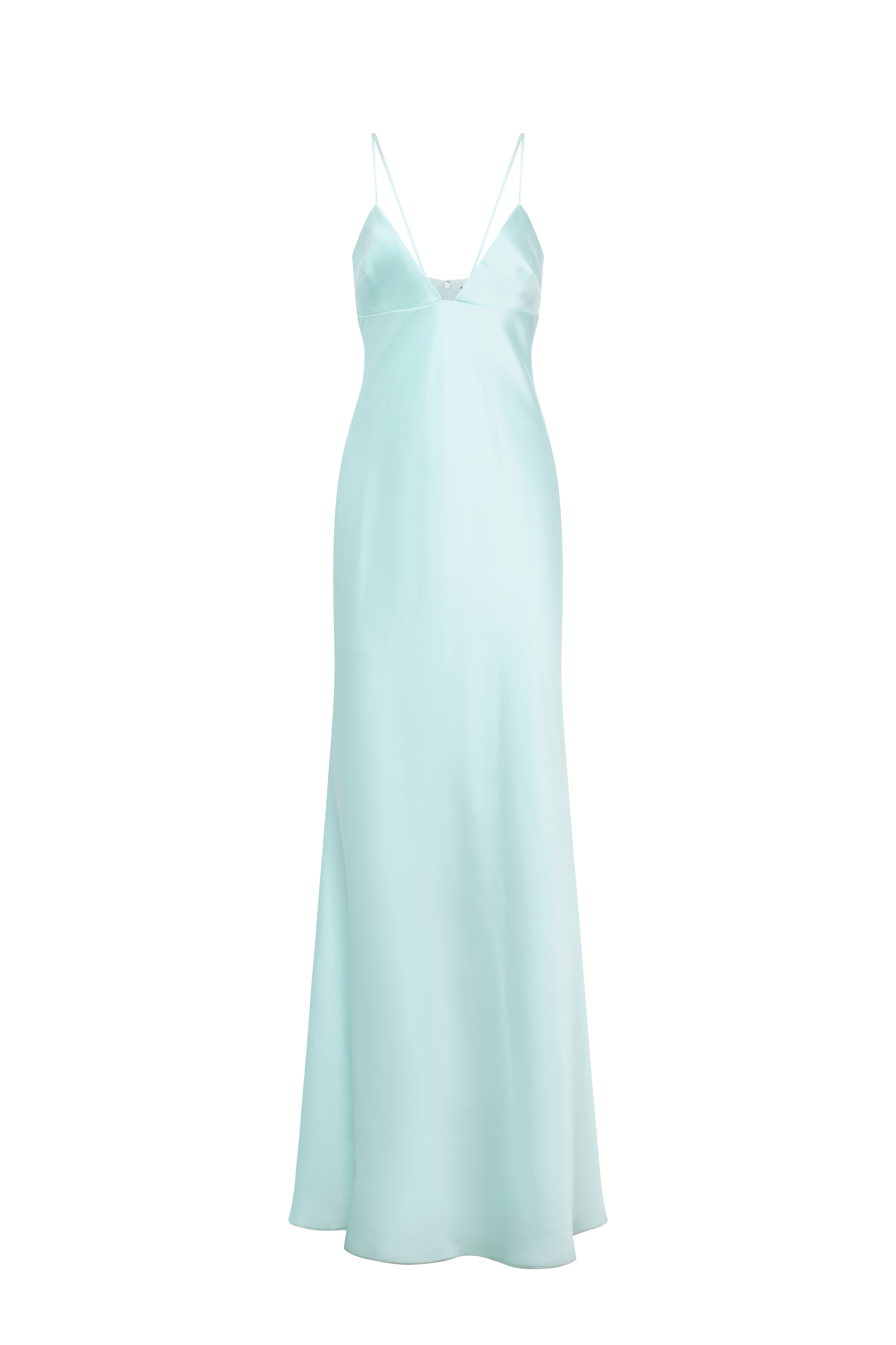 Seafoam satin gown cut with a smooth, fluid finish that skims the body with quiet polish. Designed with delicate shoulder straps and a clean plunging neckline that keeps the focus on line and proportion. A refined choice for formal weddings, evening receptions, and modern black-tie moments.
