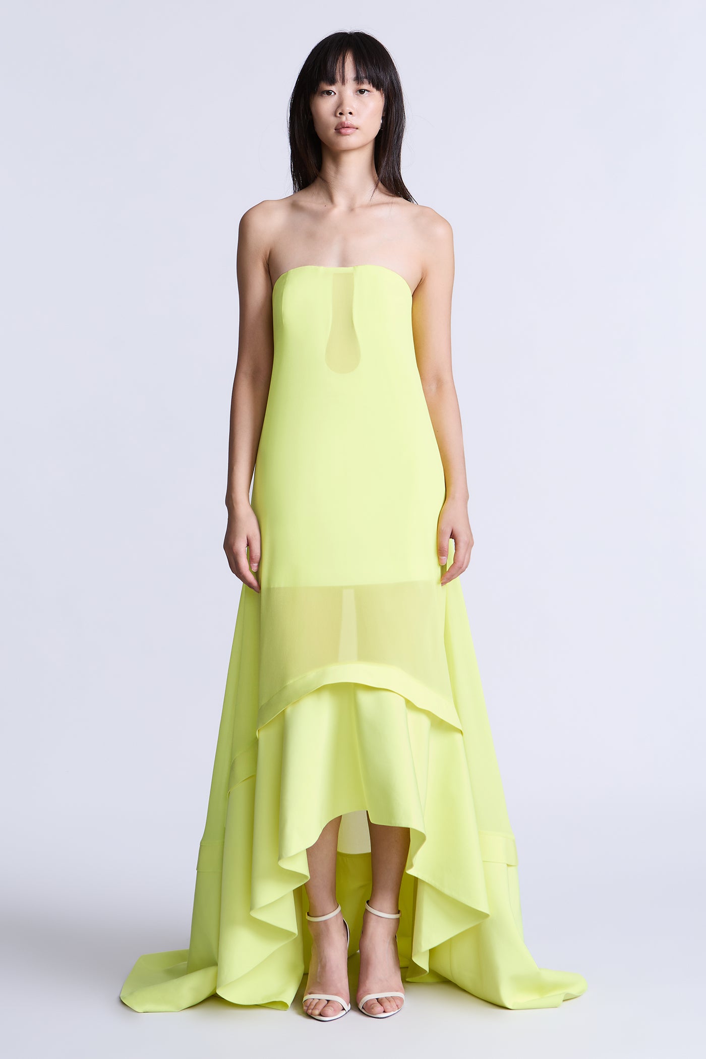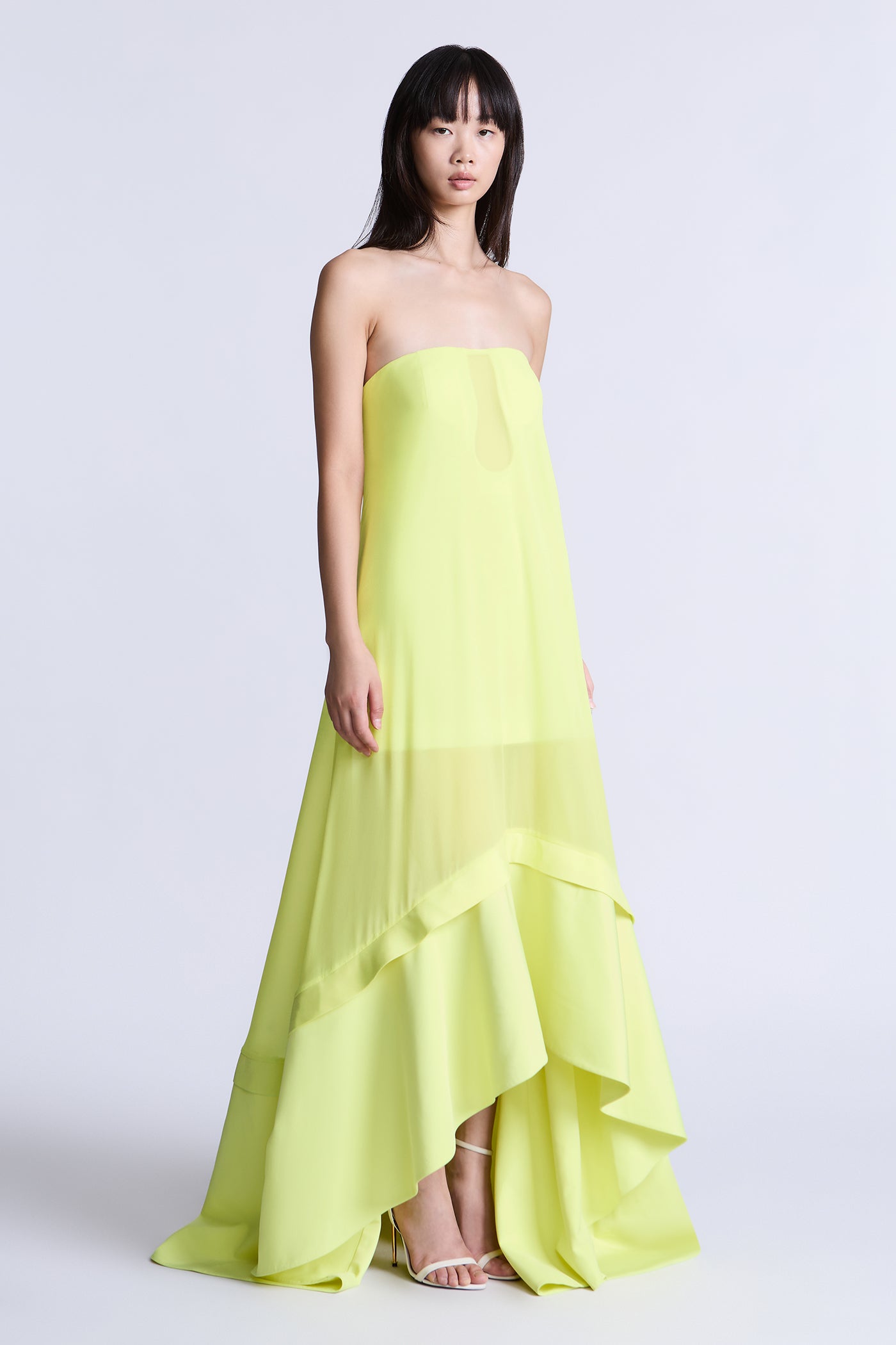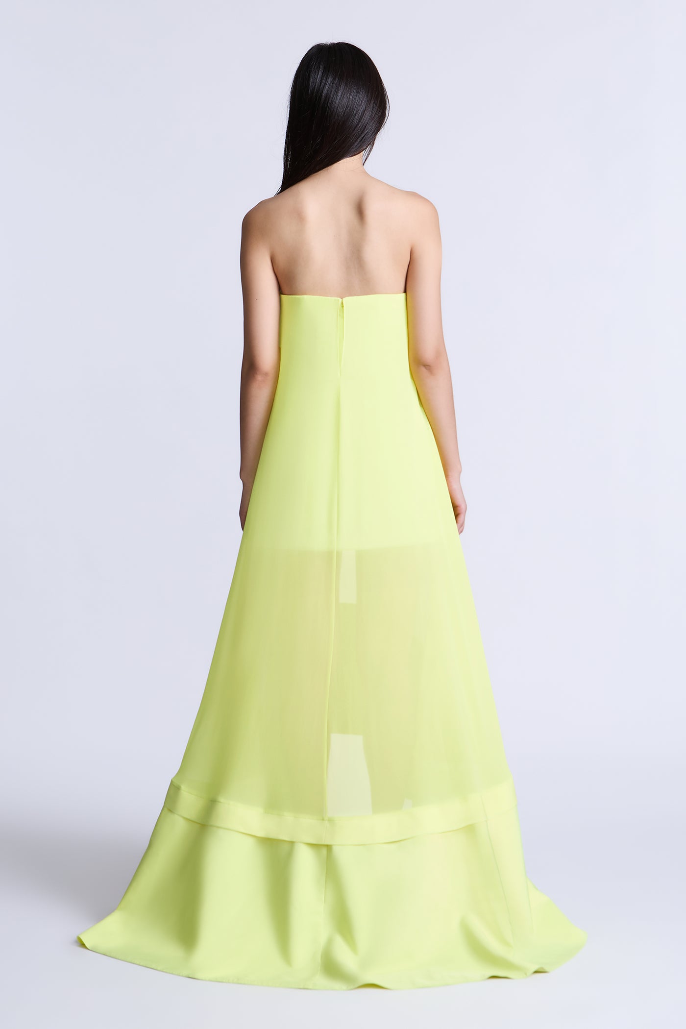 Sheer chartreuse chiffon gown crafted with a luminous, weightless drape. Designed with layered translucence and a softly sculpted bodice, it falls into fluid tiers with quiet precision. A striking choice for black-tie galas, garden receptions, and refined city interiors.