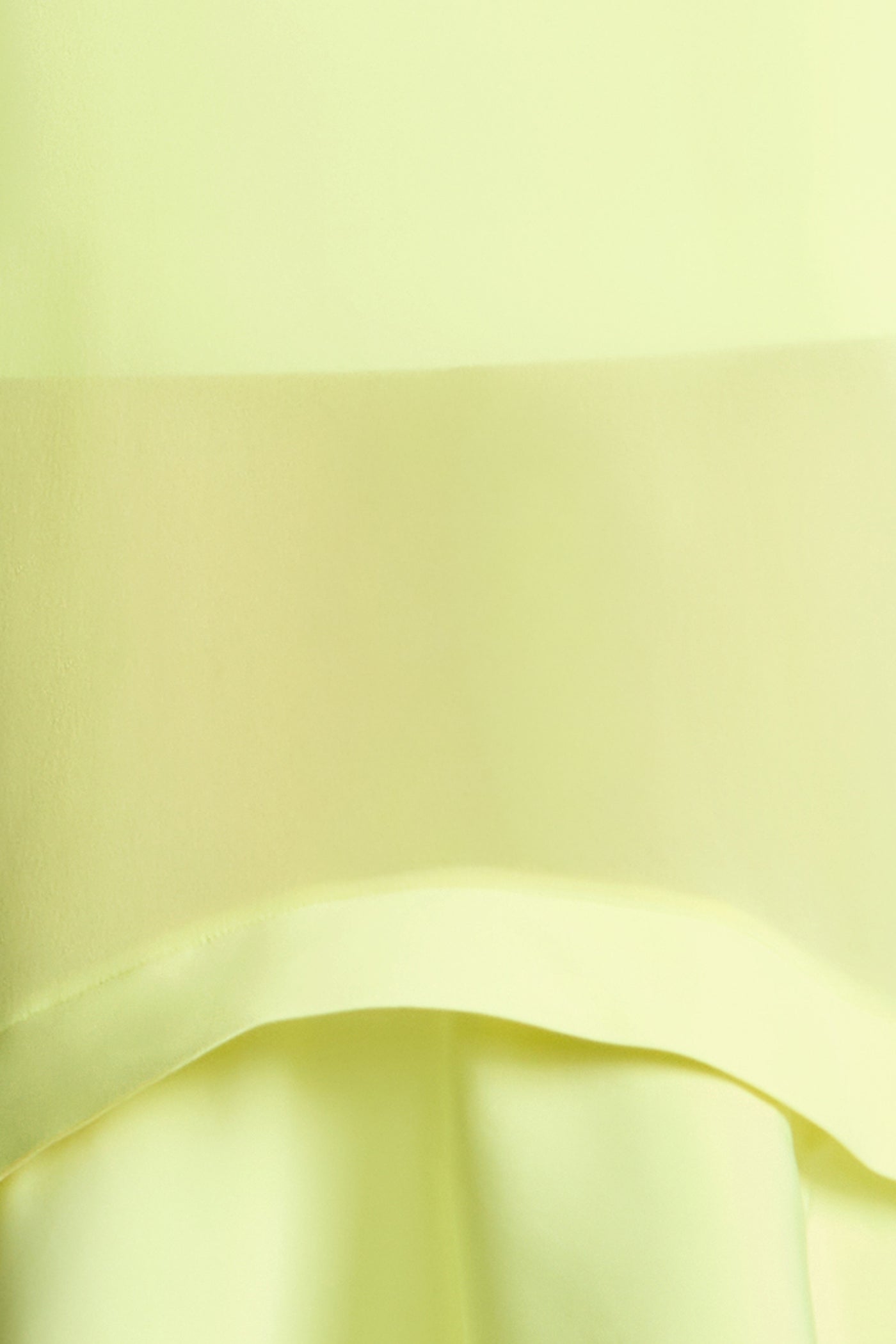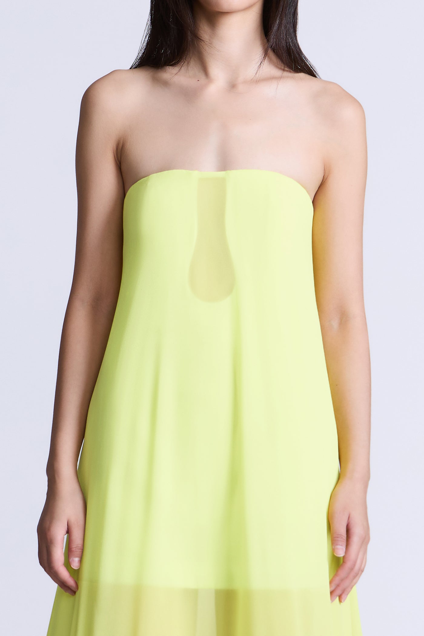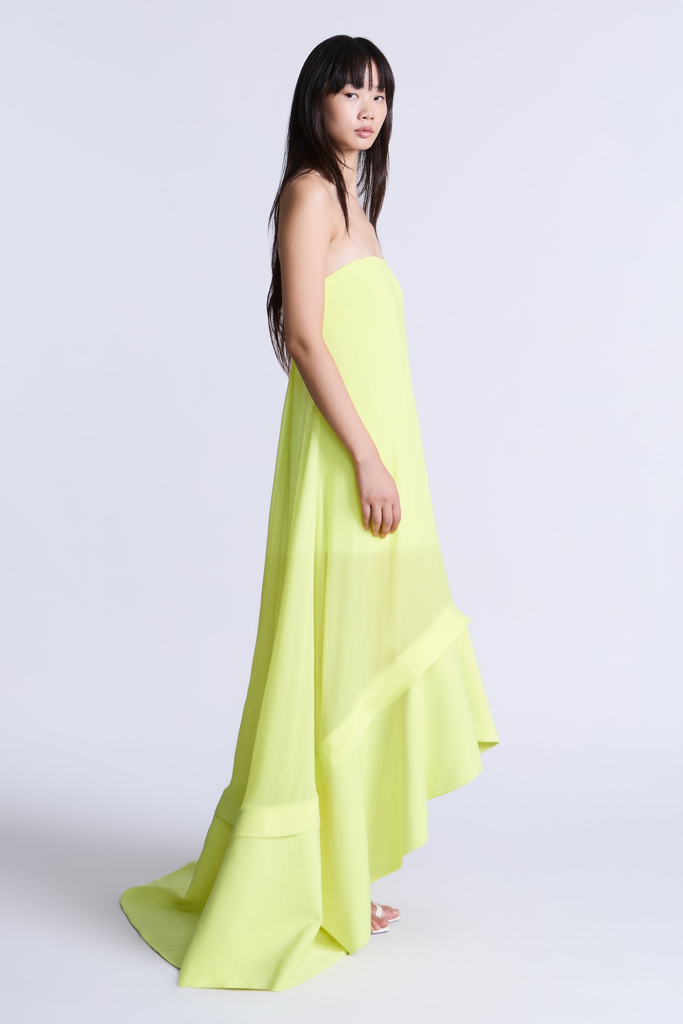 Sheer chartreuse chiffon gown crafted with a luminous, weightless drape. Designed with layered translucence and a softly sculpted bodice, it falls into fluid tiers with quiet precision. A striking choice for black-tie galas, garden receptions, and refined city interiors.
