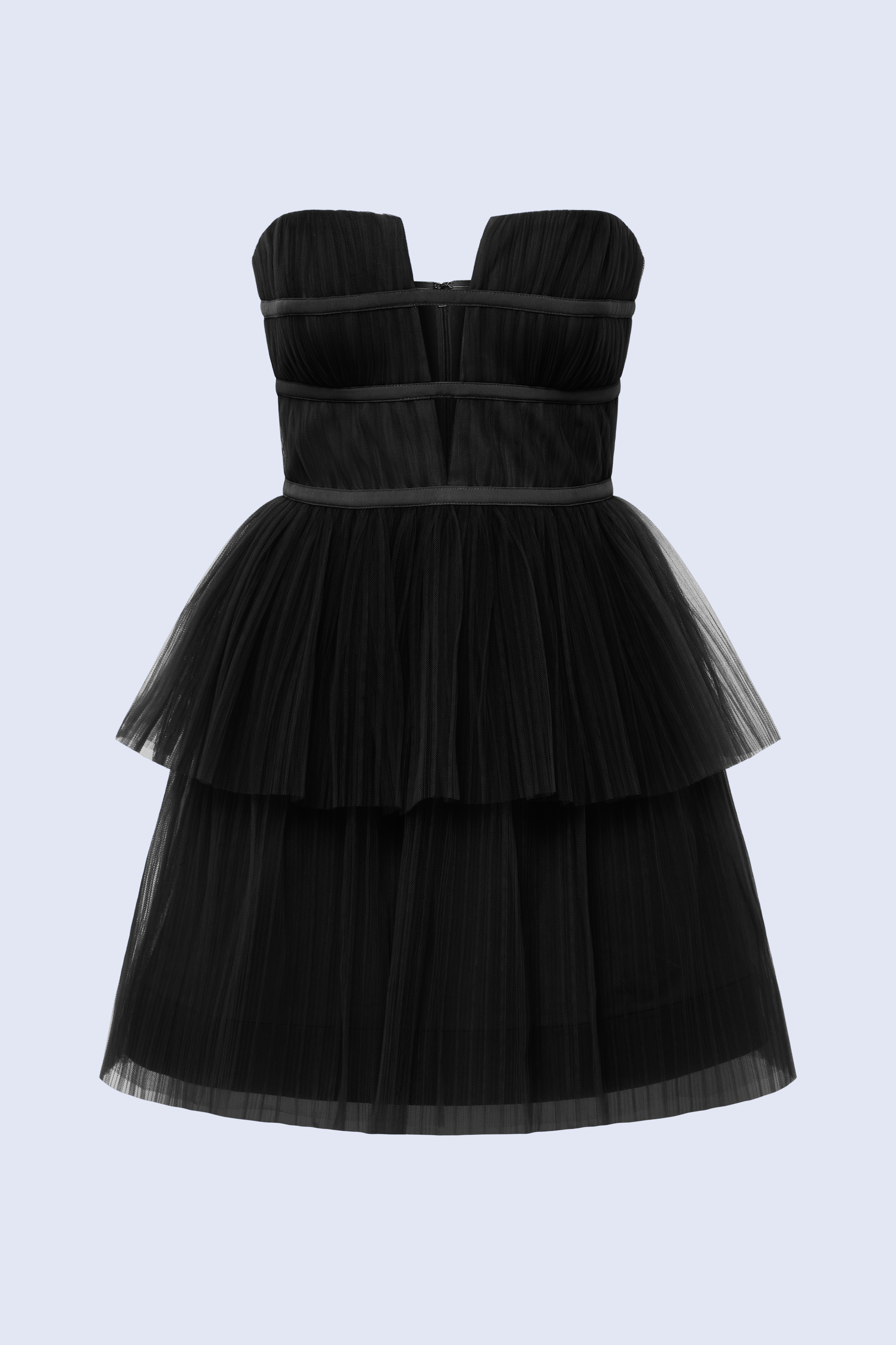 Strapless tulle mini dress layered with soft tiers for a dimensional finish. Designed with sheer paneling and banded detailing through the bodice, adding structure against the airy texture. Playful yet polished—it’s made for the spotlight.