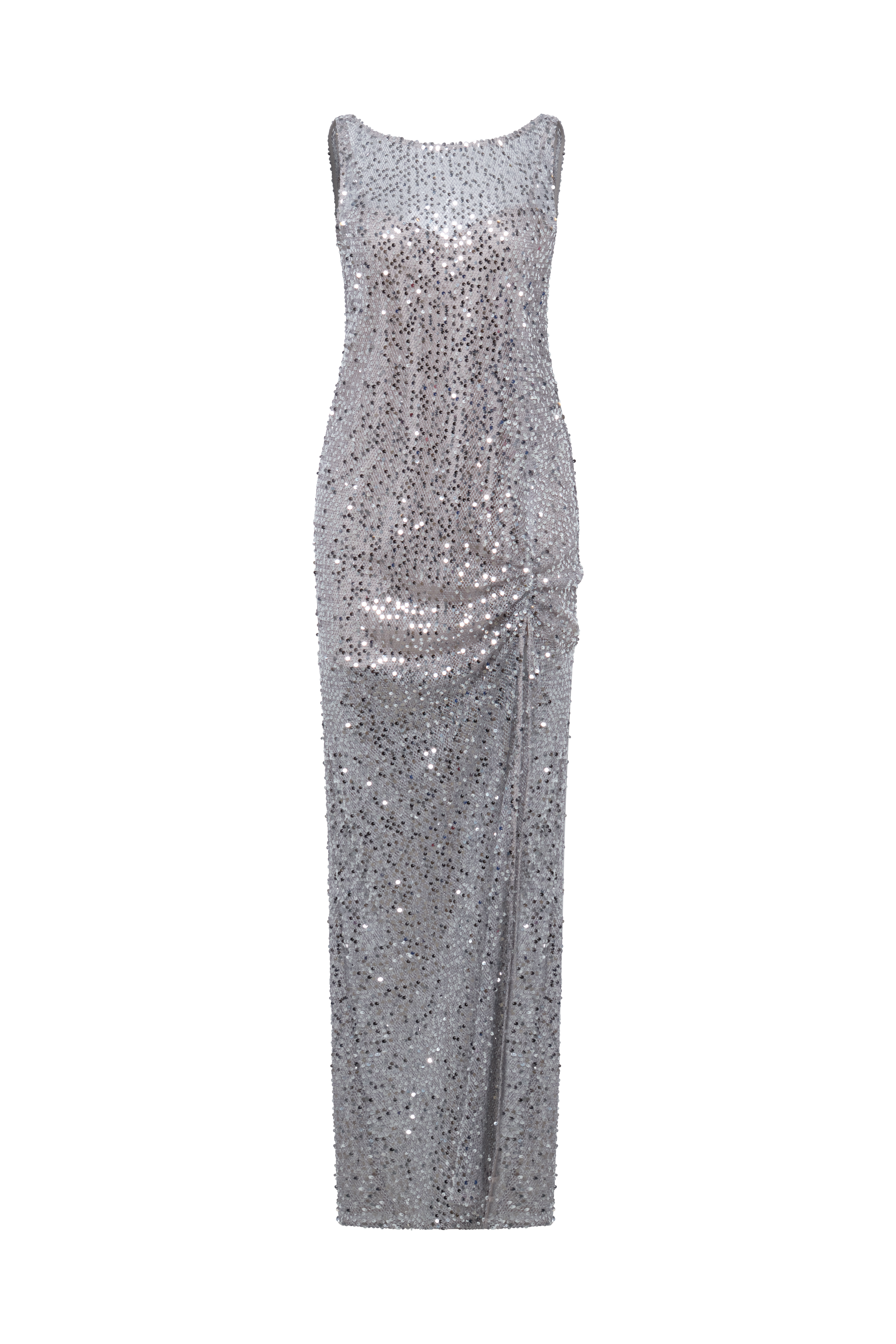 Silver sequin gown crafted with a fluid, light-catching finish that glimmers with every step. Designed with a clean, elongated line and a dramatic open back for understated allure. A refined choice for red carpet moments, premiere events, and evening receptions.