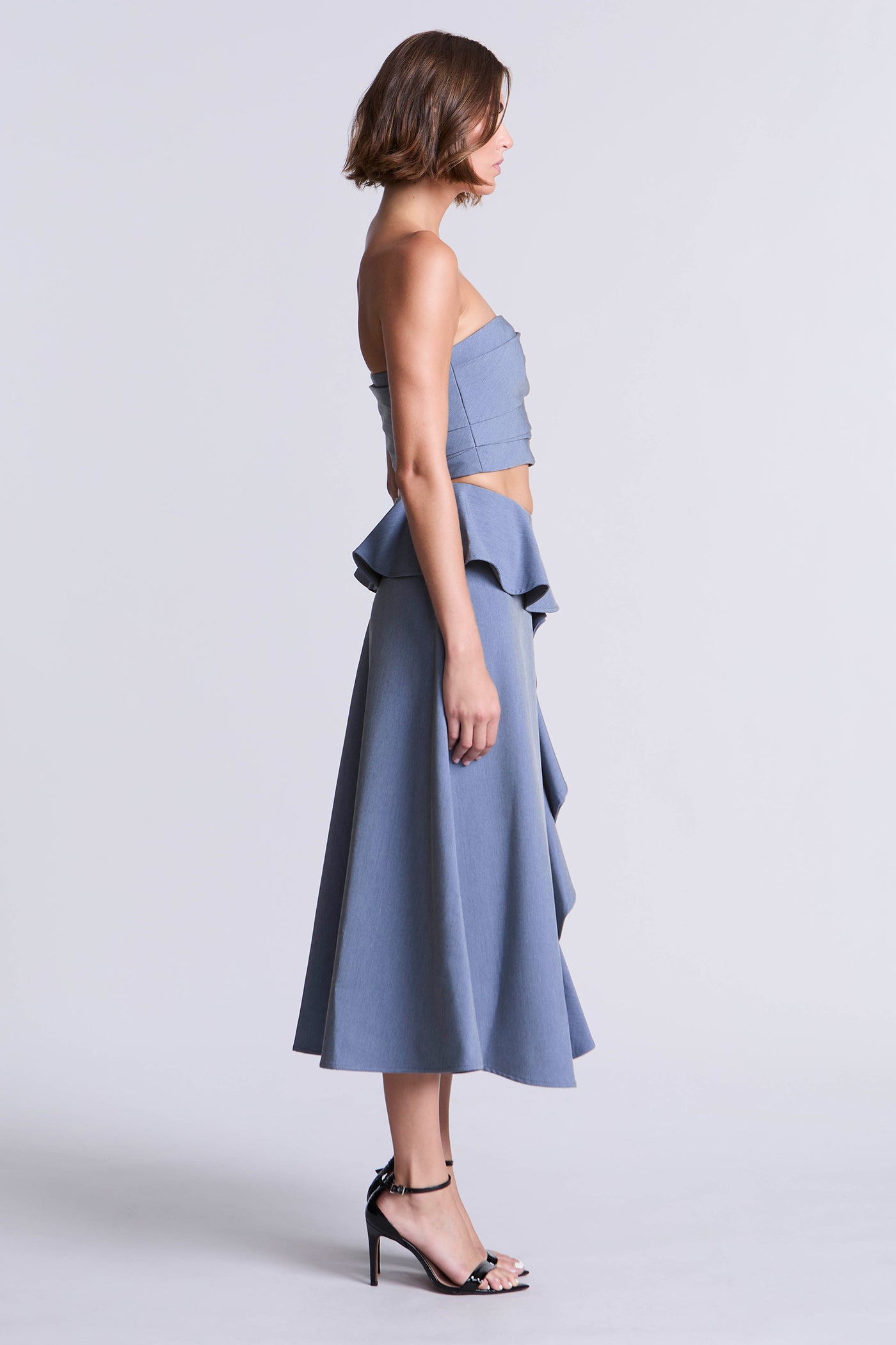 Solid suiting fabric bustier in soft slate blue. Features a structured strapless silhouette with diagonal pleating for a sleek, sculpted fit. Pair it with the matching ruffled skirt or offset it with trousers and a strappy heel.