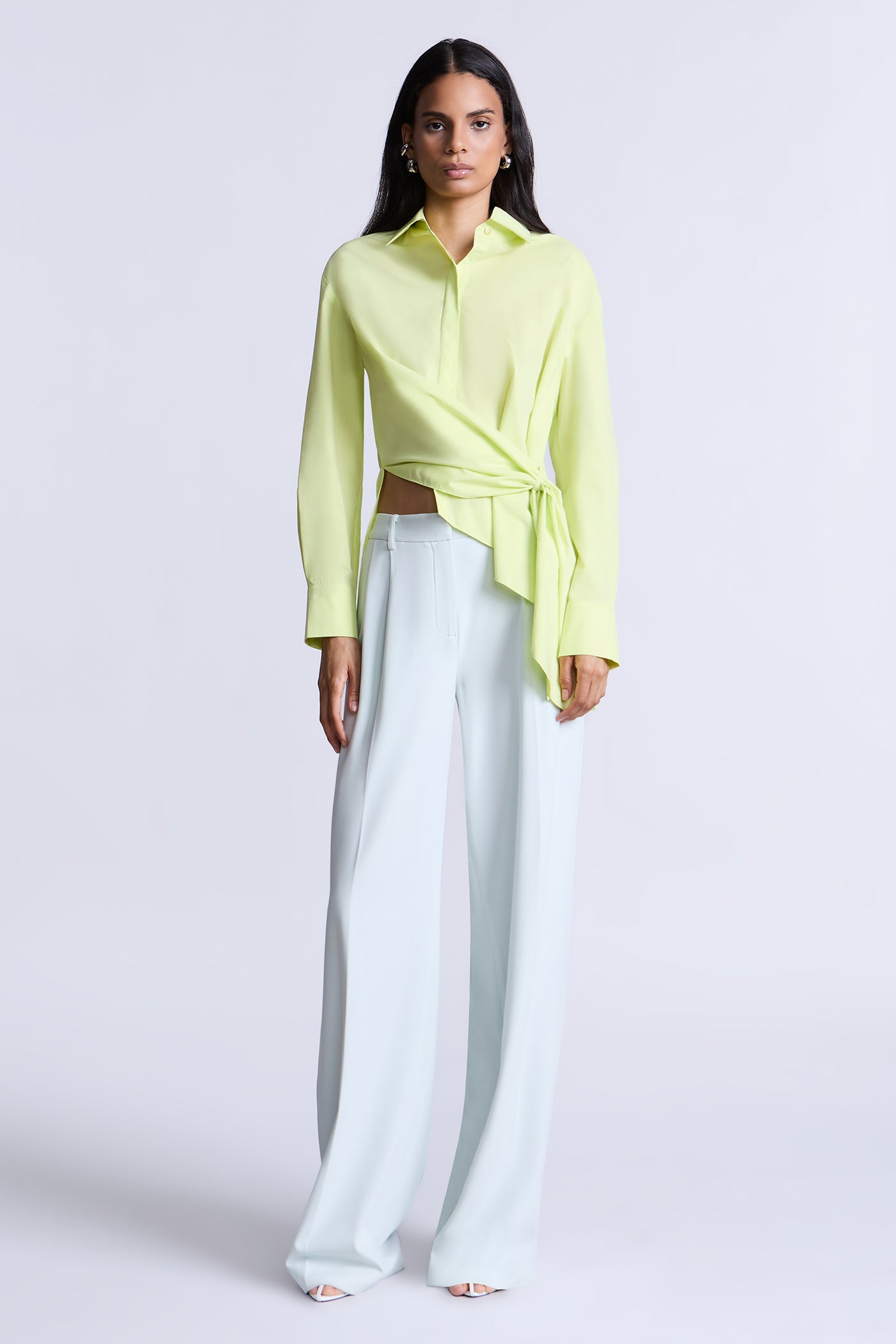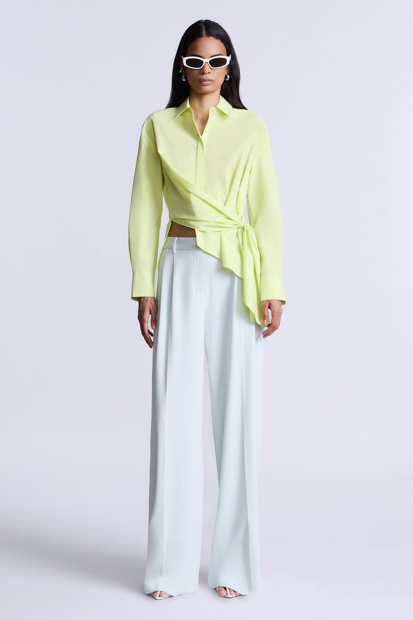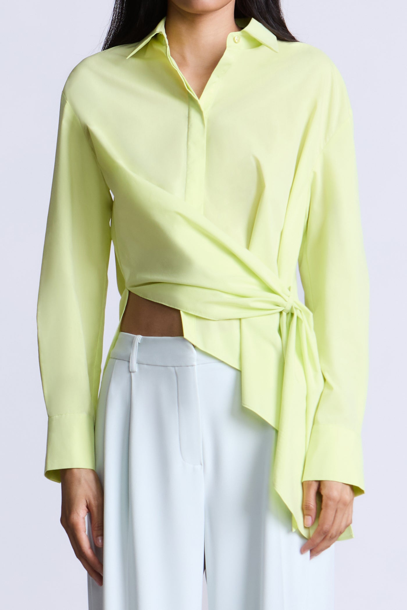 Crisp cotton wrap shirt in a fresh citrus hue, with a soft, breathable hand and an unexpected asymmetric finish. Designed with a classic collar, relaxed long sleeves, and a wrap-front tie that creates gentle shape. Easy and lightweight—polished with tailored trousers for the office, or styled for warm-weather days and resort getaways.