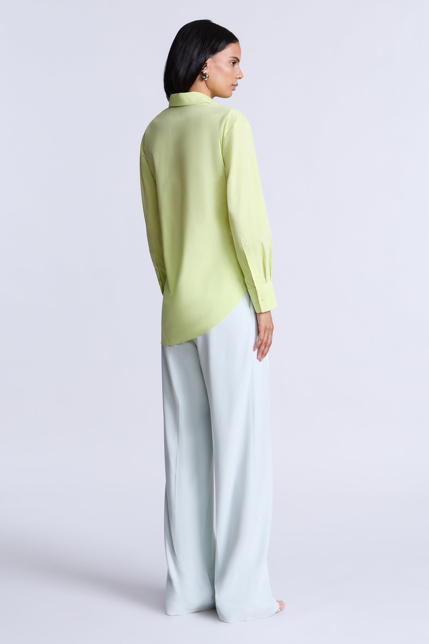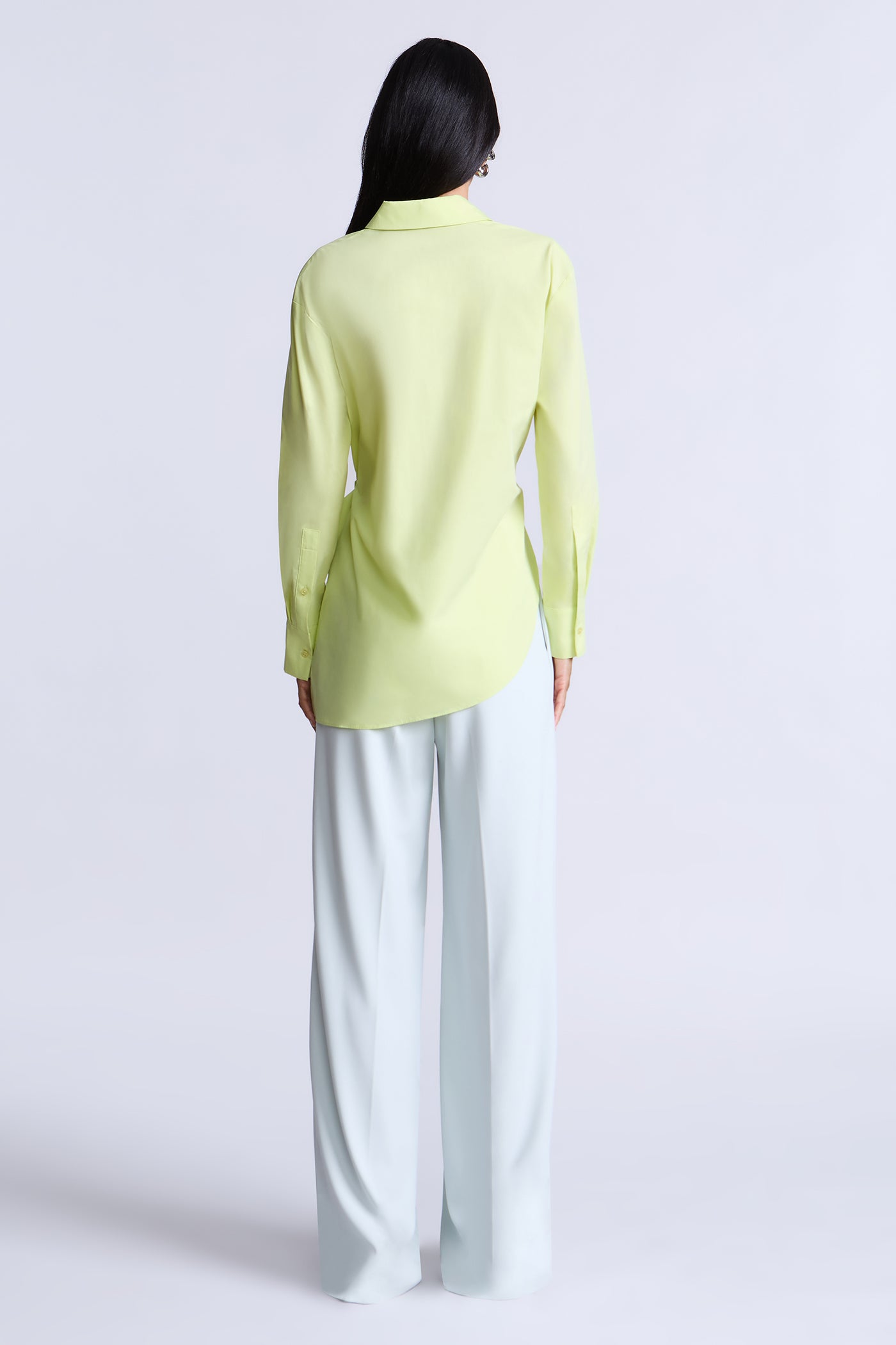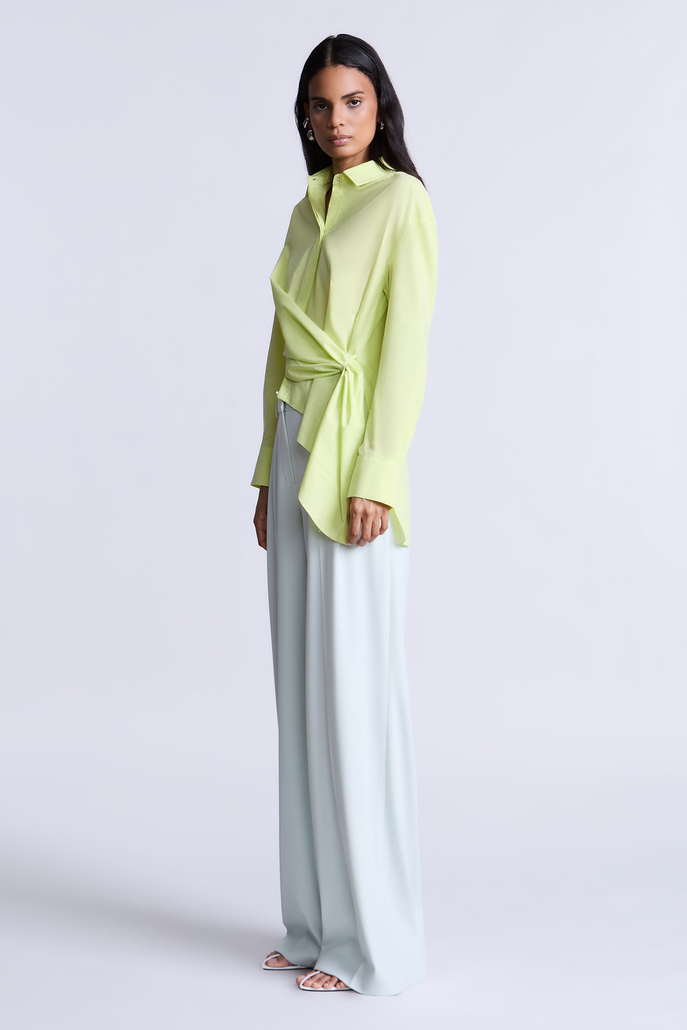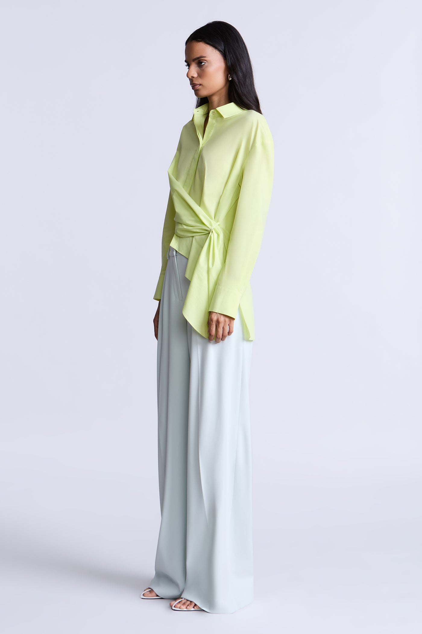 Crisp cotton wrap shirt in a fresh citrus hue, with a soft, breathable hand and an unexpected asymmetric finish. Designed with a classic collar, relaxed long sleeves, and a wrap-front tie that creates gentle shape. Easy and lightweight—polished with tailored trousers for the office, or styled for warm-weather days and resort getaways.