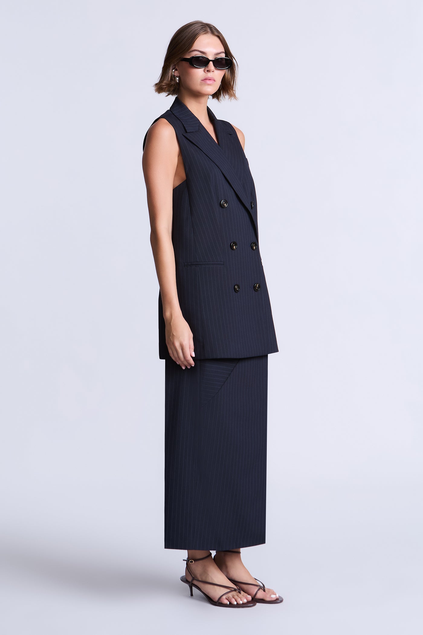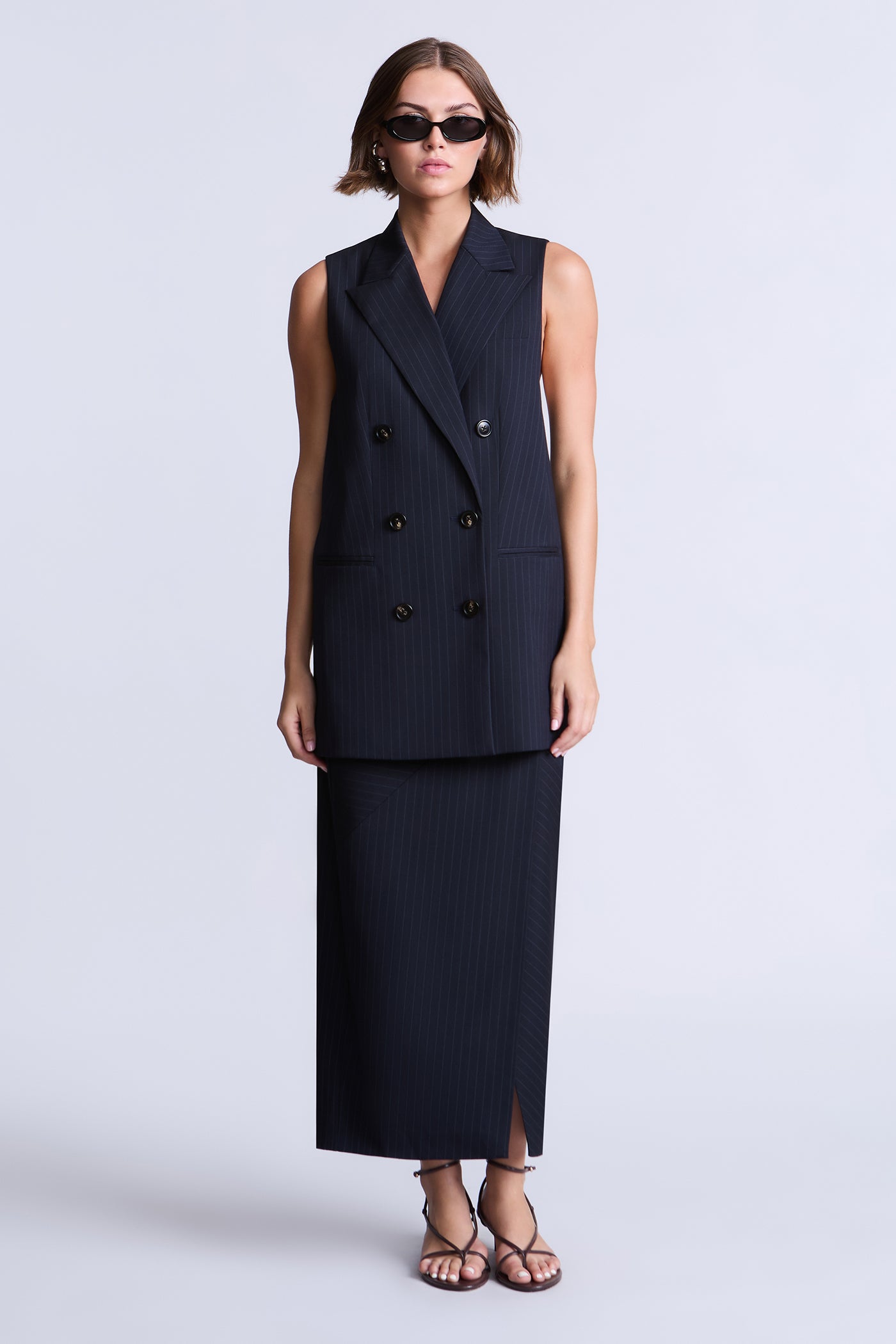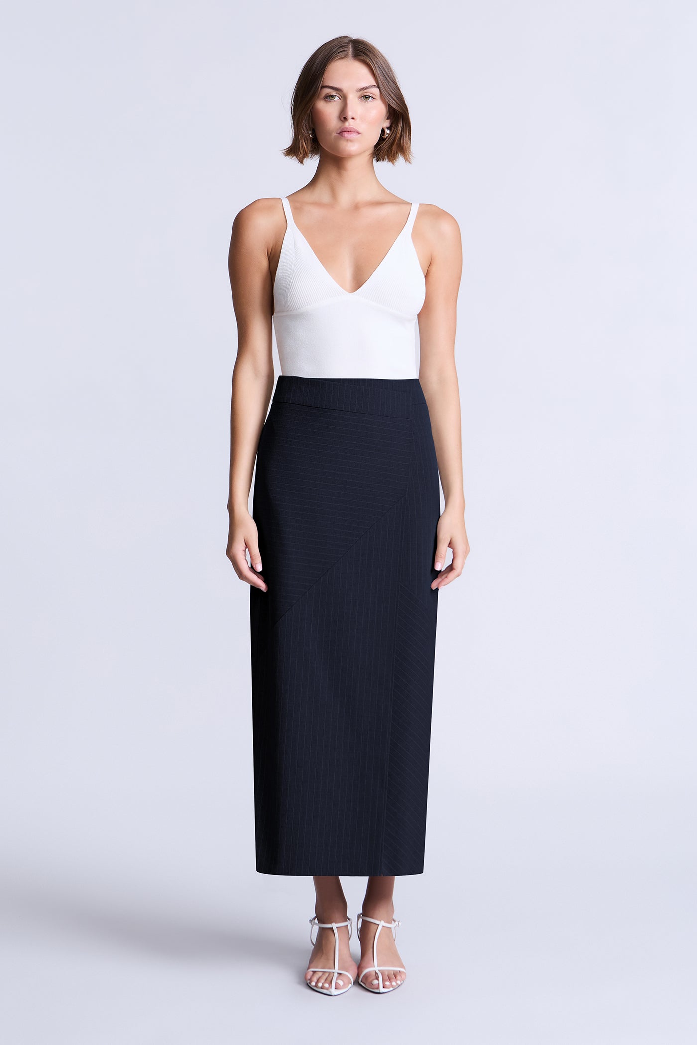 Pinstripe midi skirt defined by clean, architectural lines and subtle directional seaming for quiet dimension. Tailored to sit smooth through the waist with a streamlined drape. A sharp foundation piece for office polish, gallery days, or after-dark styling.