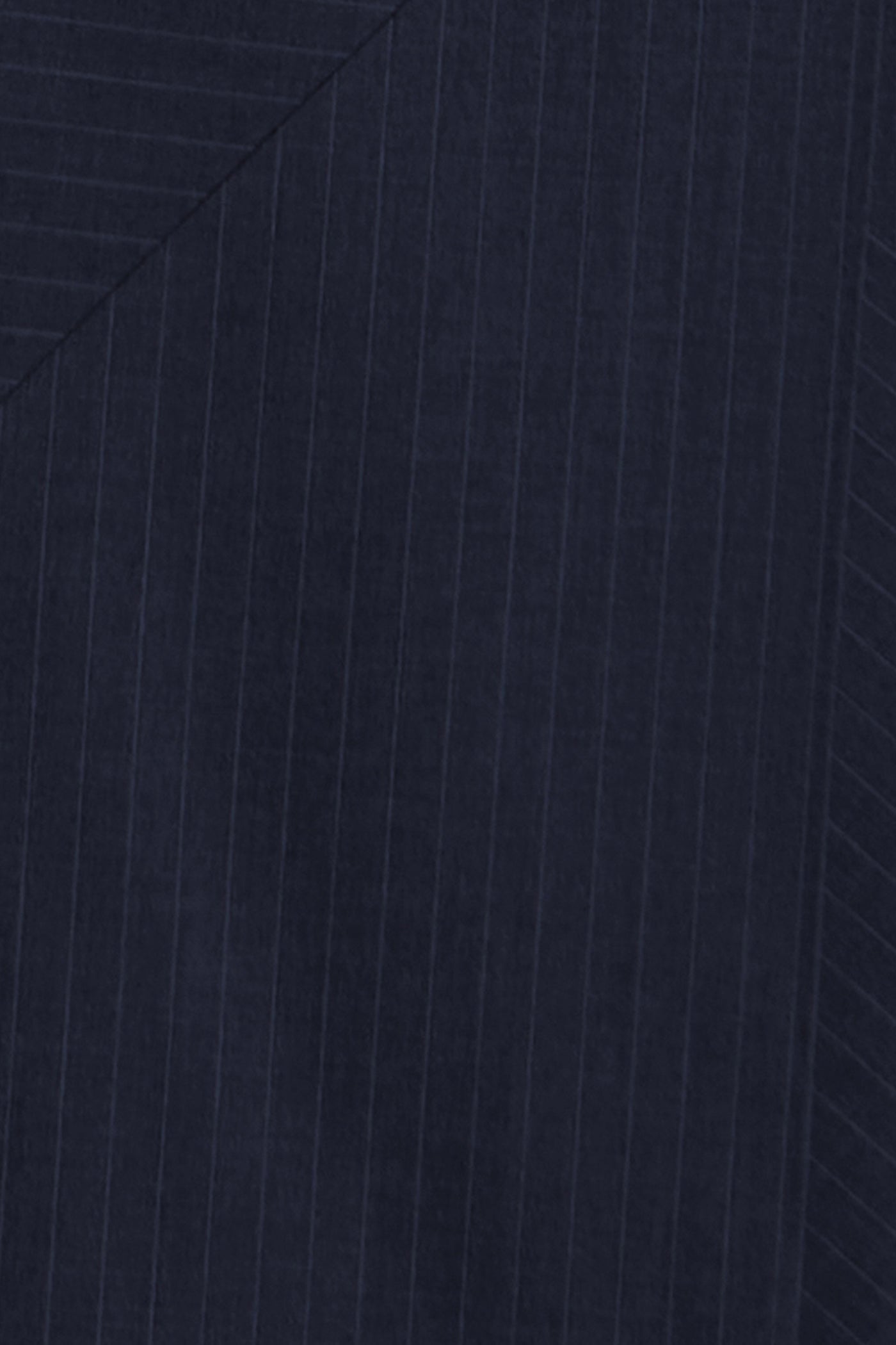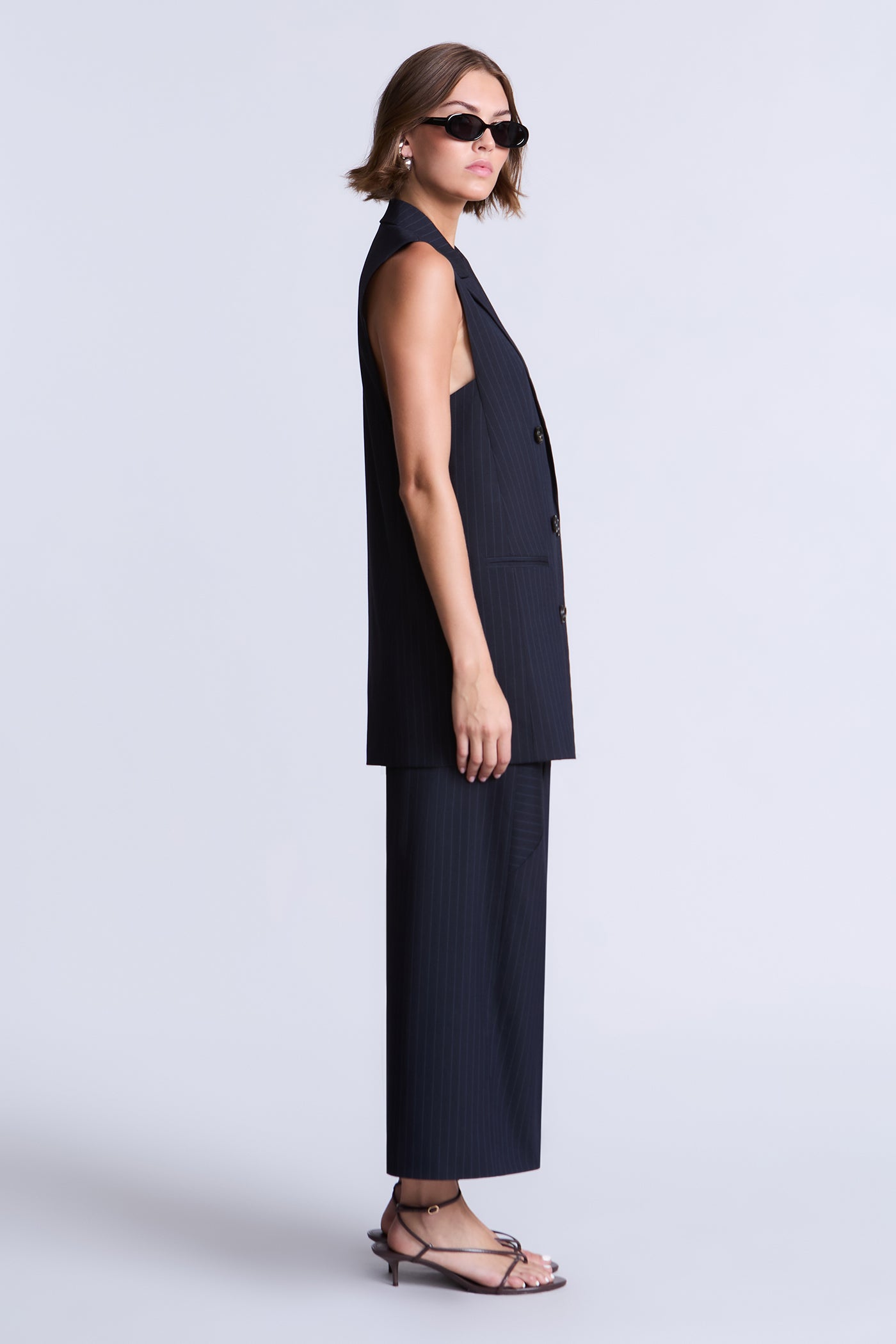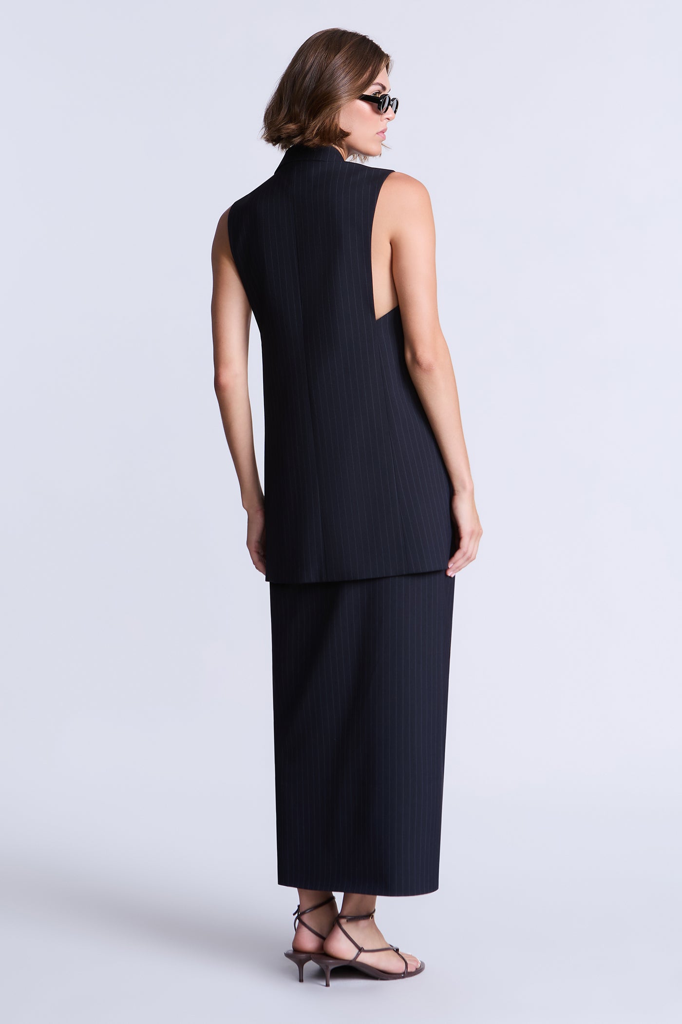Pinstripe midi skirt defined by clean, architectural lines and subtle directional seaming for quiet dimension. Tailored to sit smooth through the waist with a streamlined drape. A sharp foundation piece for office polish, gallery days, or after-dark styling.