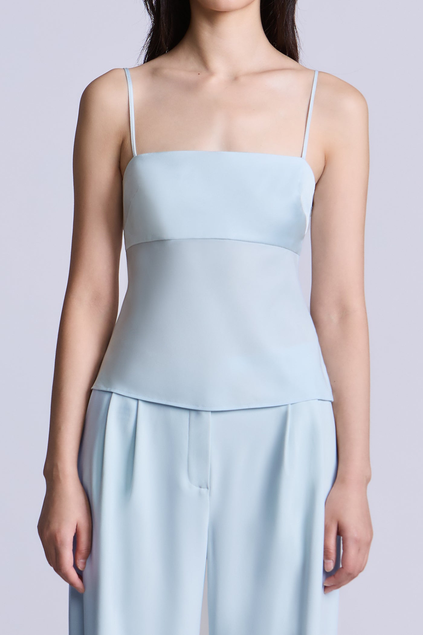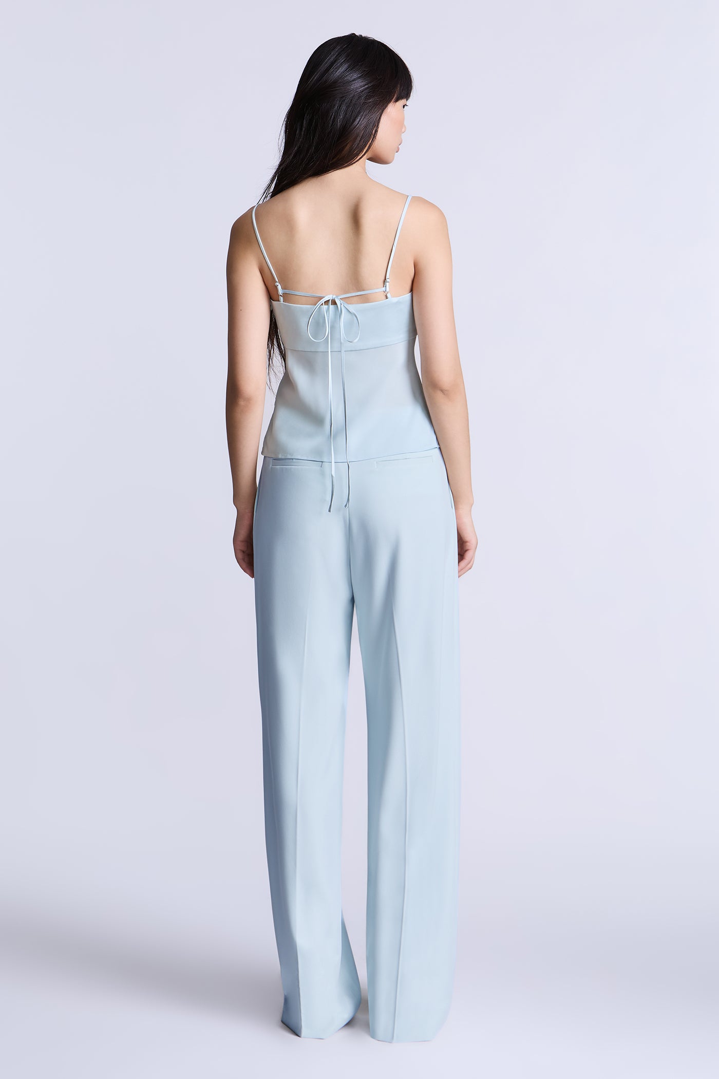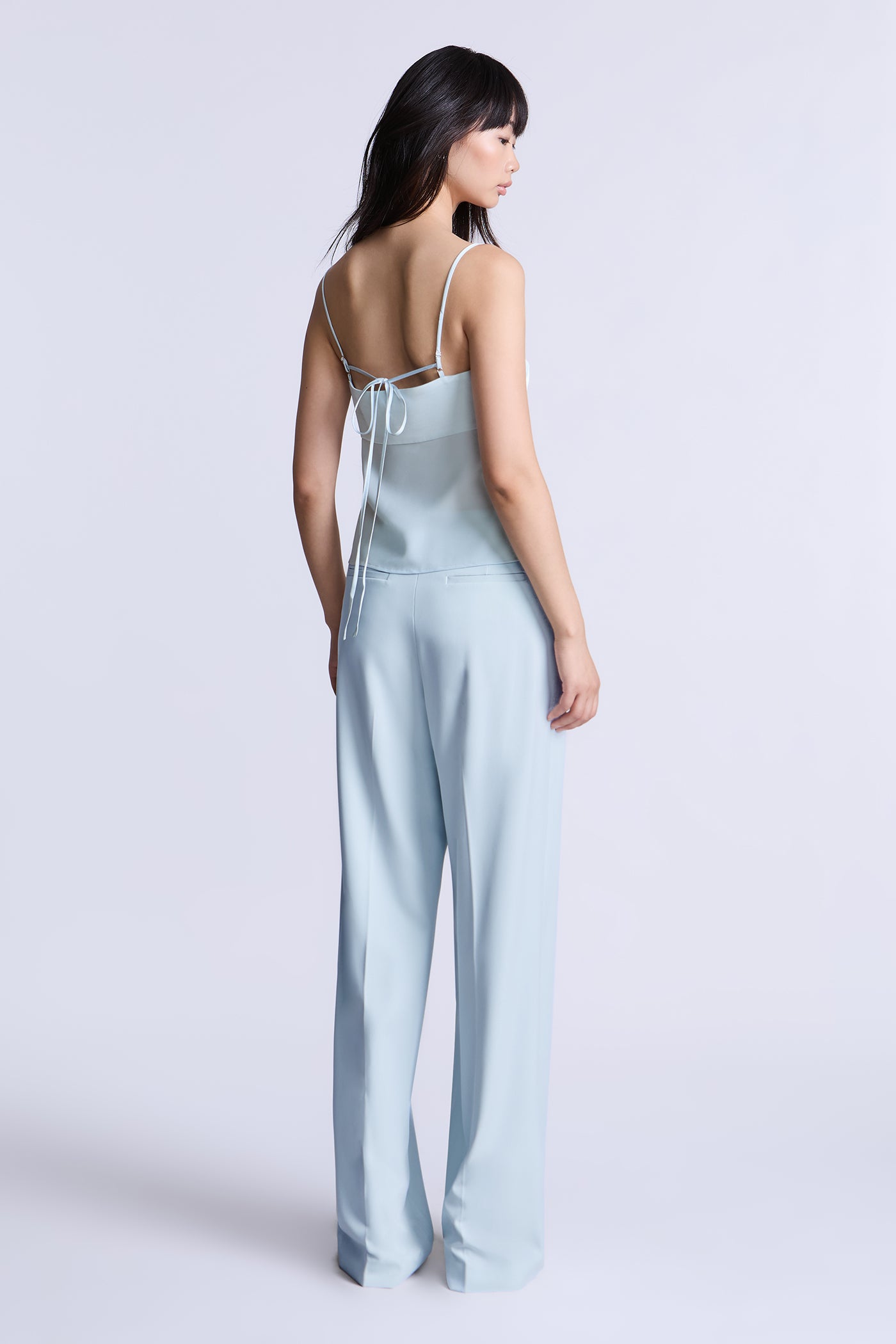 Aqua blue camisole top with a smooth, fitted bodice and delicate straps for a barely-there feel. Designed with a clean, minimal front and an adjustable tie-back detail that adds subtle interest while keeping the look refined. An easy, versatile piece to wear on its own or layered under tailoring for day-to-evening styling.