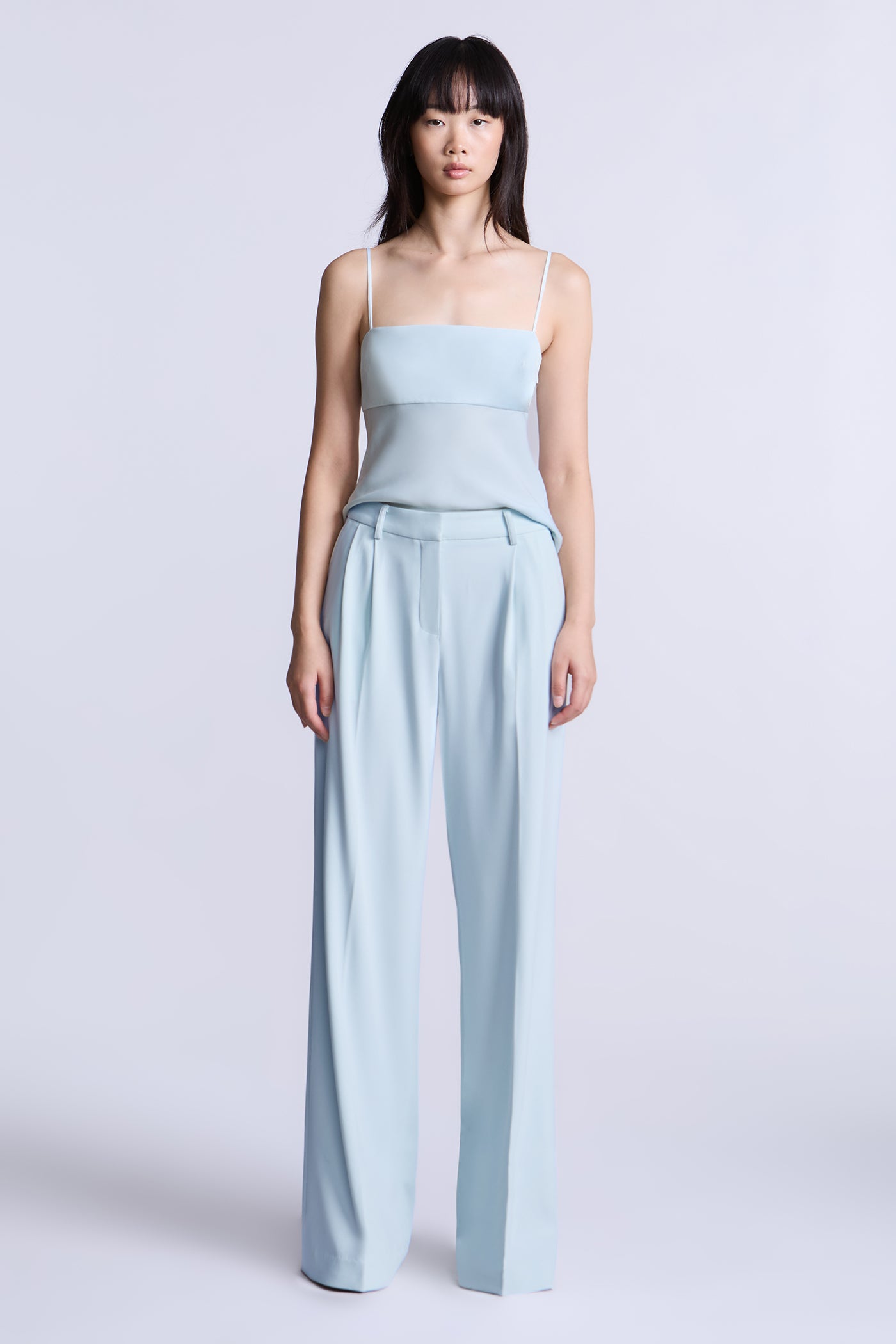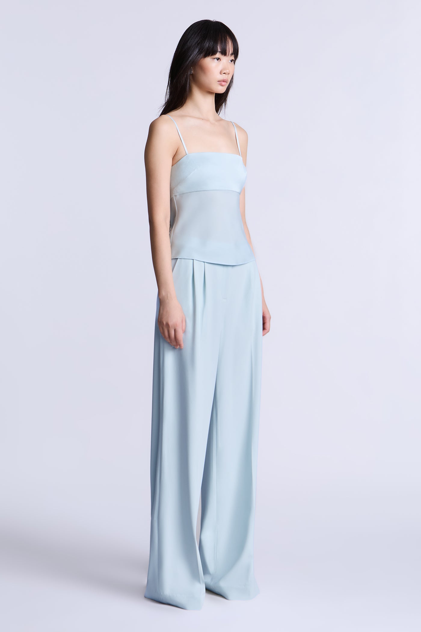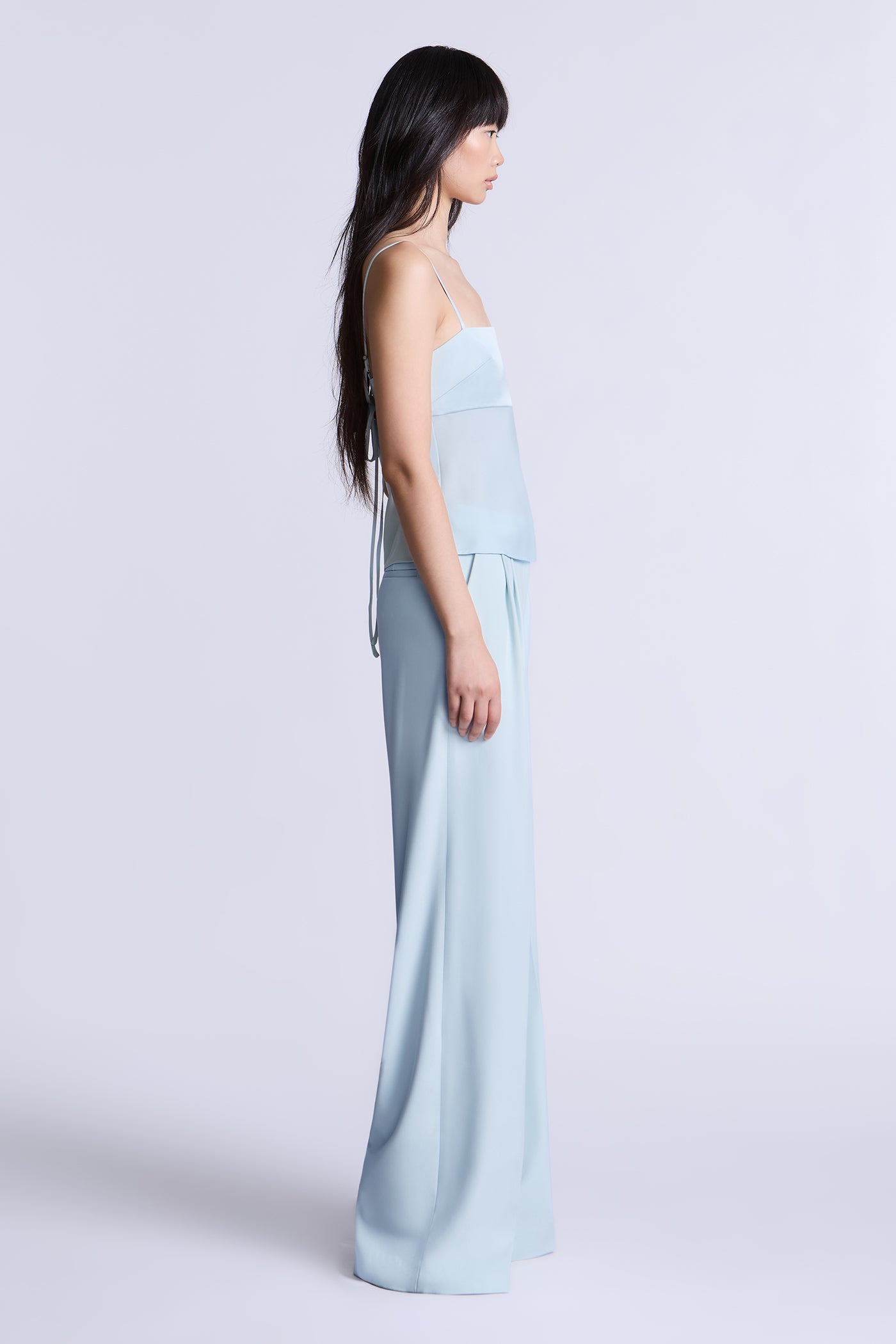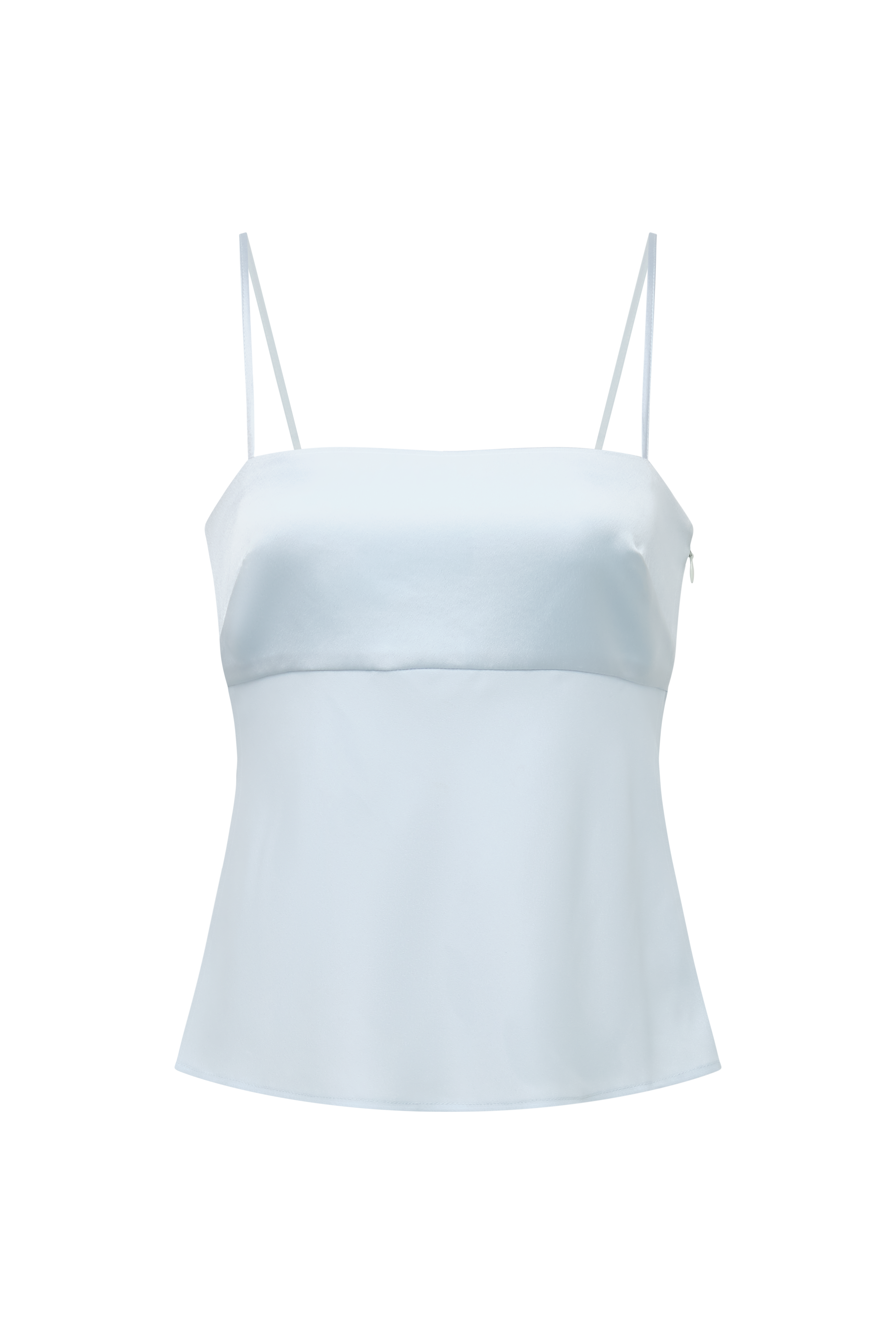 Aqua blue camisole top with a smooth, fitted bodice and delicate straps for a barely-there feel. Designed with a clean, minimal front and an adjustable tie-back detail that adds subtle interest while keeping the look refined. An easy, versatile piece to wear on its own or layered under tailoring for day-to-evening styling.
