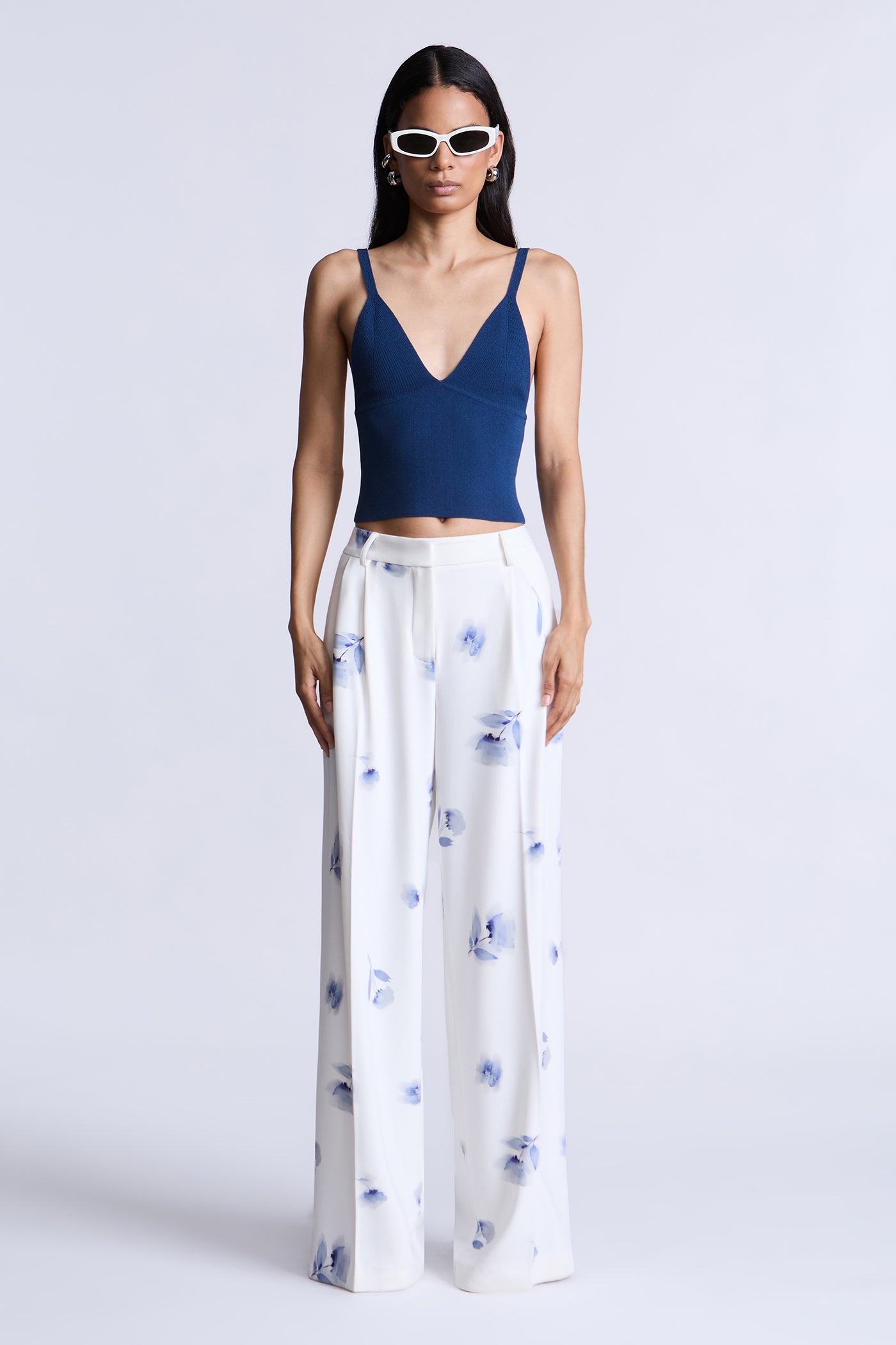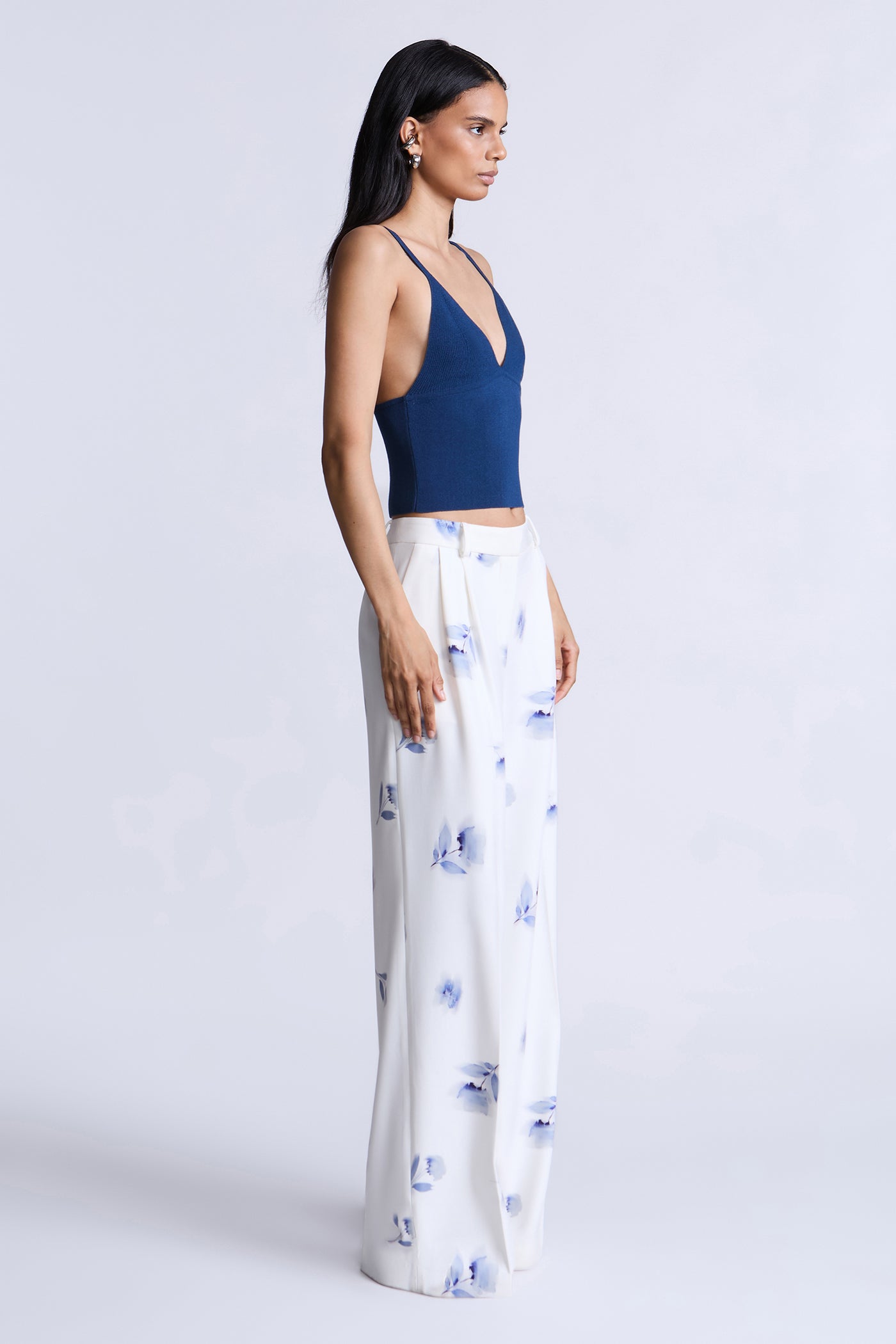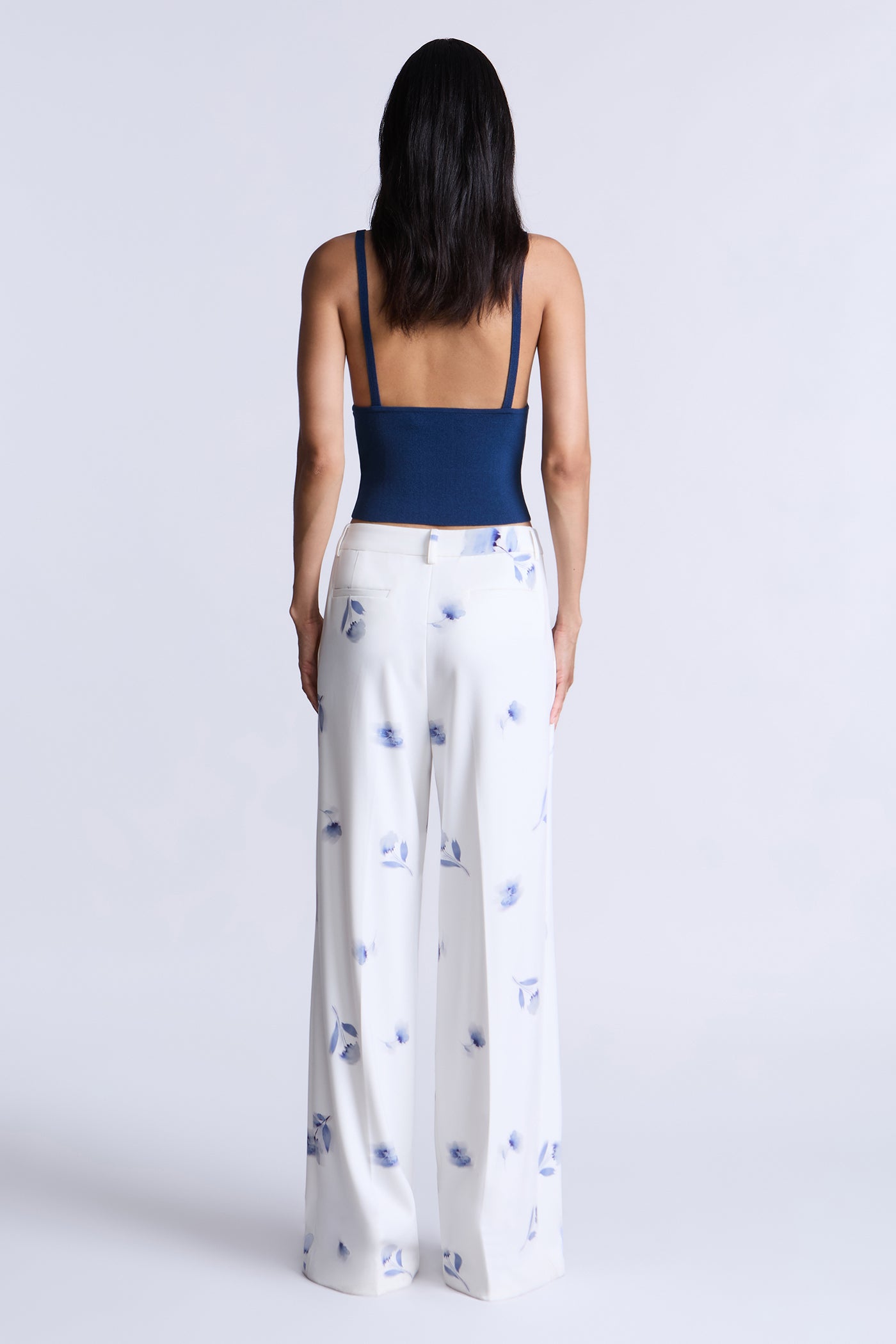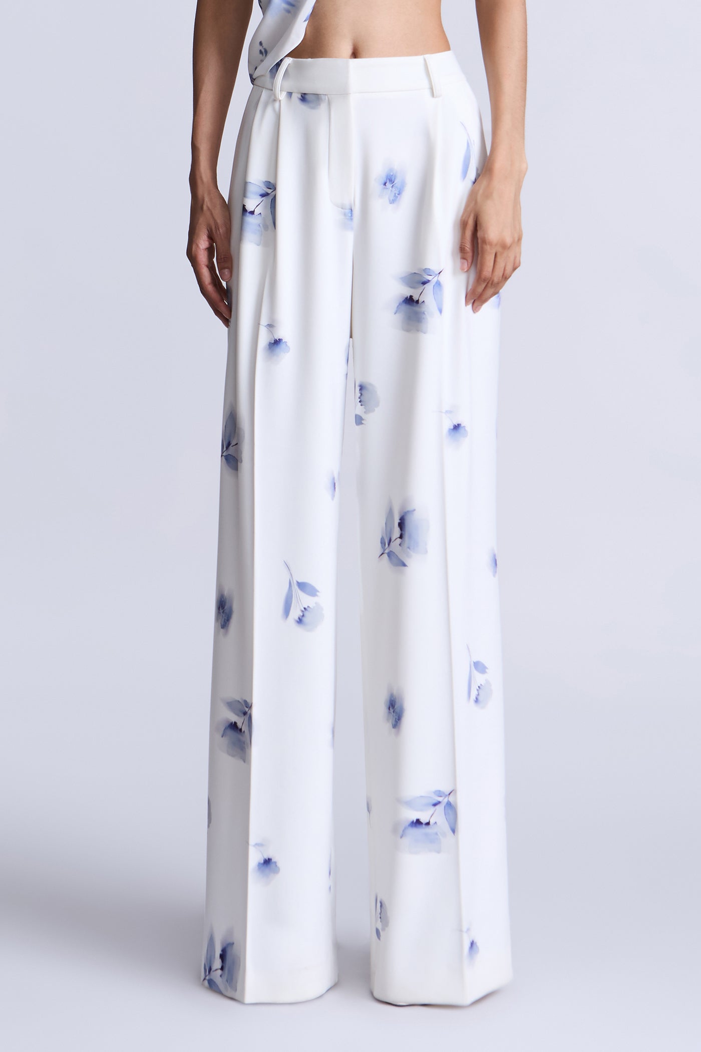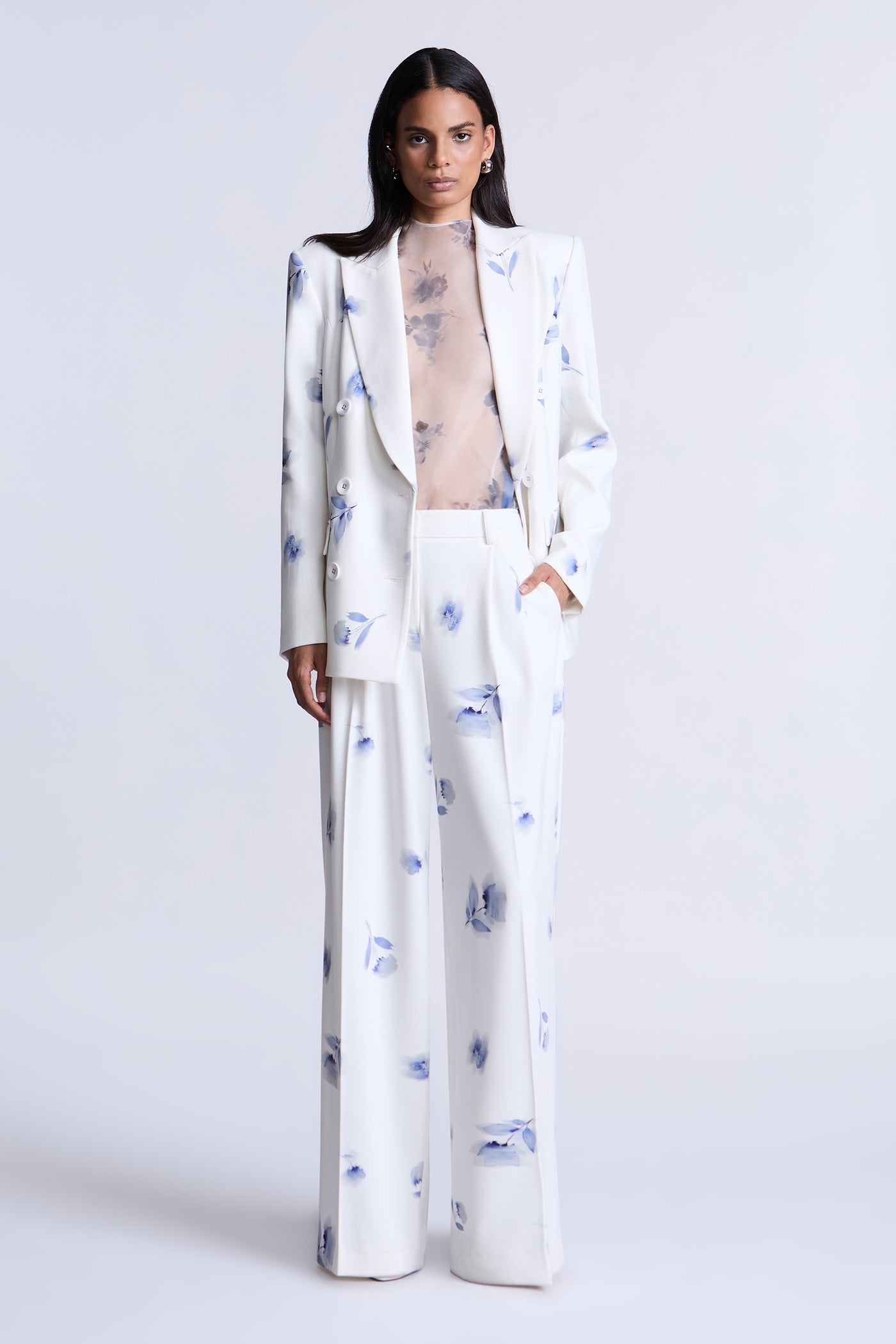 Fluid ivory trousers with a soft blue floral print, designed for easy movement and a polished drape. Cut with a clean waistband and relaxed leg that falls long and straight. A refined staple that balances tailoring with a fresh feel—perfect for daytime events or elevated evenings.