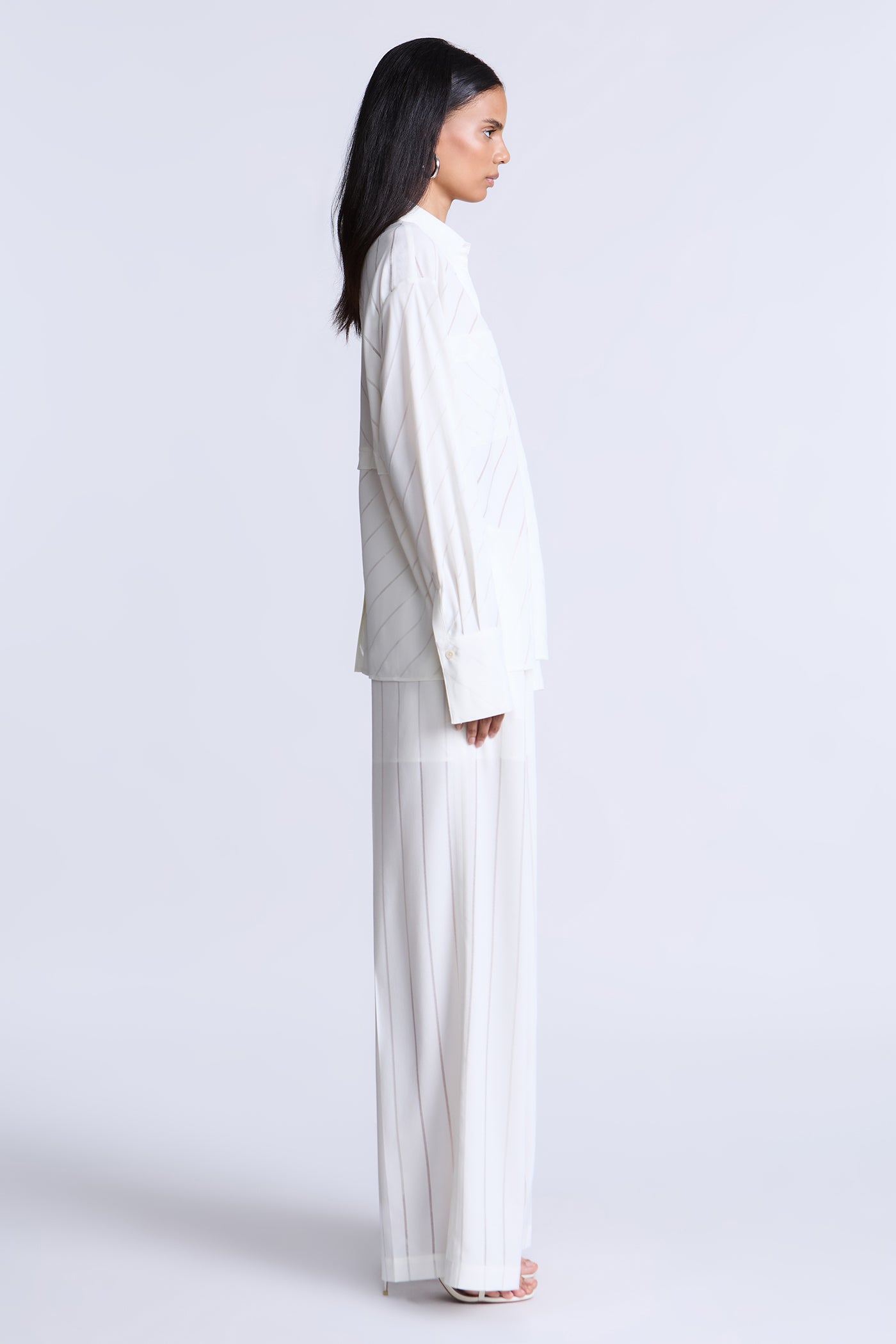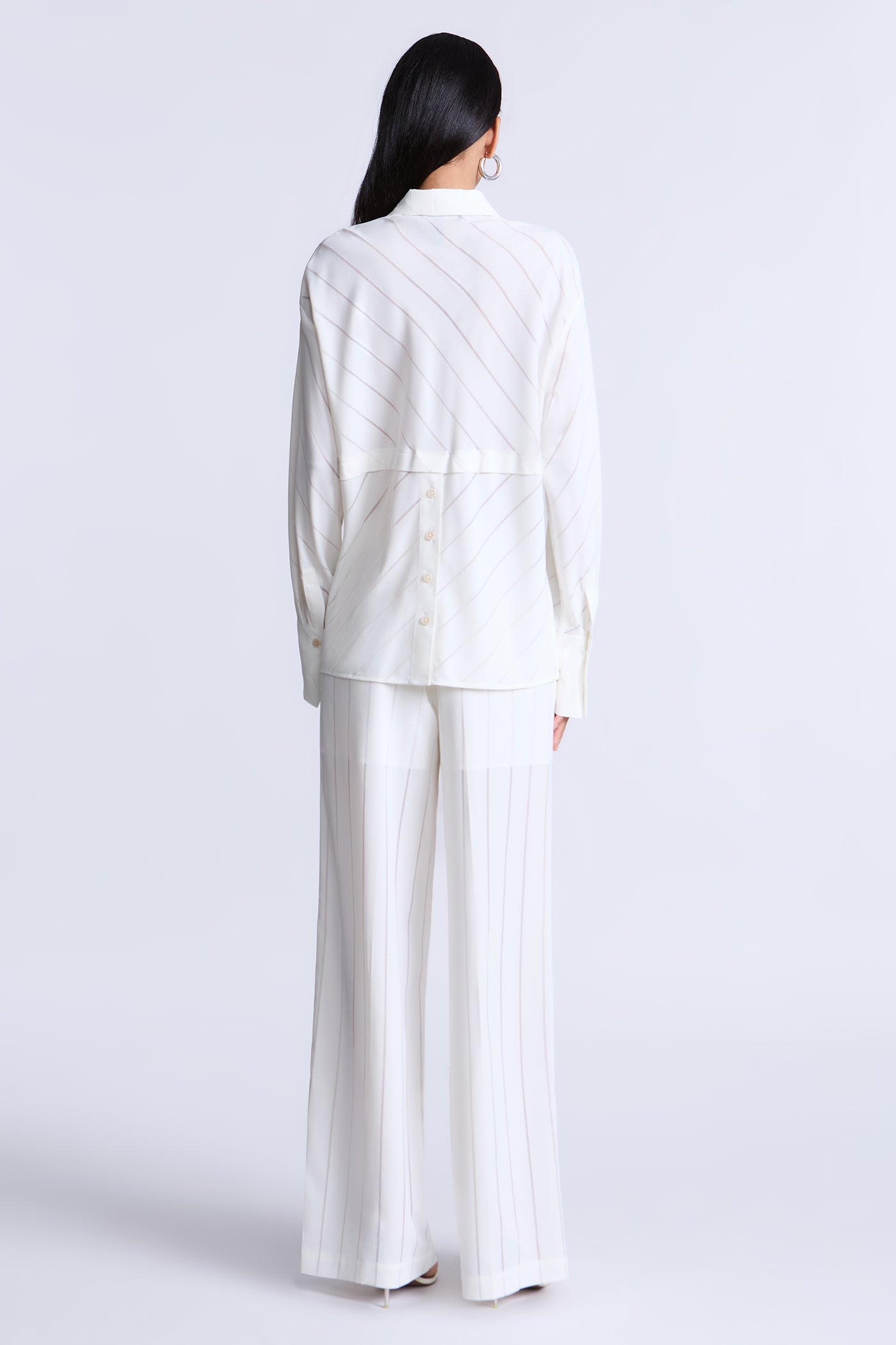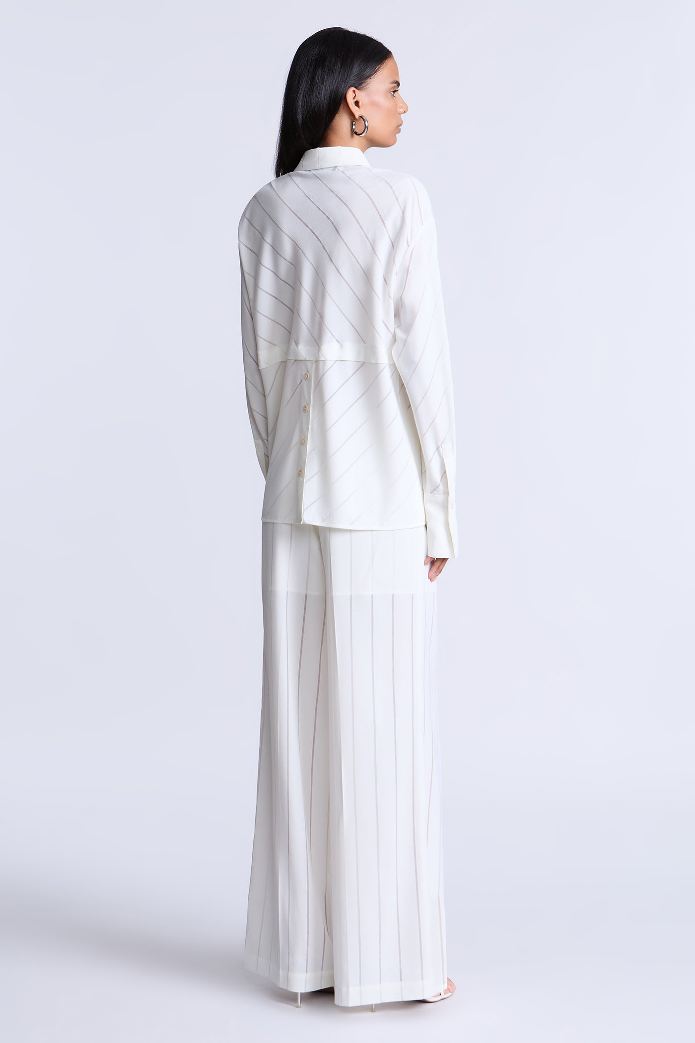 Fluid pinstripe shirt designed with a relaxed drape and subtle diagonal striping that adds quiet movement. The lightweight fabrication softens the structure of the classic button-front, while extended cuffs and a clean collar keep the look sharp. Ideal for workdays or styled loose after hours.