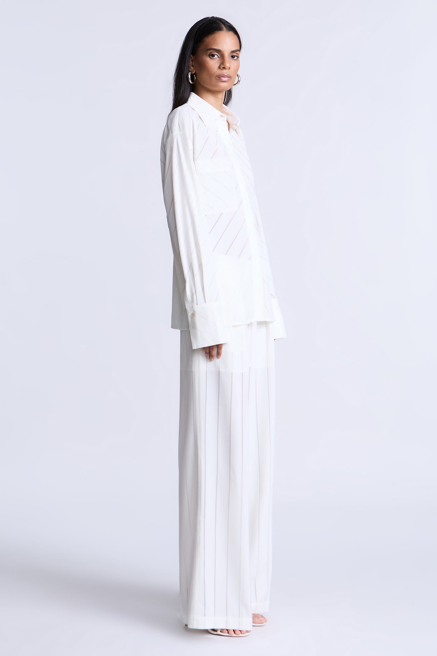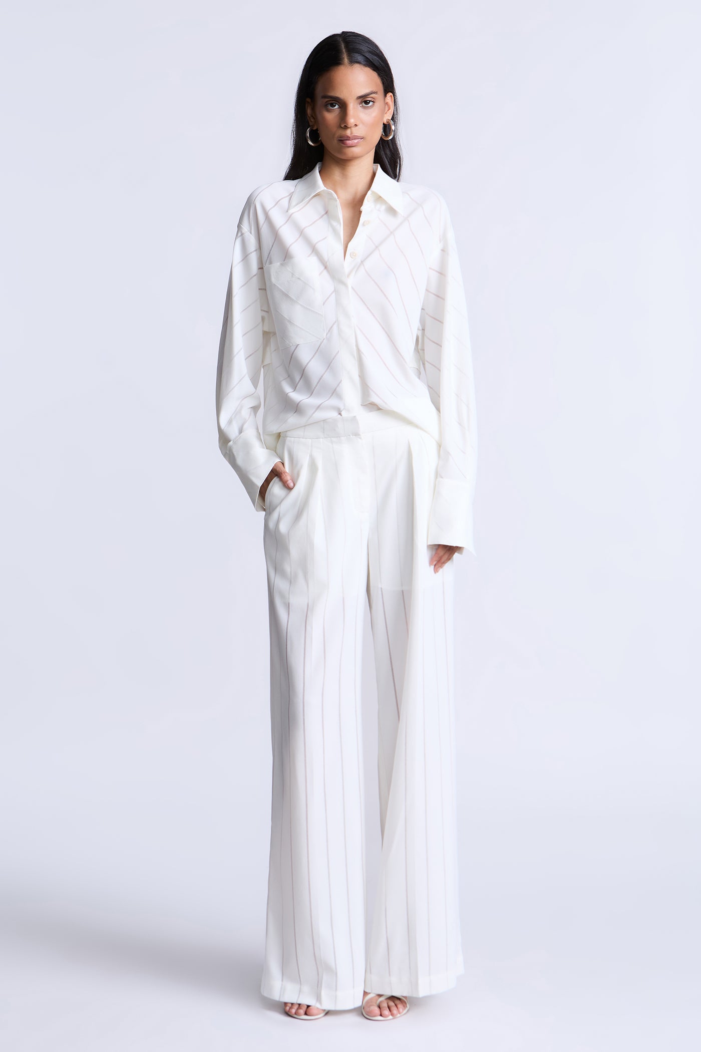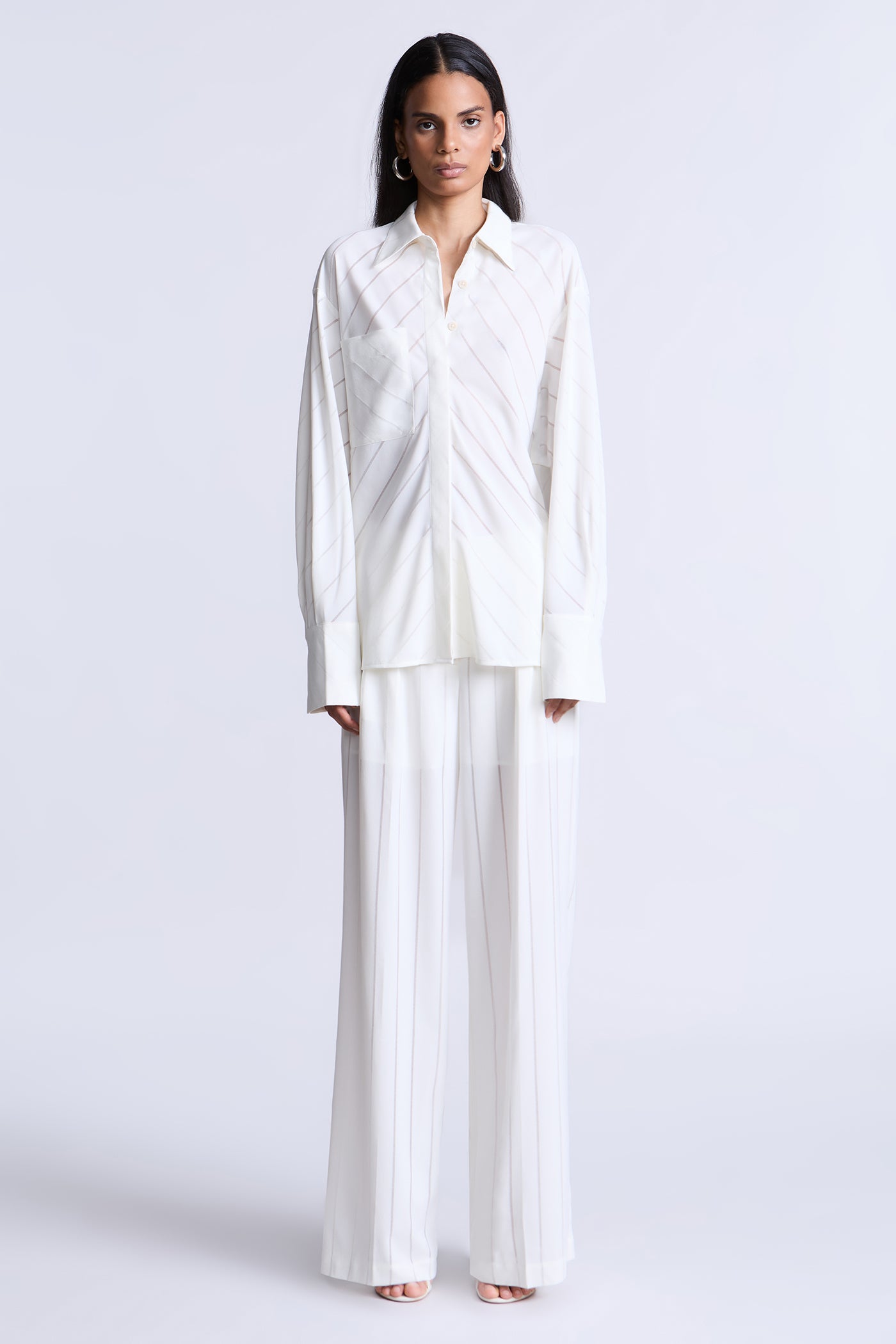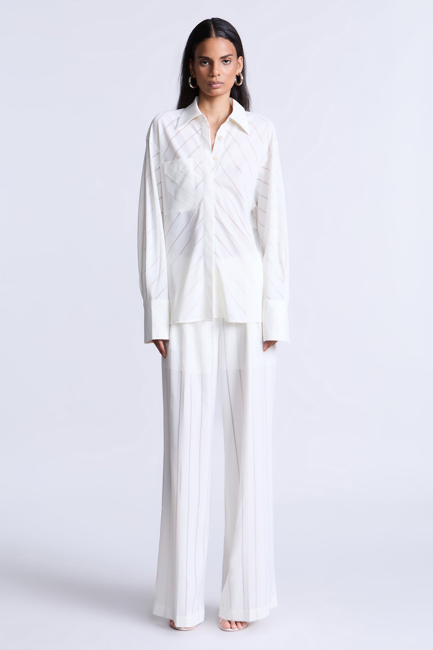 Fluid pinstripe shirt designed with a relaxed drape and subtle diagonal striping that adds quiet movement. The lightweight fabrication softens the structure of the classic button-front, while extended cuffs and a clean collar keep the look sharp. Ideal for workdays or styled loose after hours.