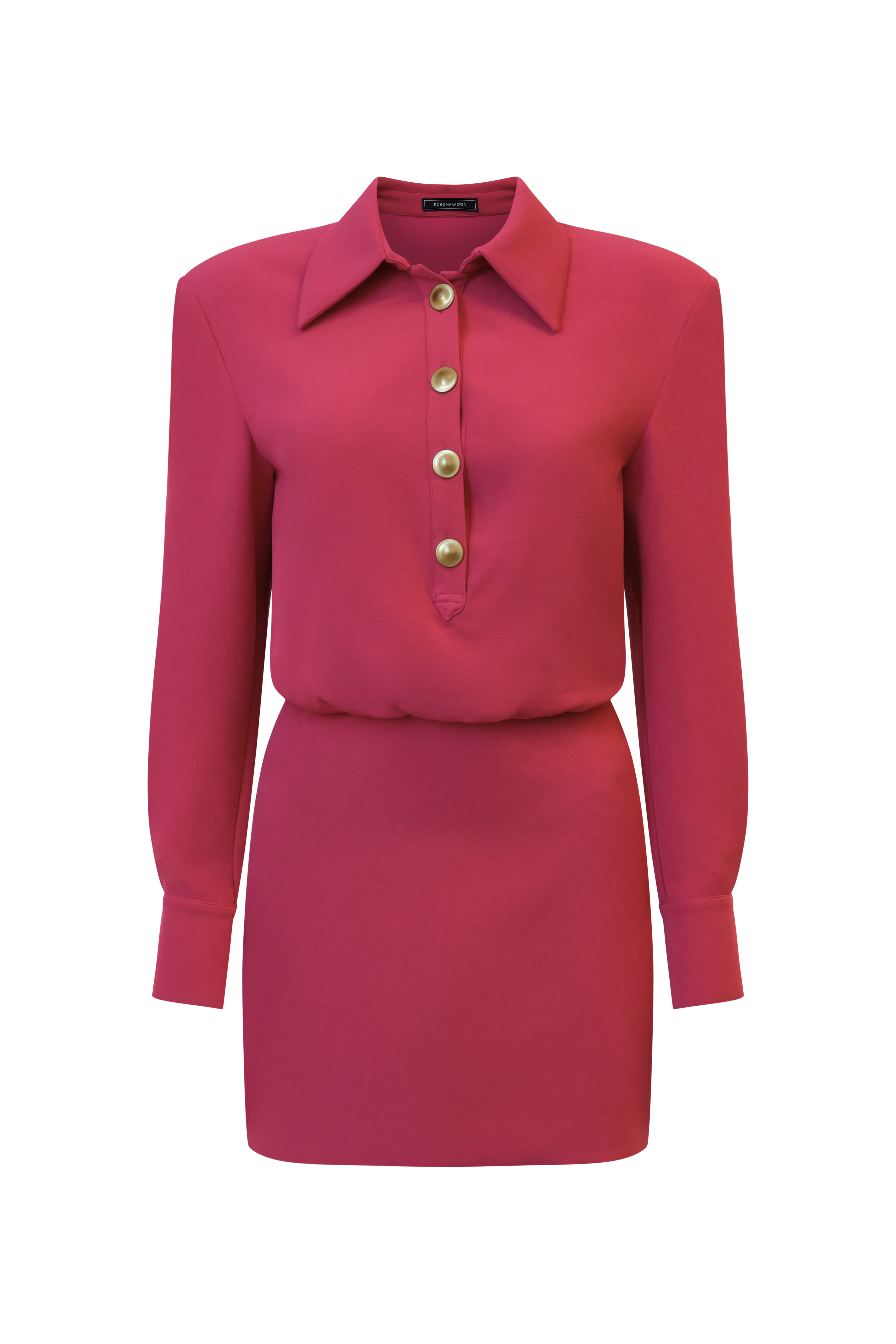 Matte crepe mini dress in a vivid hue with a clean, tailored finish. Features a collared neckline, blouson bodice, and gold-tone buttons down the placket. An easy one-and-done piece for work dinners, drinks, or weekday plans.