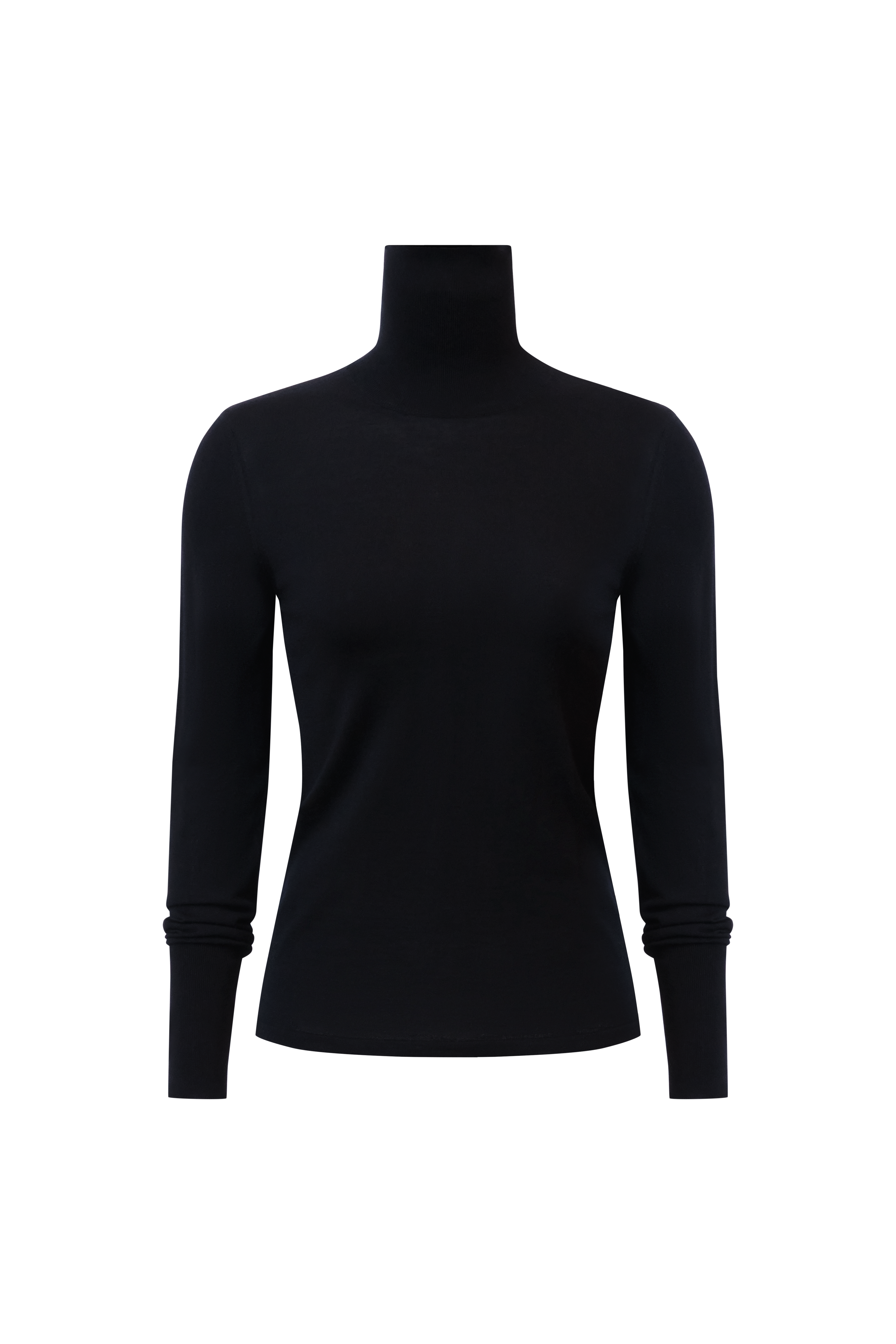 Fine knit turtleneck top made from 100% merino wool. Designed in a close-to-body fit with natural stretch and breathable warmth. An elevated winter essential that tucks smoothly into trousers, skirts, or under suiting.