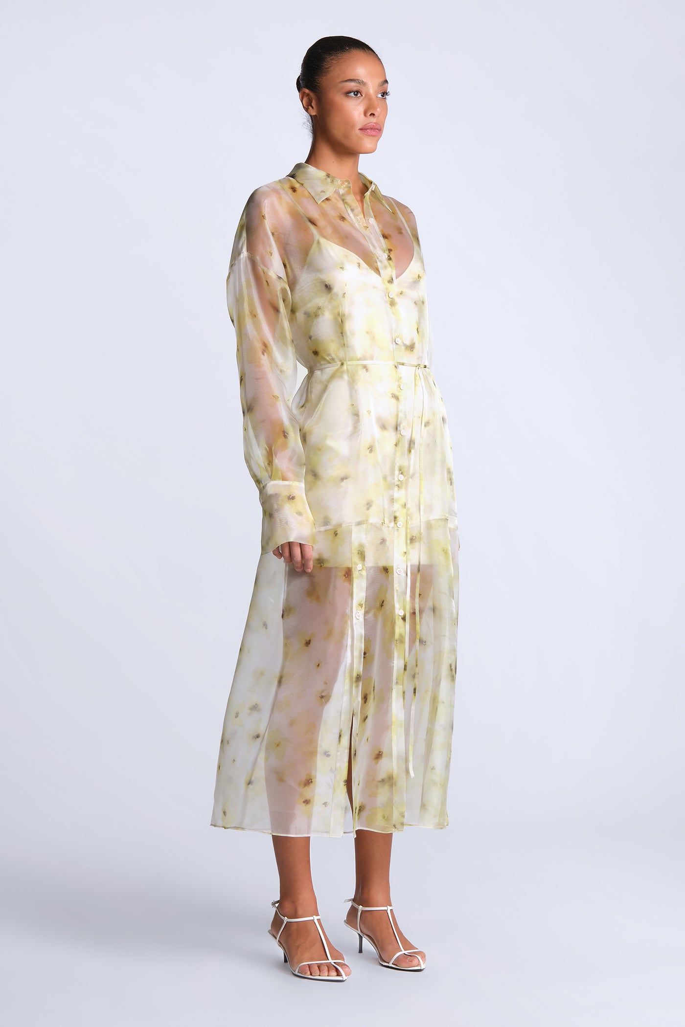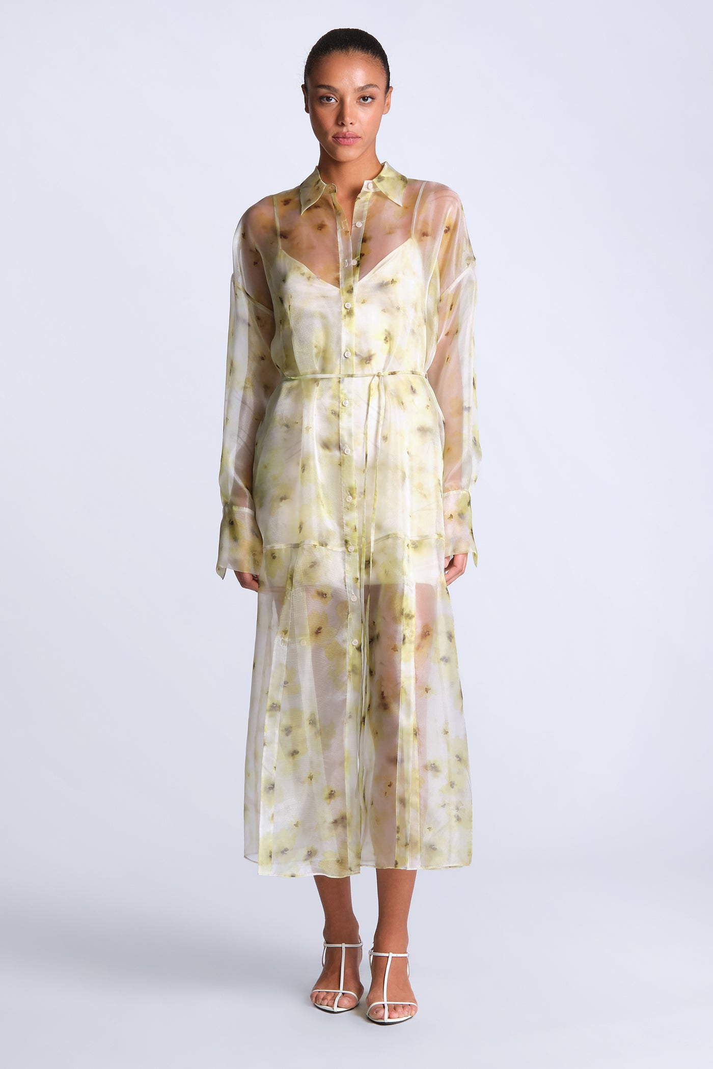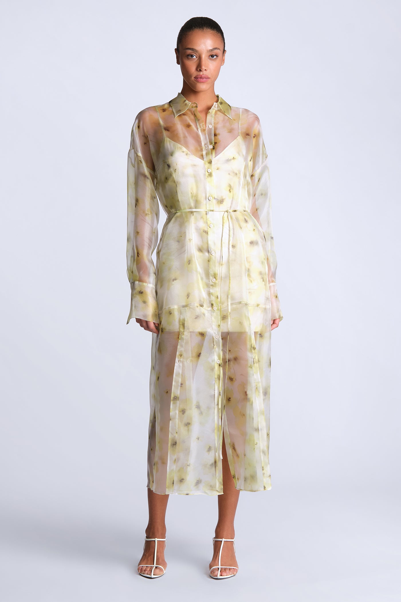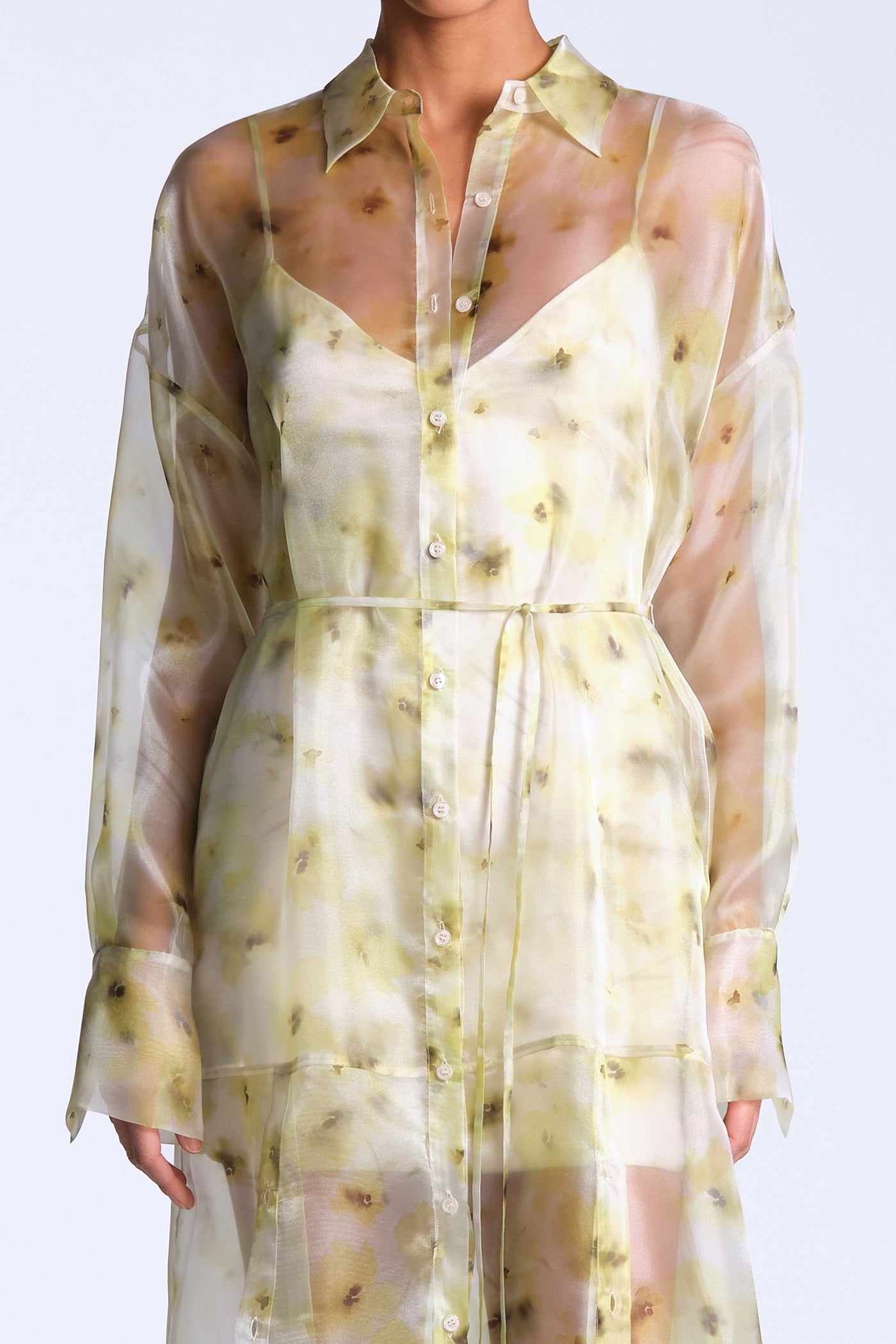 Sheer printed shirt dress in airy organza with a soft, fluid drape. Designed with a button-down front, delicate waist tie, and a hazy, painterly floral motif that layers over the body with subtle dimension. Light and directional—made for gallery afternoons, summer events, or elevated vacation dressing.