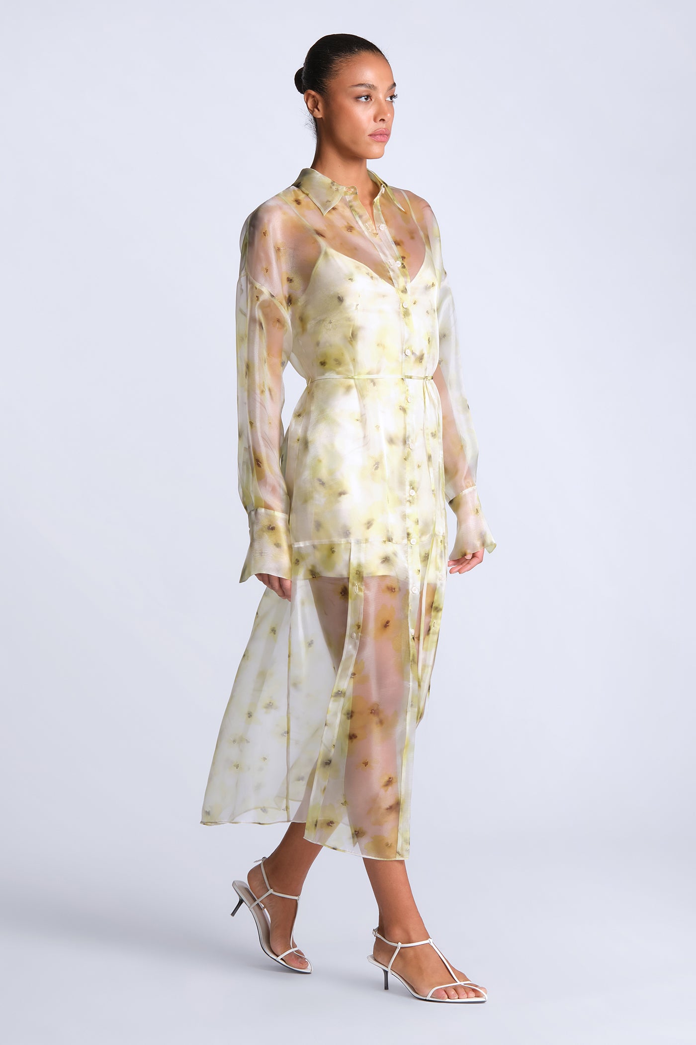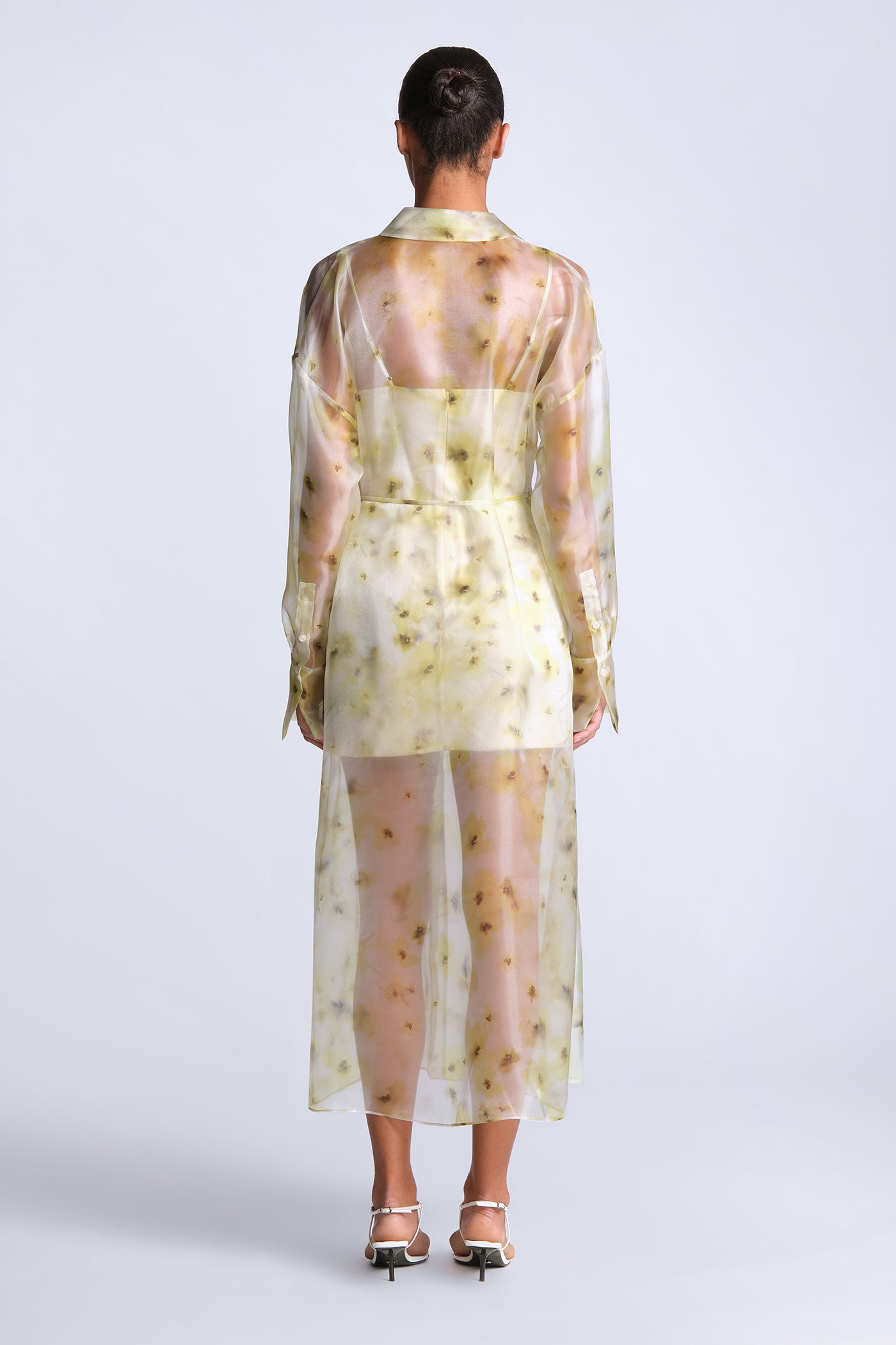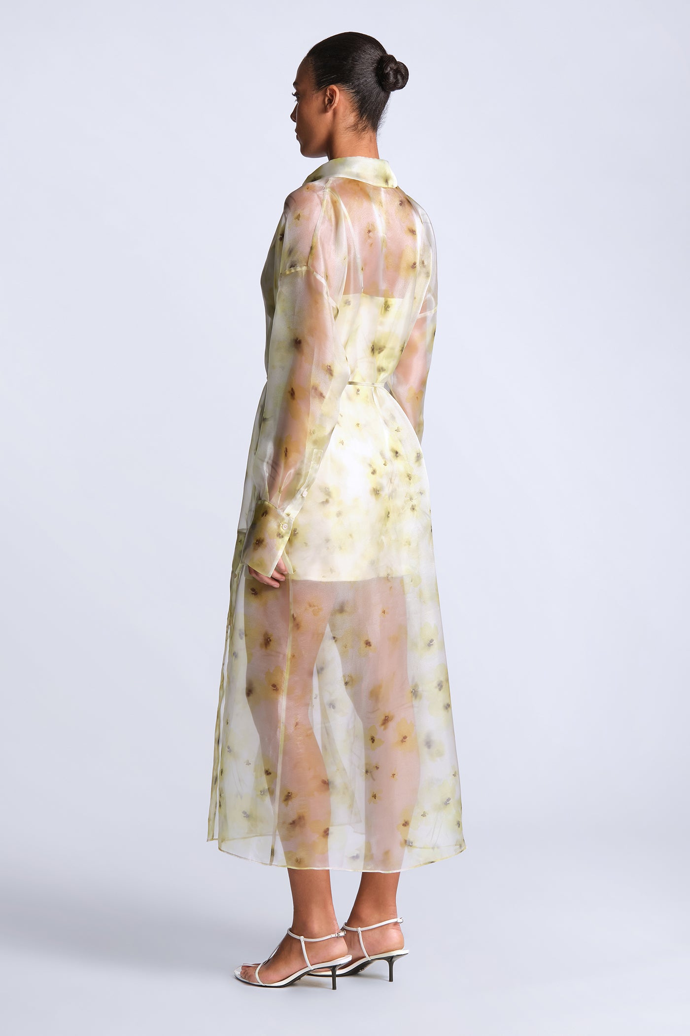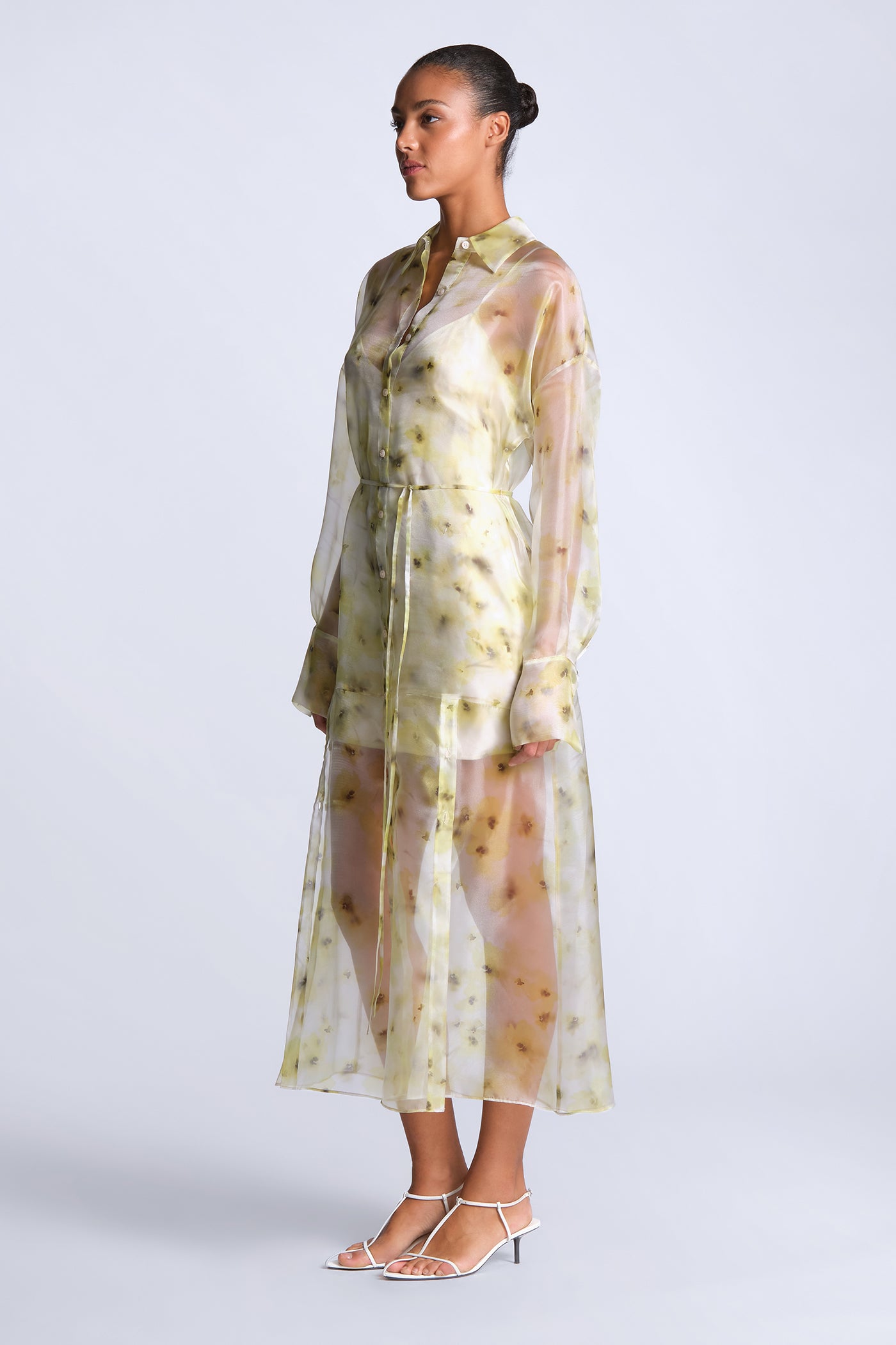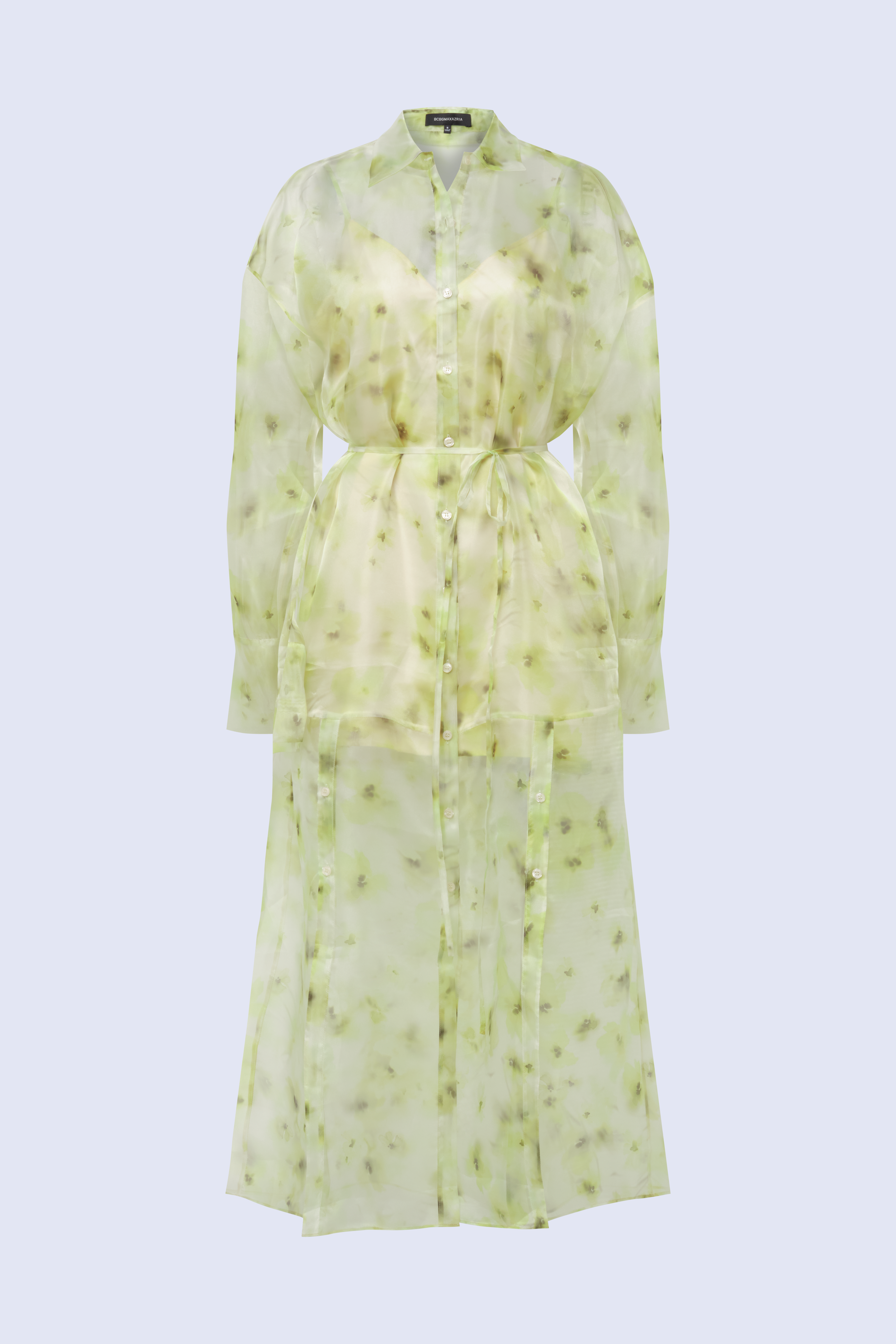 Sheer printed shirt dress in airy organza with a soft, fluid drape. Designed with a button-down front, delicate waist tie, and a hazy, painterly floral motif that layers over the body with subtle dimension. Light and directional—made for gallery afternoons, summer events, or elevated vacation dressing.