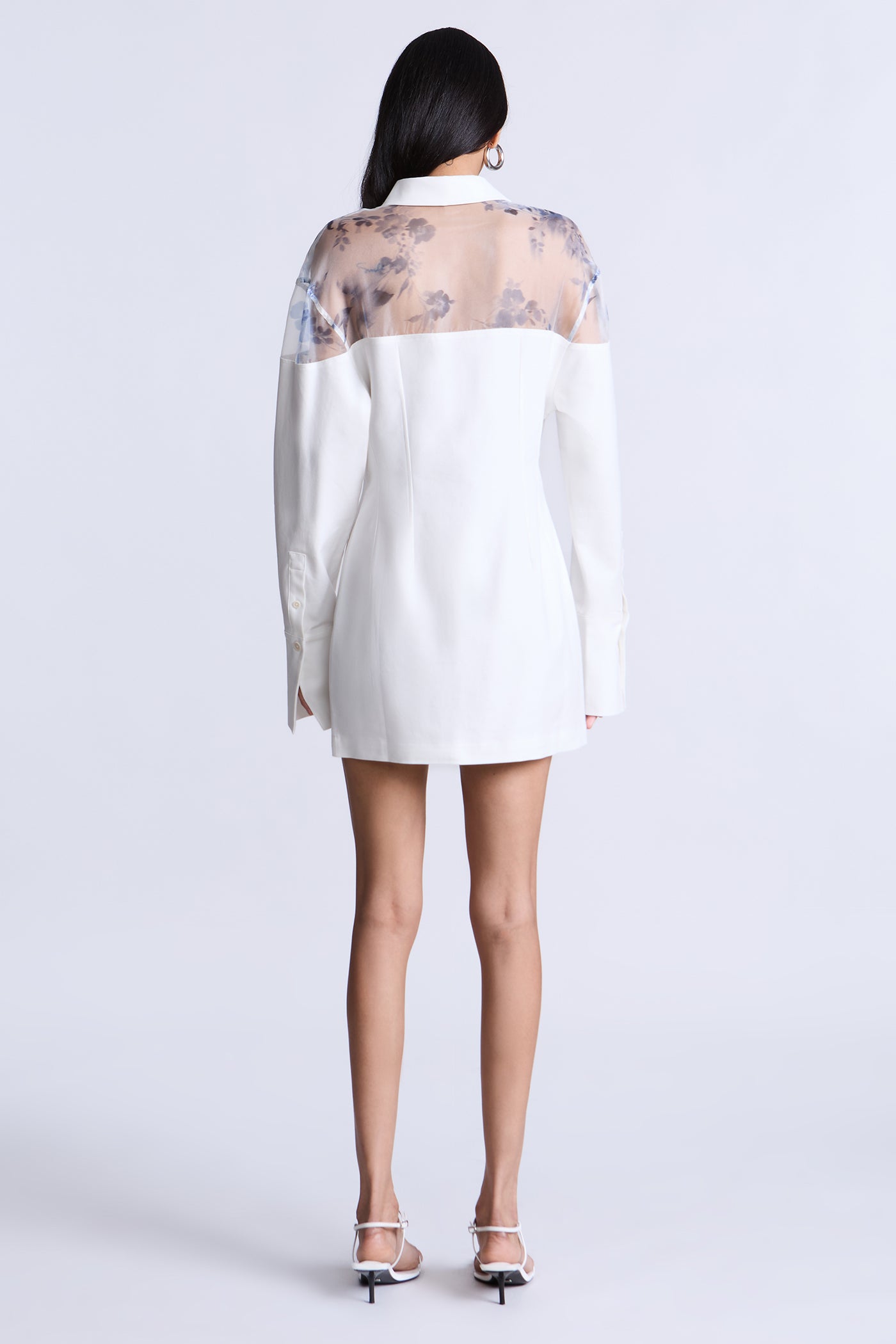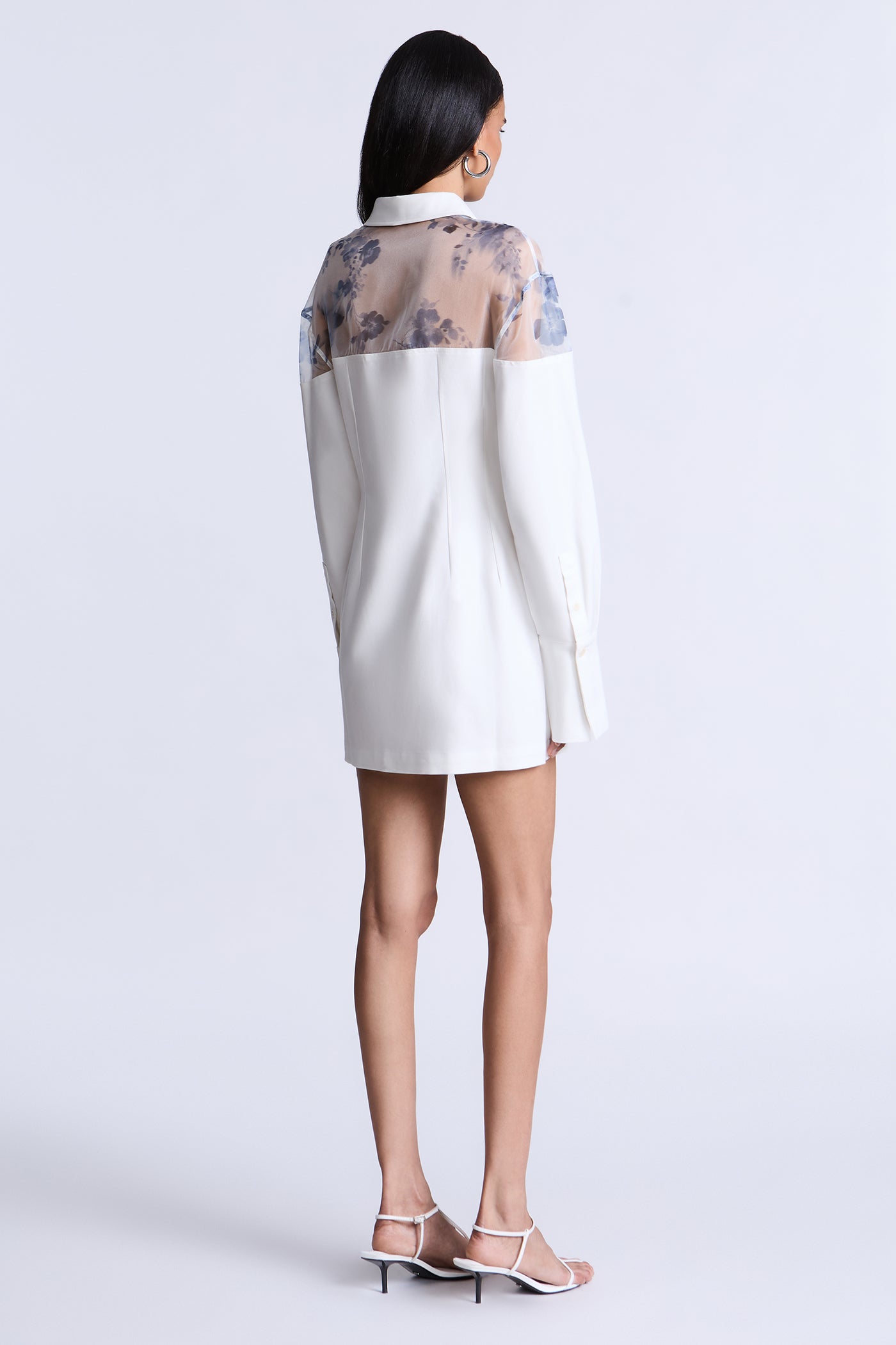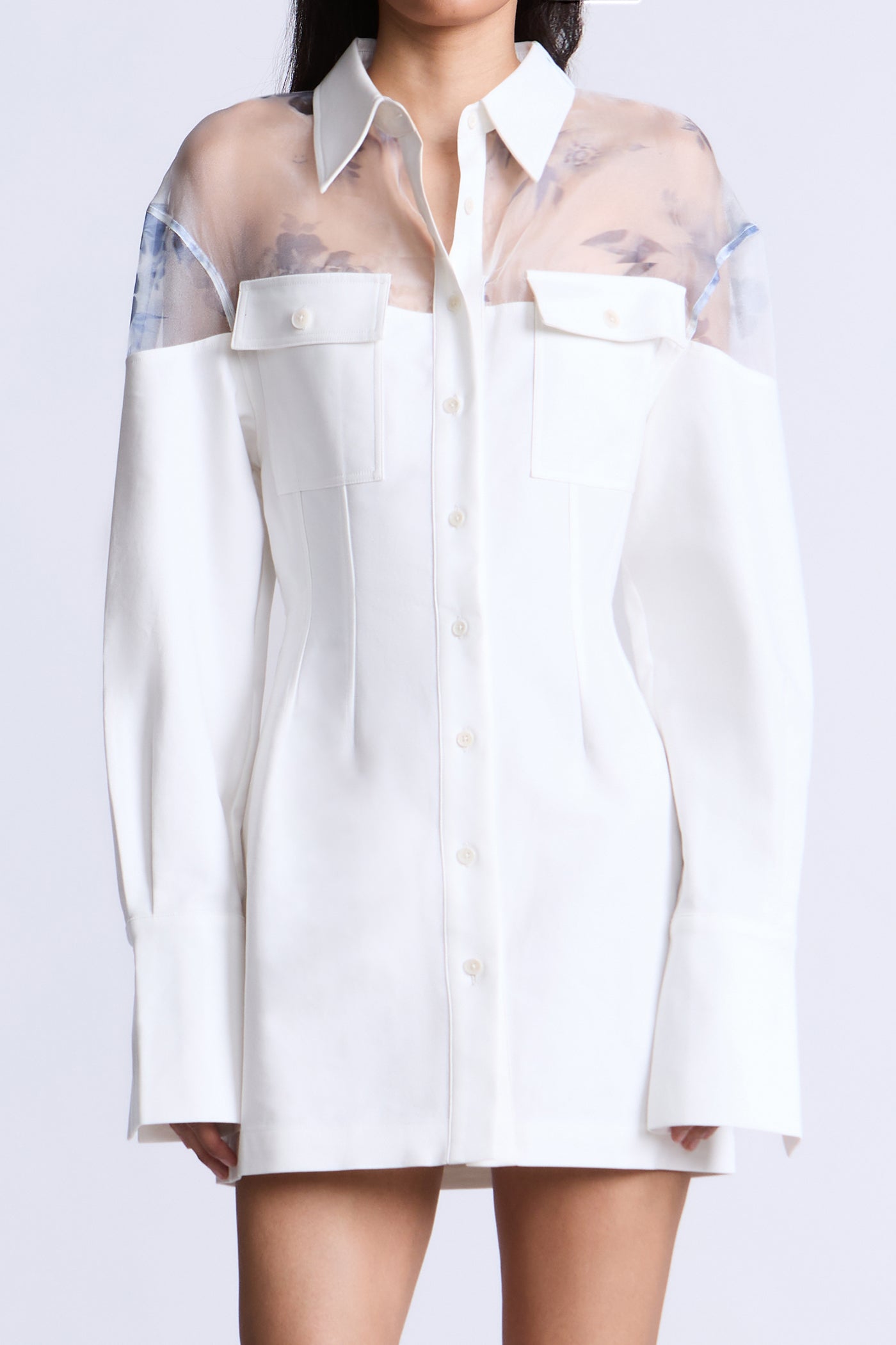 Mixed-media shirt dress that uses sheer contrast to create the illusion of layering. Designed with a crisp woven body and a floral organza yoke that subtly softens the shoulders and sleeves. Finished with a classic collar and button-front closure, moving seamlessly from polished daytime wear to evening styling.